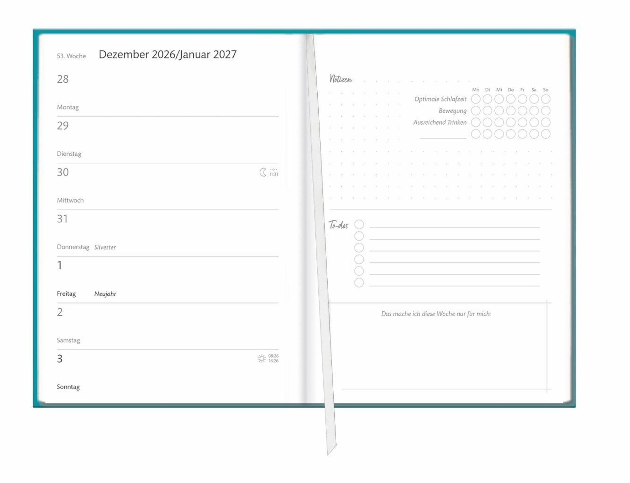 Klein und praktisch: Taschenkalender im DINA6-Format mit einer Doppelseite Platz pro Woche und Lesebändchen