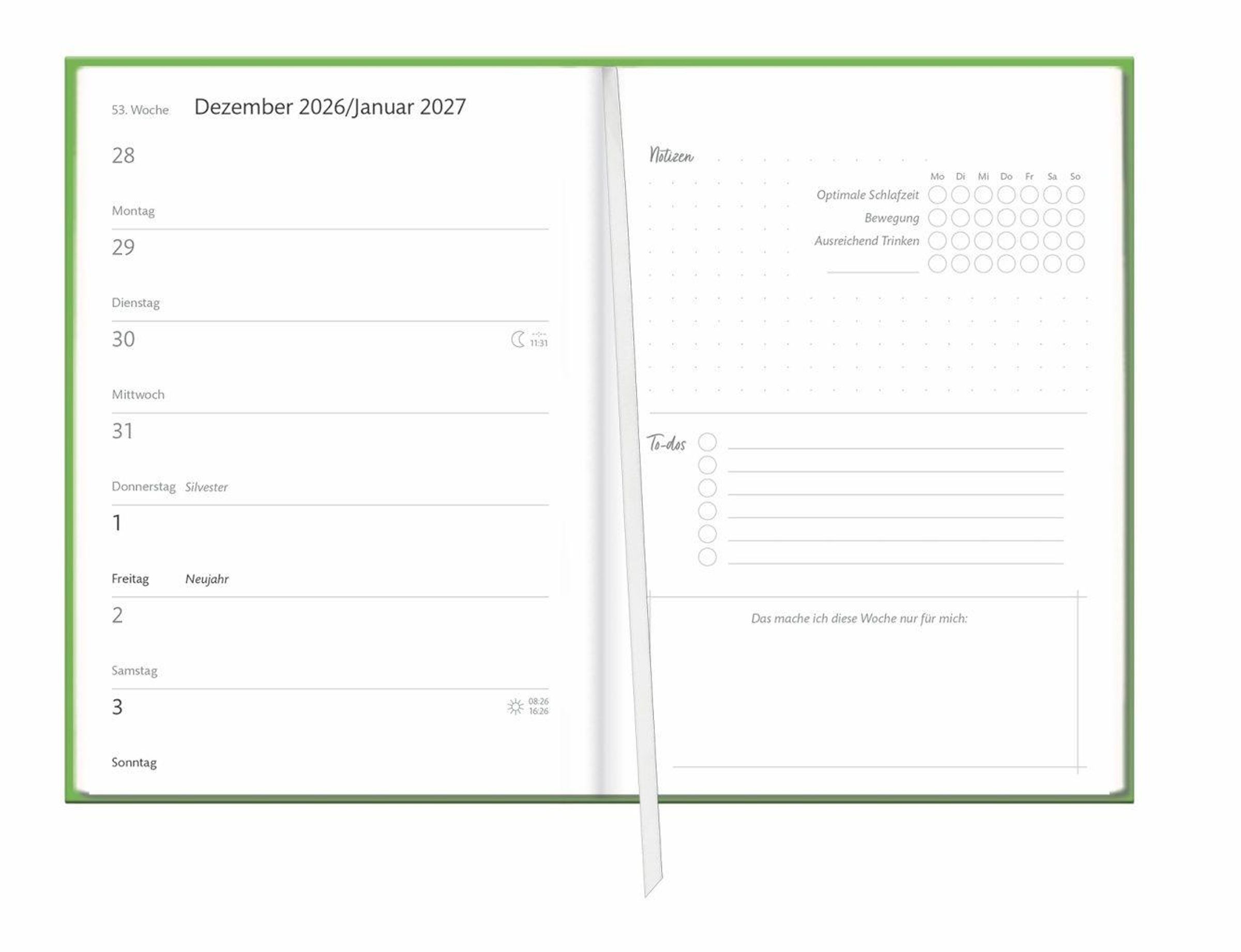Der inspirierende Farbspritzer im Alltag: Organizer in fröhlichem Grün mit angenehmer Haptik und Coverprägung und rundem Rücken