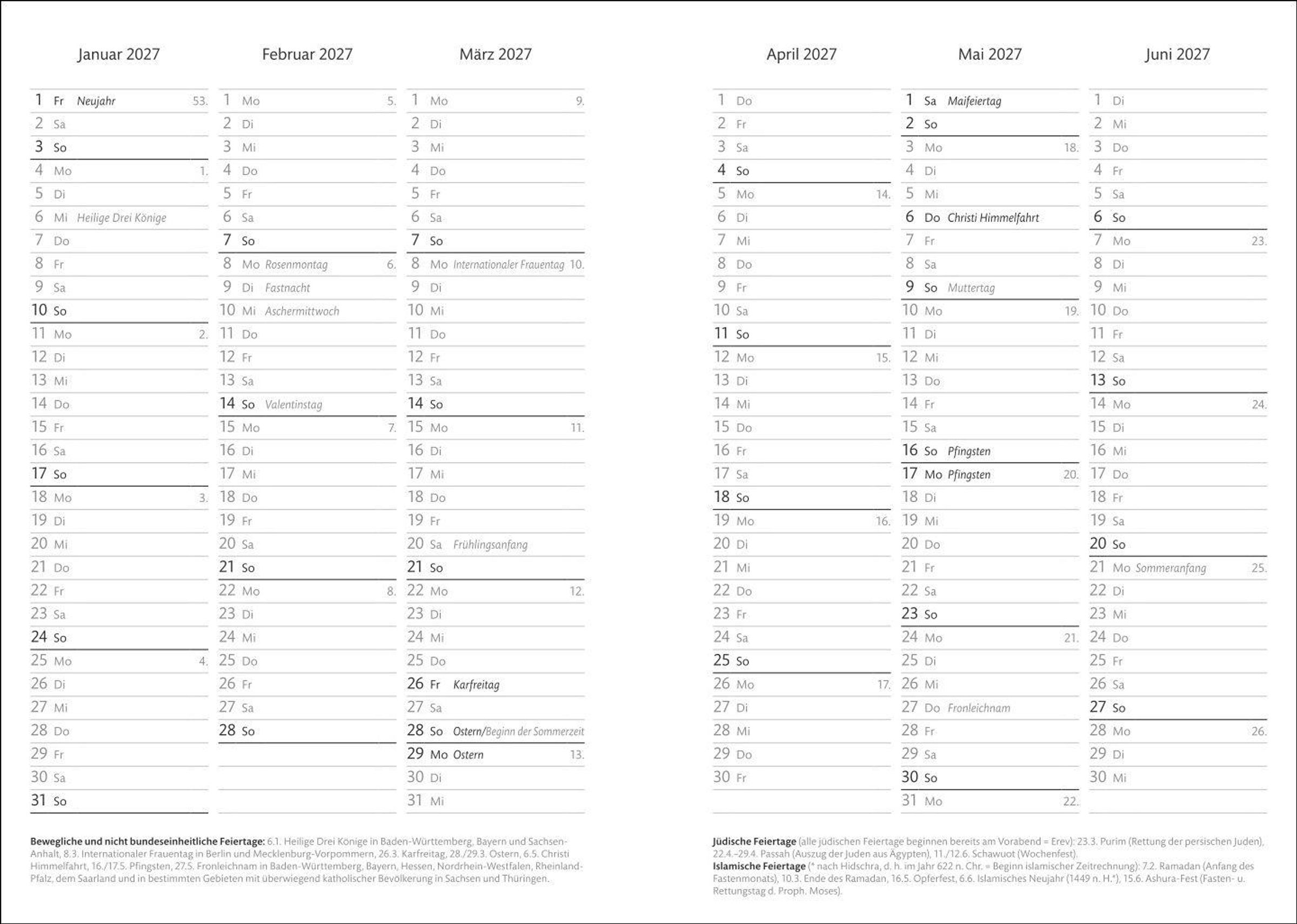 Klein und praktisch: Taschenkalender im DINA6-Format mit einer Doppelseite Platz pro Woche und Lesebändchen