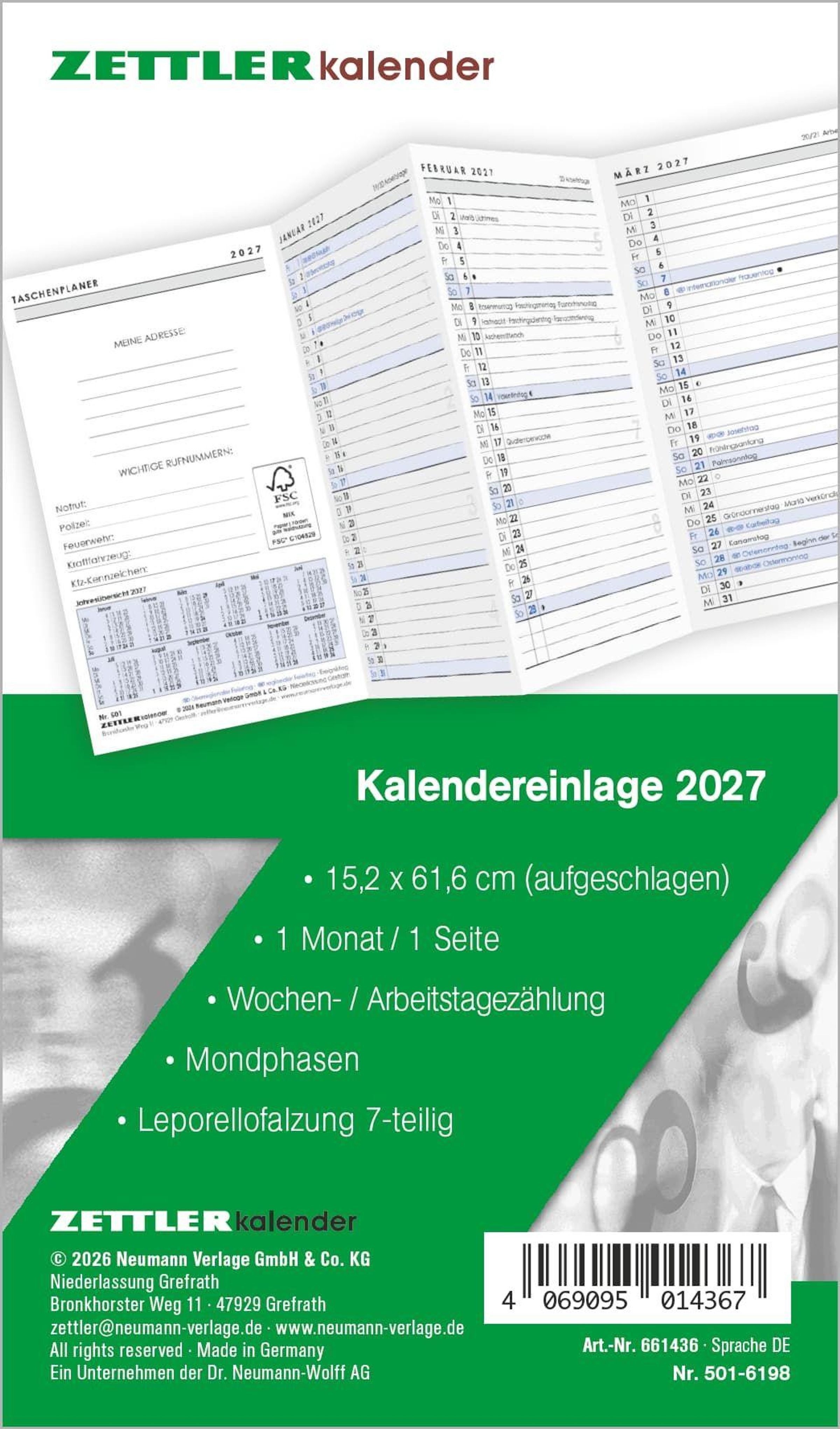Mit der Zettler Kalenderersatzeinlage TP 1M/1S Leporello 2027 rüsten Sie Ihren Taschenplaner schnell und einfach nach -- nachhaltig, praktisch und perfekt für die tägliche Organisation.