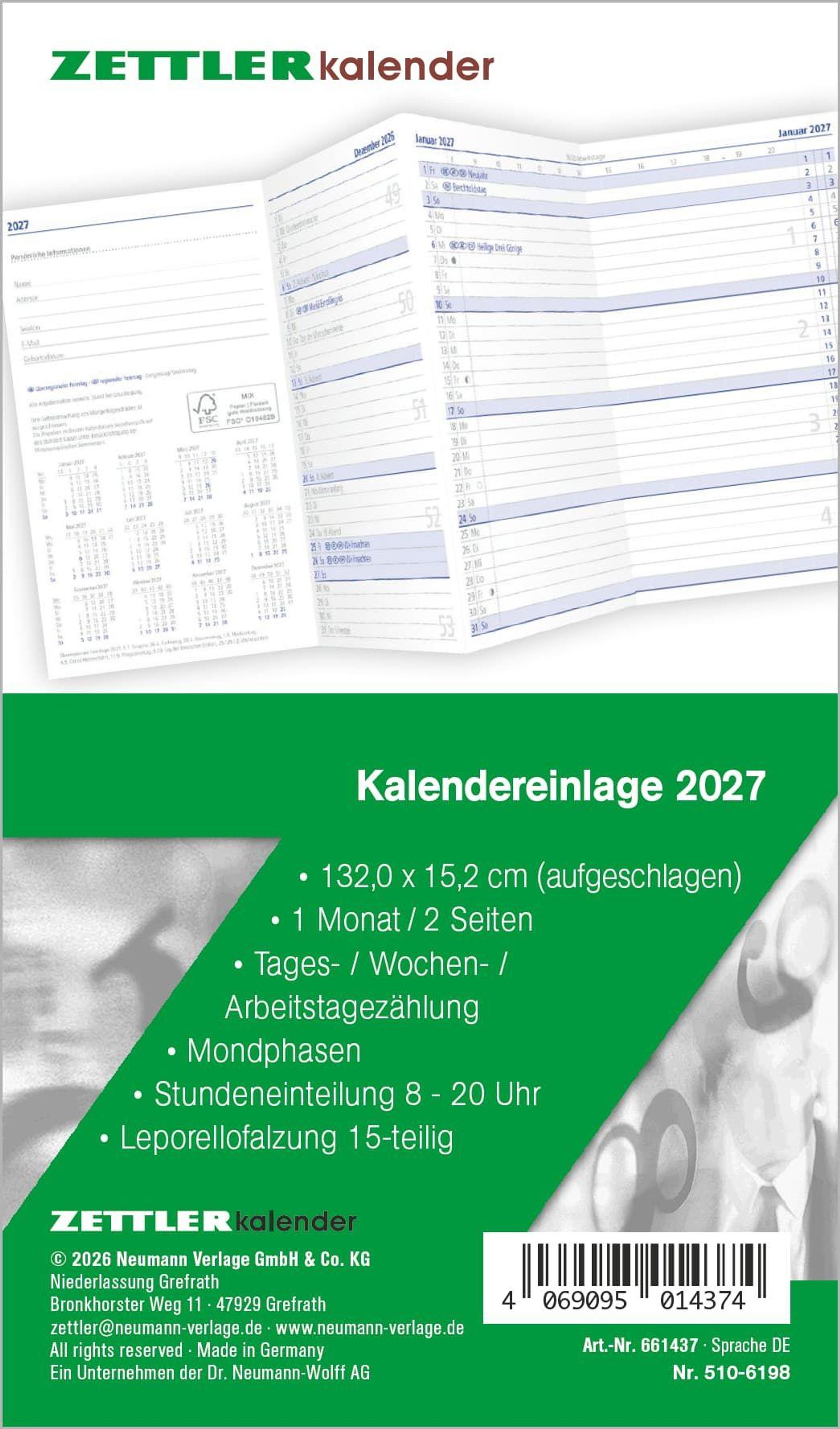 Mit der Zettler Kalenderersatzeinlage TP 1M/2S Leporello 2027 rüsten Sie Ihren Taschenplaner flexibel und nachhaltig nach -- übersichtlich, funktional und ideal für die tägliche Planung.