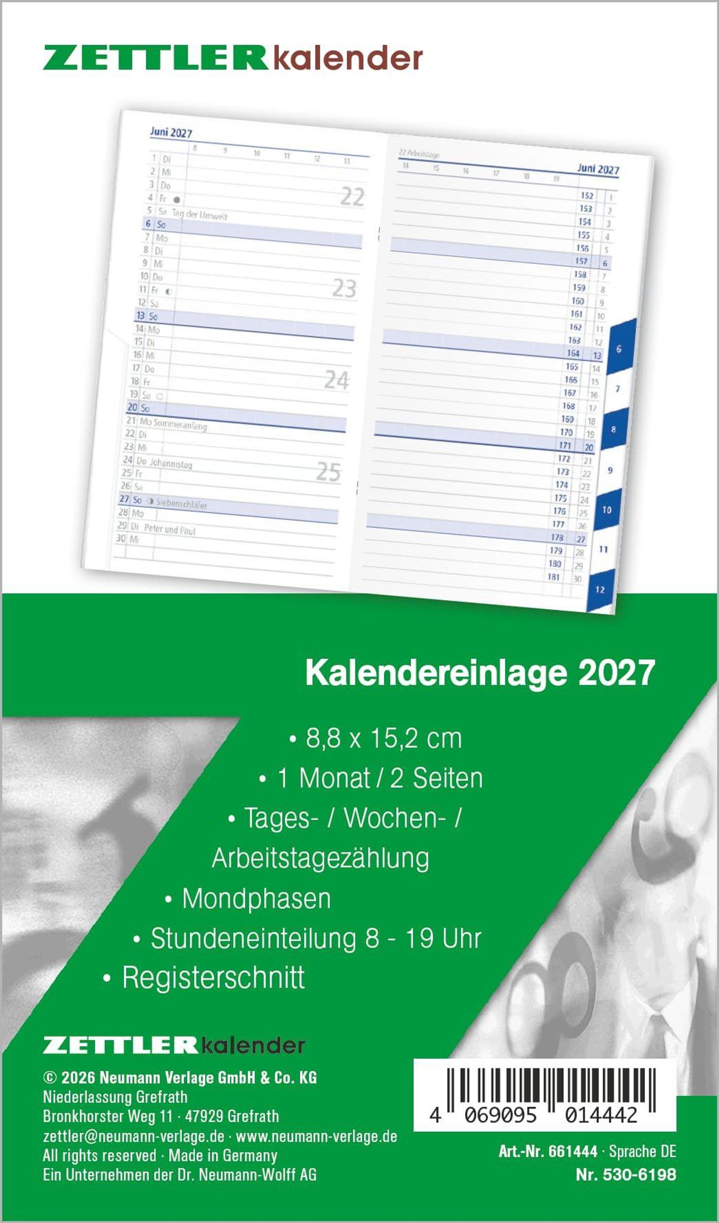Mit der Zettler Kalenderersatzeinlage TP 1M/2S Registerschnitt 2027 nutzen Sie Ihren Taschenplaner nachhaltig weiter -- übersichtlich, kompakt und ideal für die tägliche Organisation.
