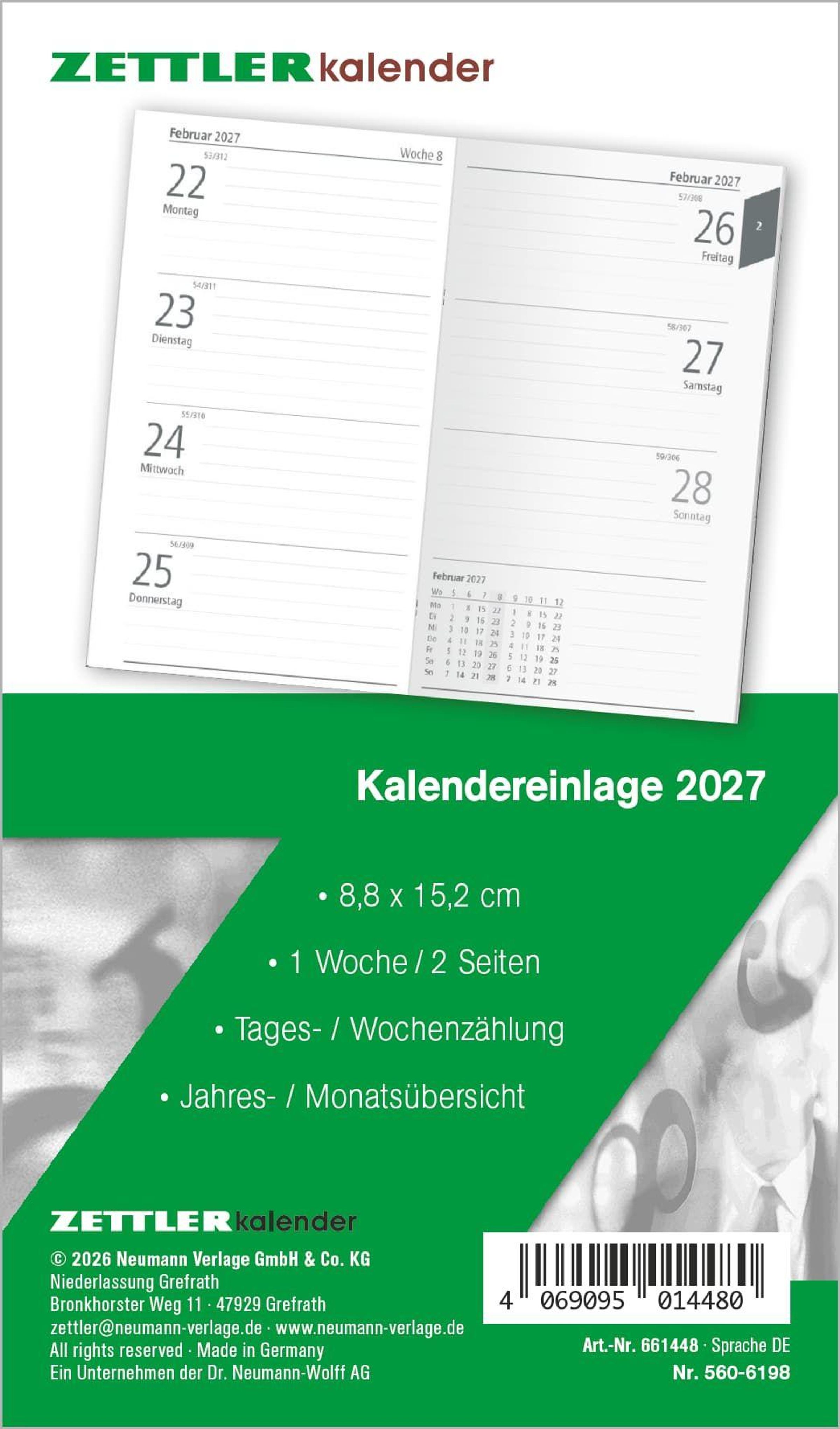 Die Zettler Kalenderersatzeinlage TP 1W/2S 2027 ist das praktische Ersatzkalendarium für Ihren Taschenplaner Typ 560. Mit einer Woche pro Doppelseite und zusätzlichen Informationen behalten Sie stets den Überblick.