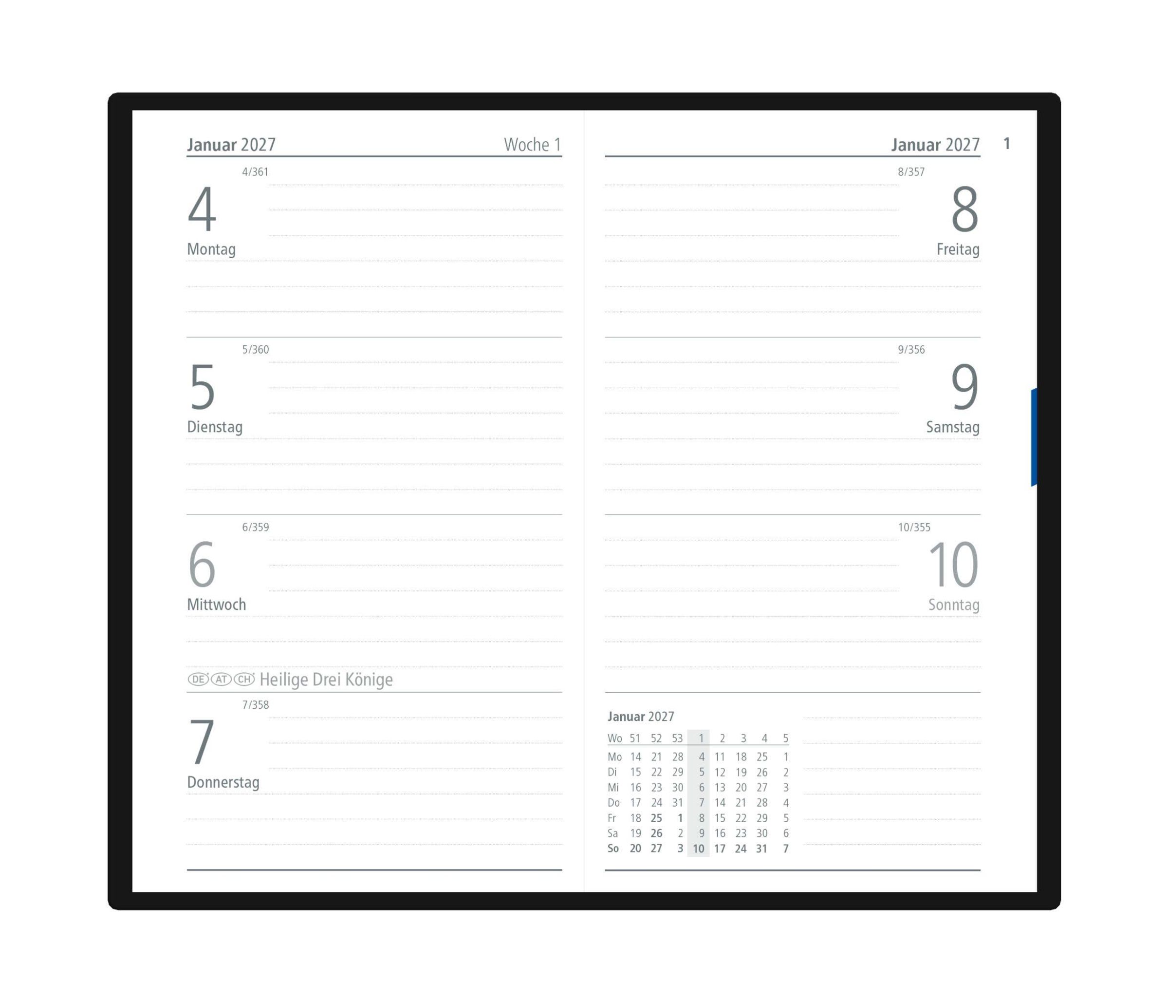 Übersichtliches Kalendarium: 1 Woche auf 2 Seiten, Sonn- und Feiertage hervorgehoben
