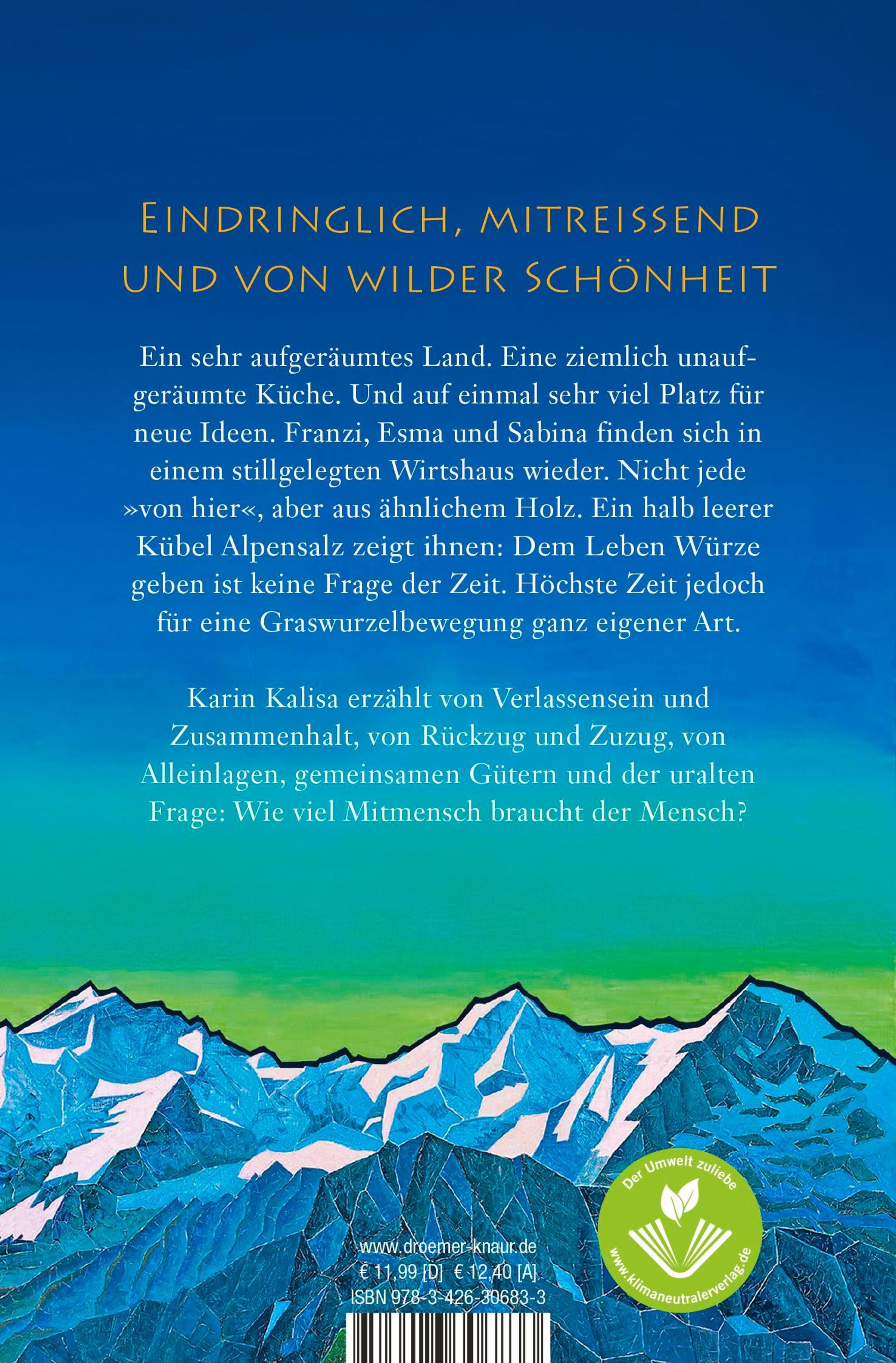 In Karin Kalisas neuem Roman Bergsalz finden sich drei Frauen unterschiedlicher Herkunft in einem stillgelegten Wirtshaus im Allgäu wieder. Franzi, Esma und Sabina sind nicht alle "von hier", aber aus ähnlichem Holz geschnitzt. Ein halb leerer Kübel Alpensalz zeigt ihnen: Dem Leben Würze zu geben ist keine Frage der Zeit, sondern der Einstellung.