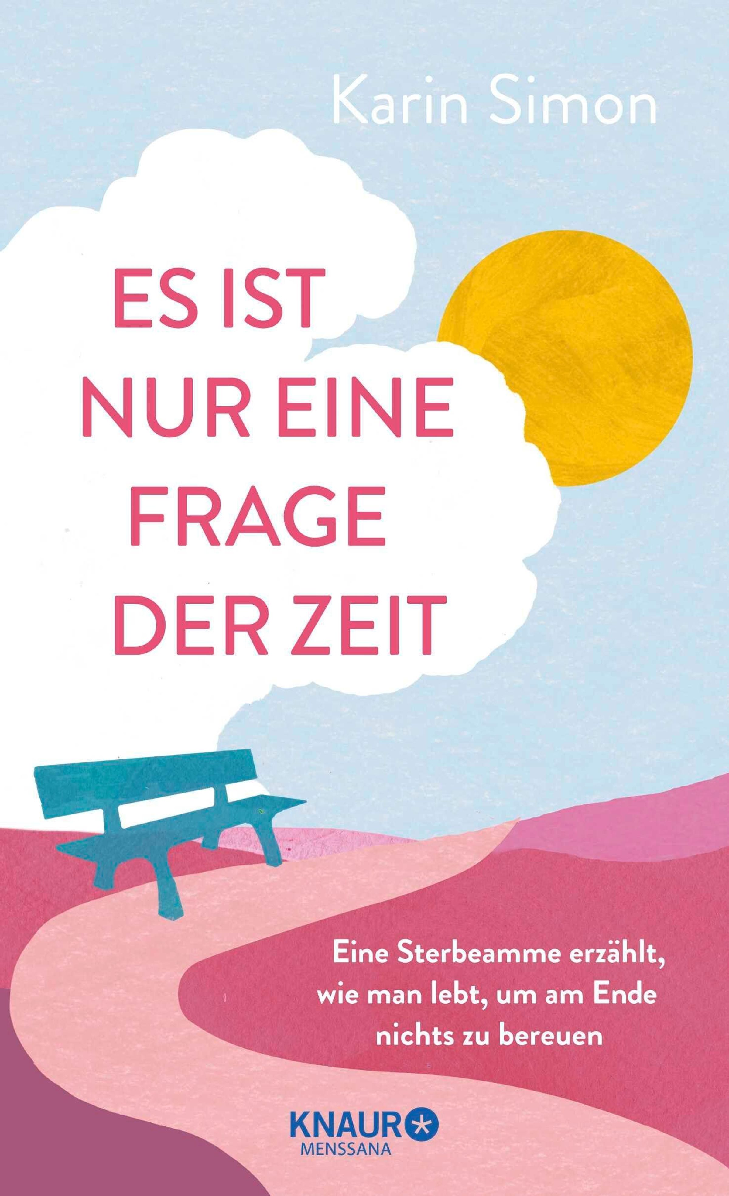 Titel: "Es ist nur eine Frage der Zeit". Autor: "Karin Simon". Untertitel über das Leben. Illustration: Bank, Weg, Sonne, Wolken., Buch