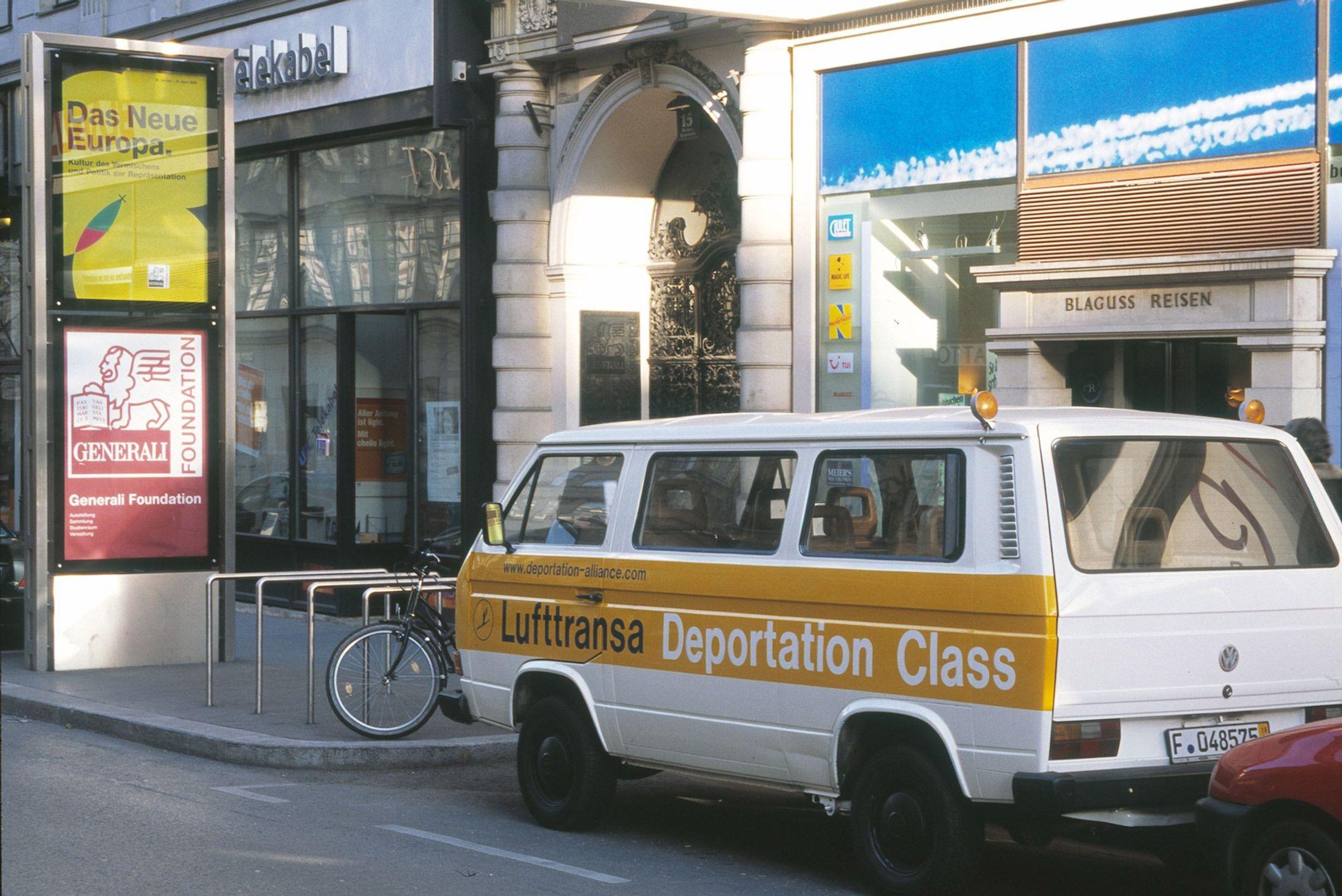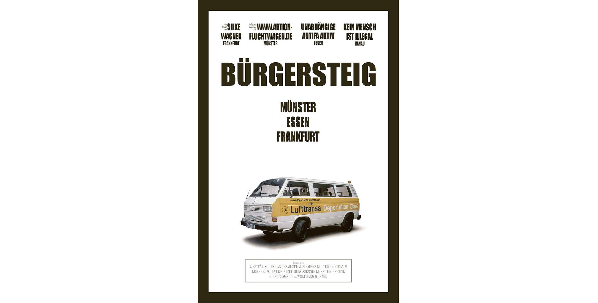 Zwischen 2001 und 2002 war in verschiedenen deutschen Städten ein VW-Bus mit der Aufschrift "Lufthansa Deportation Class" zu sehen. Es handelte sich um die provokante Aktion bürgersteig von Silke Wagner (geb. 1968, lebt in Frankfurt) über die Bereitstellung von Lufthansa-Flugzeugen für Deportationszwecke. Der Bus löste heftige Diskussionen aus und wurde zum Vehikel von Aktivist: innenvernetzung und Kommunikation zwischen Bürger: innen. Das partizipative Kunstprojekt war seinerzeit wegweisend in seiner Zusammenarbeit mit zivilgesellschaftlichen Initiativen. Im Cahier 002 wird bürgersteig erstmals vollständig dokumentiert, in dem die Publikation die Quellen für die Aktion sowie Material zu den juristischen Konflikten offenlegt, die dem Projekt folgten.
