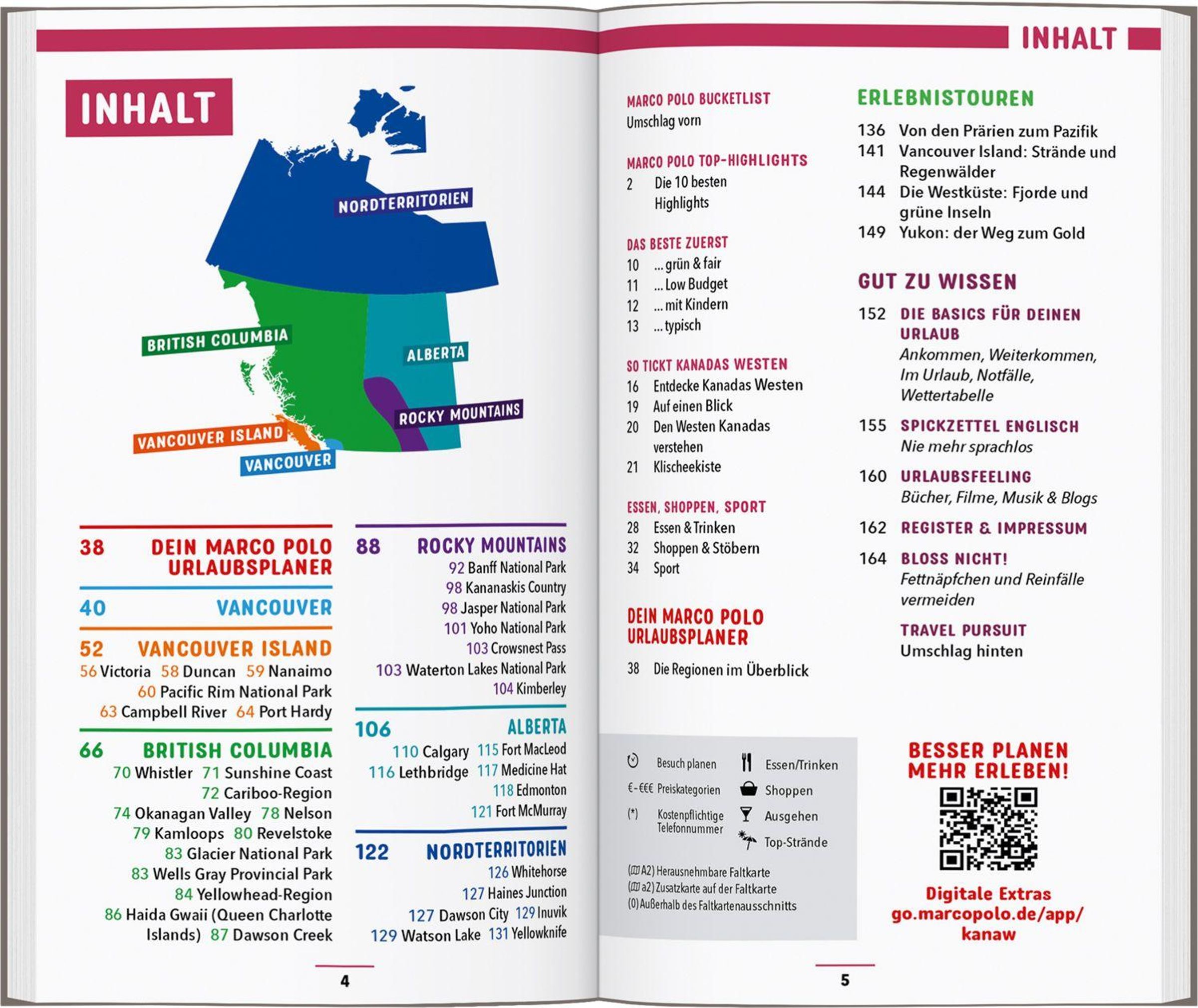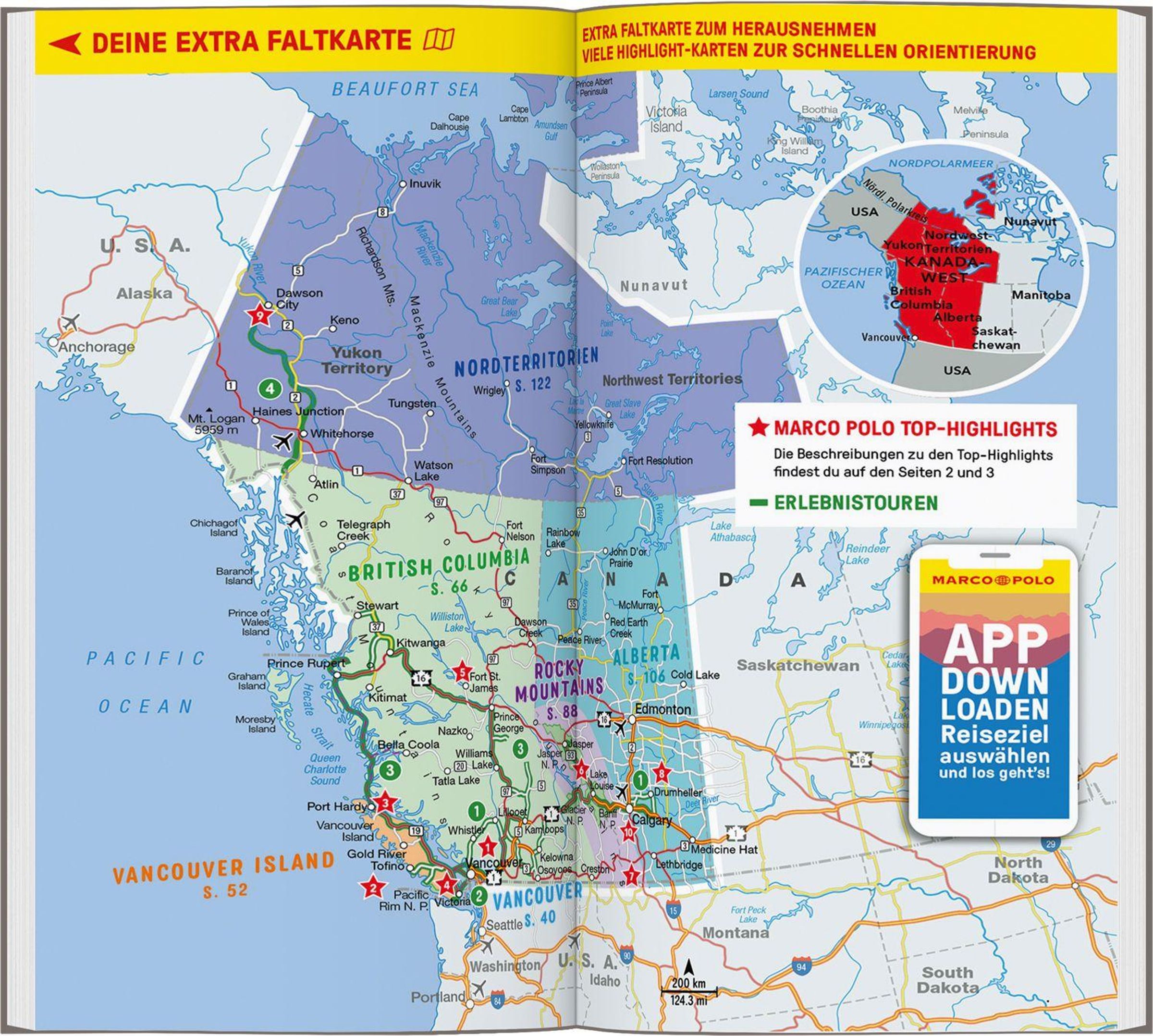 Mit dem MARCO POLO Reiseführer hast du alle Regionen in Kanadas Westen im Überblick: Rund um Vancouver und Vancouver Island, über British Columbia bis in die Nordterritorien, von den Rocky Mountains bis nach Alberta. Einmal vor Ort verpasst du mit den MARCO POLO Erlebnistouren keine der Besonderheiten der Region!