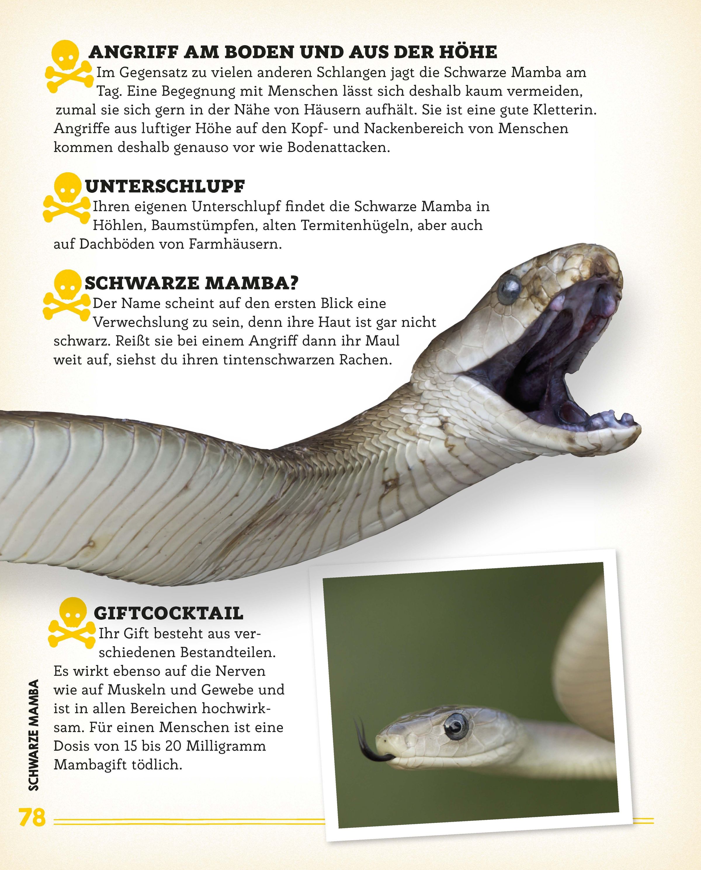 - Sensationelle Fotos: Auf zum Teil ganzseitigen Fotos wirken diese besonderen Tiere noch imposanter. Die erstaunlichen Tierfakten gibt's auf einen Blick und lassen Kinder in die spannende Welt der gefährlichsten Tiere abtauchen.