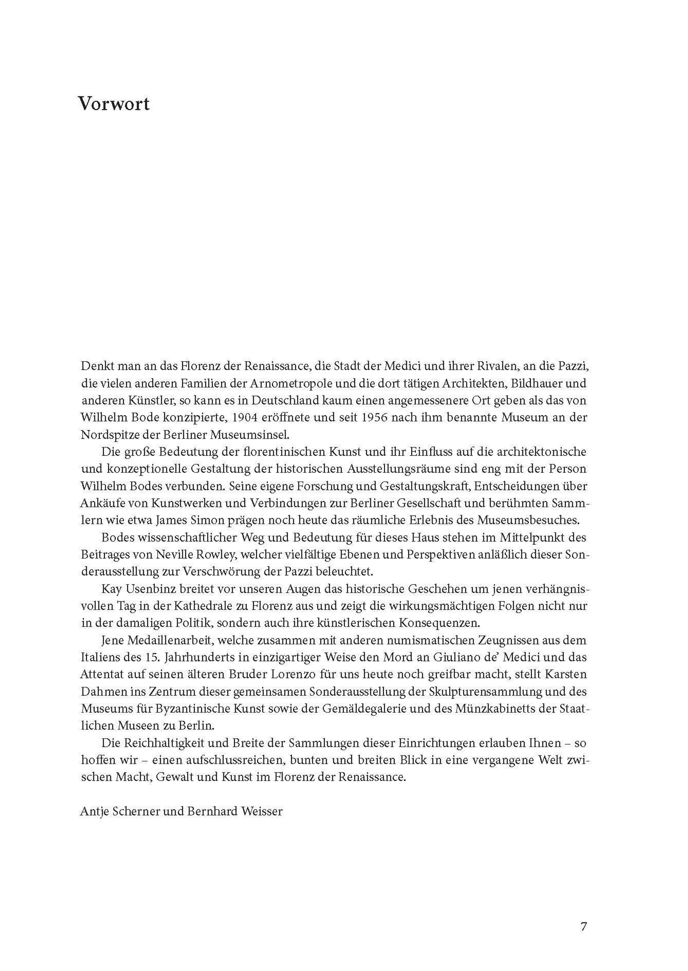 Am 26. April 1478 wurden Lorenzo und Giuliano de' Medici in der Kathedrale von Florenz überfallen. Anders als Giuliano überlebte Lorenzo und bestrafte anschließend die Drahtzieher, allen voran die Familie Pazzi. Die Staatlichen Museen zu Berlin sind eine der wenigen Museumsinstitutionen, die zwei Exemplare der Medaille besitzt, welche der Florentiner Bildhauer Bertoldo di Giovanni in Lorenzos Auftrag auf die "Pazzi-Verschwörung" fertigte. Drei Aufsatzbeiträge widmen sich dem historischen Geschehen, den uns heute überlieferten Kunstwerken und der Bedeutung von Florenz, den Medici und Wilhelm Bode für die Konzeption des heute nach ihm benannten Museums. Zusammen mit Einführungstexten werden sämtliche ausgestellte Objekte in einem Katalogteil präsentiert.