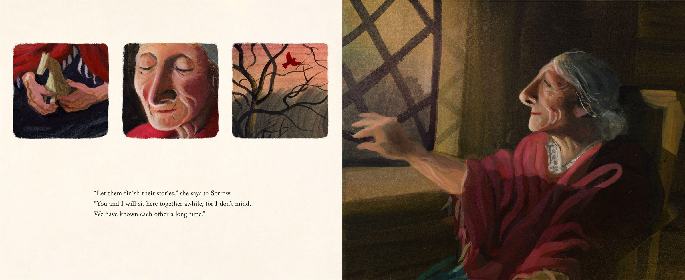 Rebecca grows older and older, until one day, Sorrow pays her a visit. But there is no fear, for Sorrow is now an old friend. So they sit together as the sun sets and watch the fireplace flames flicker down to the last ember.