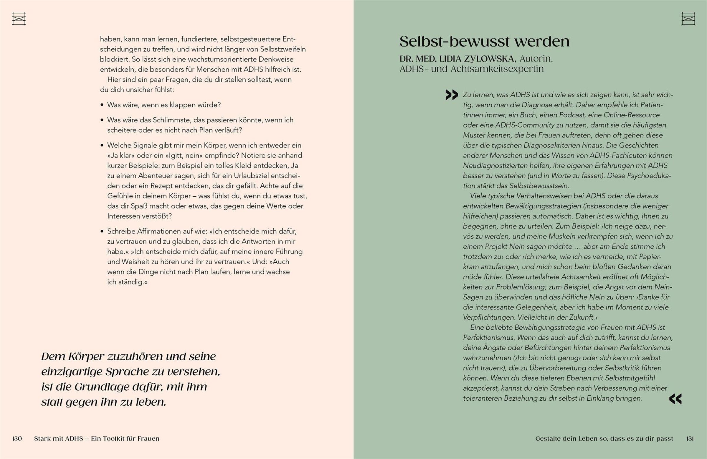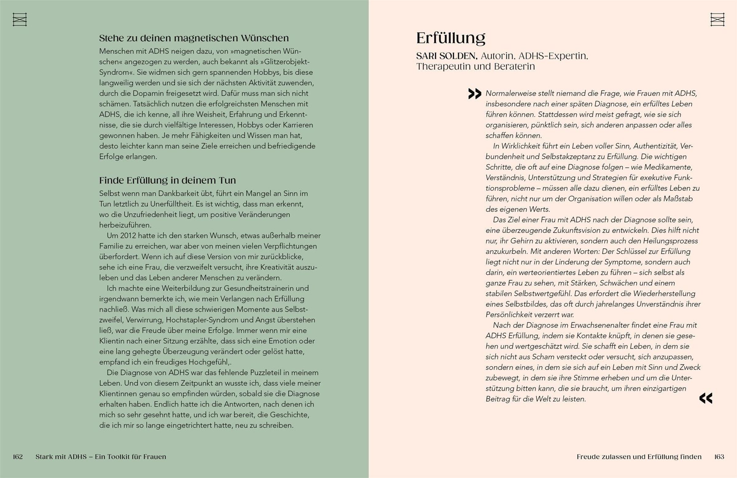Dieser innovative Ratgeber ist ein einfühlsamer Begleiter für Frauen mit ADHS . Er beleuchtet die Auswirkungen von Hormonschwankungen bei Frauen mit ADHS und bietet wirksame Strategien zur Bewältigung der Symptome. Ob Atemübungen , Schlafqualität verbessern oder die japanische Ikigai-Methode : Hier findest du ein praktisches Toolkit mit effektiven Übungen für ein erfülltes Leben. Leicht verständliche Fachbeiträge von renommierten Ärzt*innen und Psycholog*innen, sowie die Erfahrungen der Autorin zu Themen wie Selbstakzeptanz, Stressbewältigung und Burnout-Prävention helfen dir dabei, deinen eigenen Weg zur Balance zu finden. Das ganzheitliche ADHS-Buch zeigt dir, wie du deine Bedürfnisse erkennst, anderen Grenzen setzt und so deine Lebensfreude wiederentdeckst.