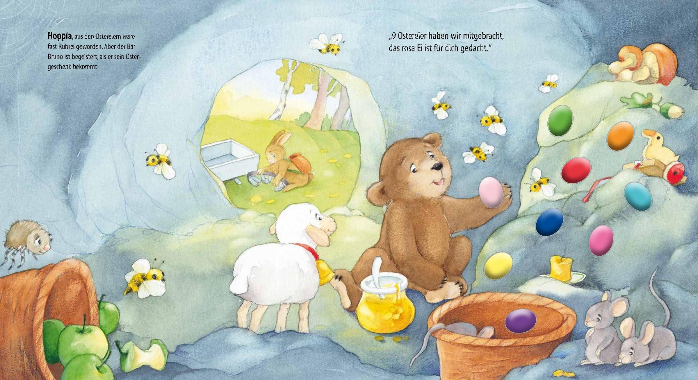 Mit Spaß und Freude können Kinder so nicht nur der Ostergeschichte lauschen und die bunten Bilder vom Osterhasen und seinen Freunden betrachten, sie können so auch das erste Zählen lernen und die gezeigten Farben.