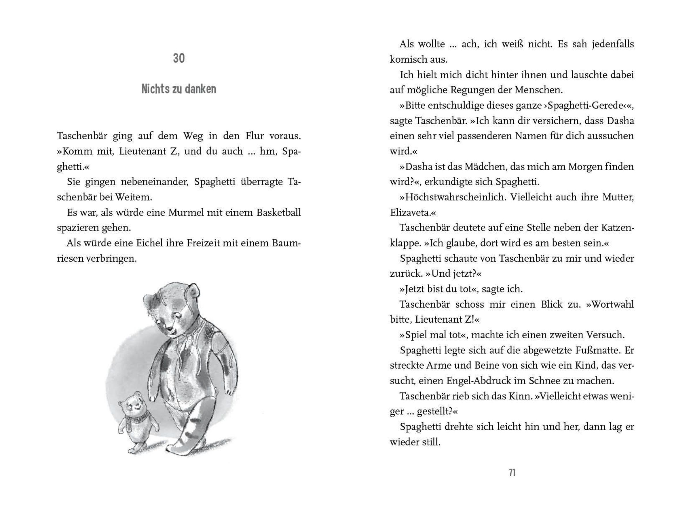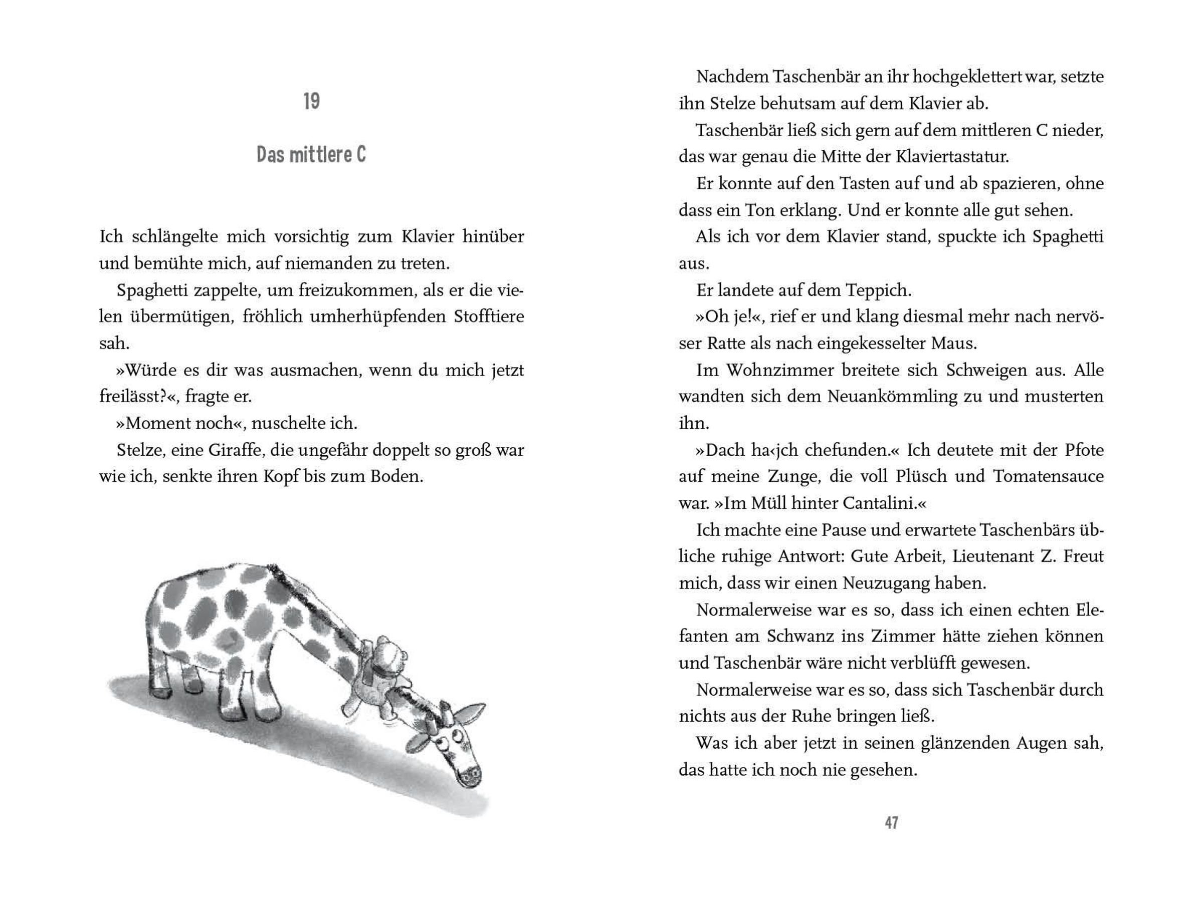 Dieses Schild hängt prominent über einem Bollerwagen mit Zephs Beute vor der Haustür der zehnjährigen Dasha und ihrer Mutter. Eine absolute Frechheit, findet die ehemalige Straßenkatze, die sich nur nimmt, was andere weggeworfen haben. Vor allem sind es Kuscheltiere und Dasha schenkt ihnen ein neues Heim. Der prominenteste Bewohner ist Taschenbär, ein handtellergroßer Teddybär, der vor langer Zeit im Ersten Weltkrieg auf einen Soldaten aufgepasst hat. Wenn nachts die Kuscheltiere lebendig werden und herumtollen, ist er ihr Anführer. Doch dann stößt ein zweiter Teddybär - uralt, groß und kostbar - zur Truppe und nicht nur für die Katze Zeph beginnt ein unvergessliches Abenteuer!