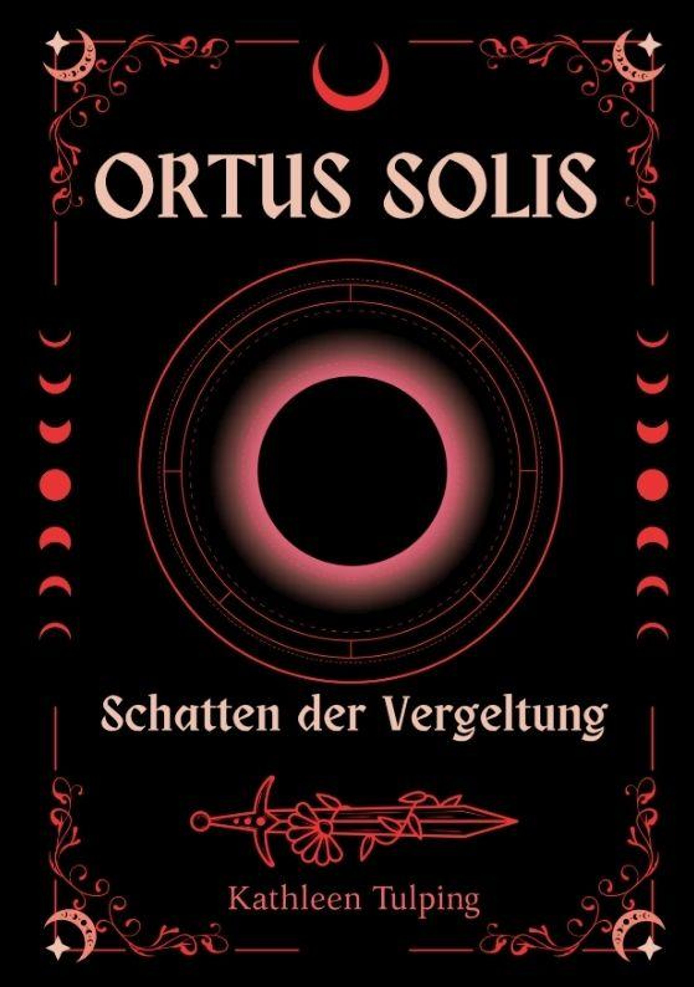 "Ortus Solis: Schatten der Vergeltung" von Kathleen Tulping, mit schwarzem Hintergrund und roten, dekorativen Mustern., Buch