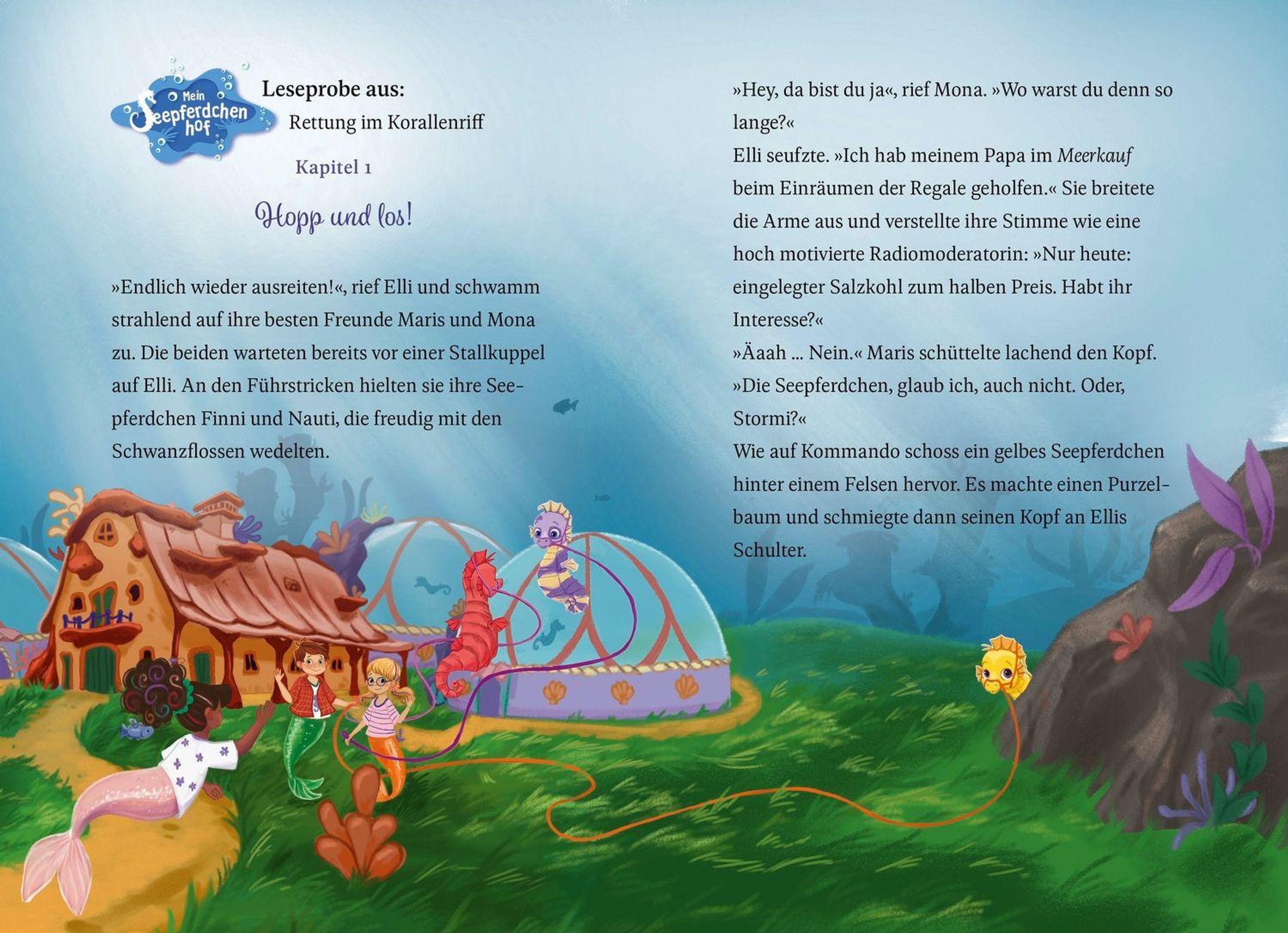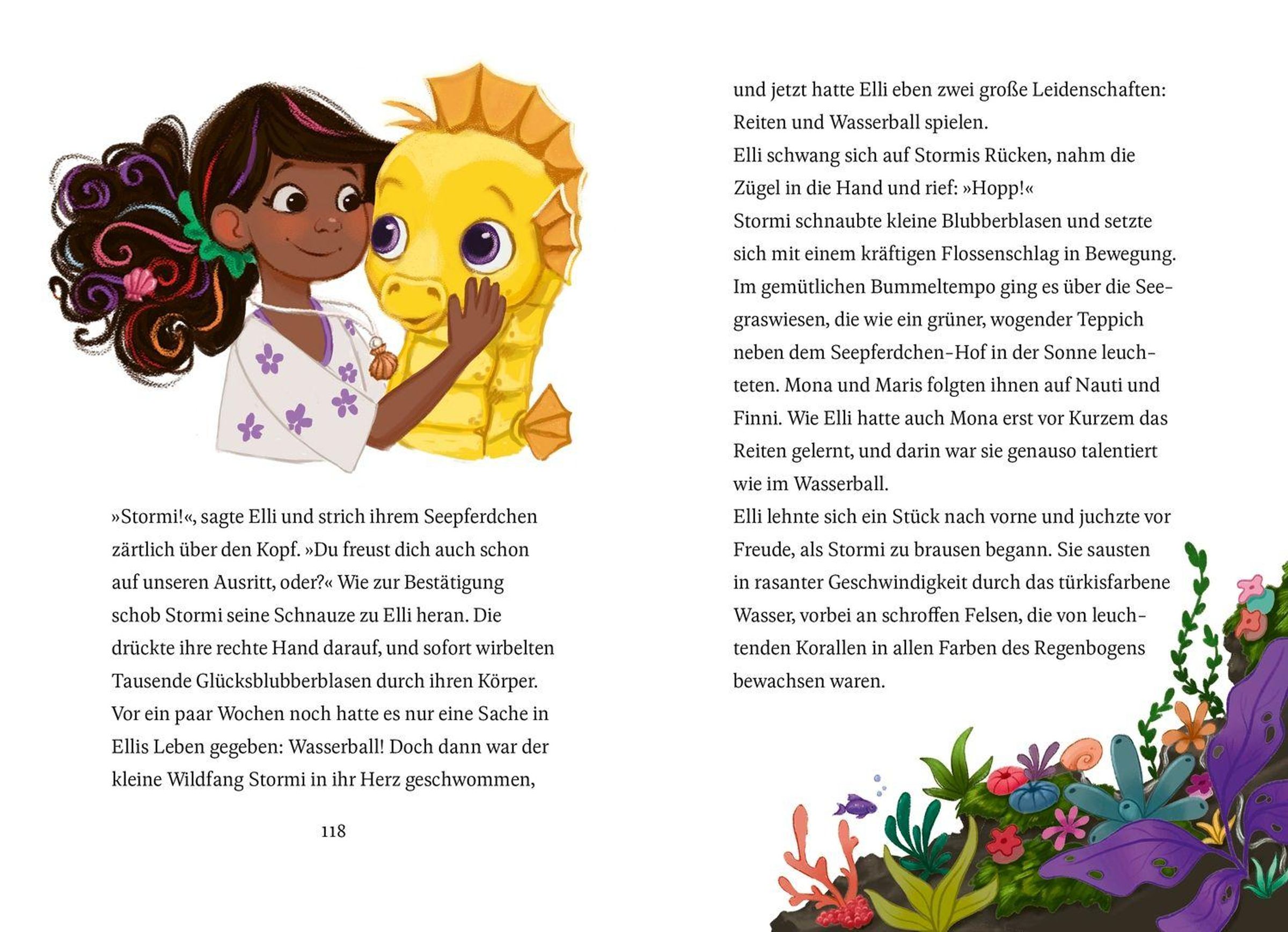 Bei einem ihrer Ausritte entdecken Elli, Maris und Mona eine zauberhafte Herde wilder Seepferdchen. Sie sind wunderschön und schimmern in allen Farben des Regenbogens. Doch jemand ist den wilden Tieren auf den Fersen. Wer steckt hinter den Fallen im Seetang-Wald? Und werden die Freunde verhindern können, dass die Regenbogen-Seepferdchen in Gefangenschaft geraten?