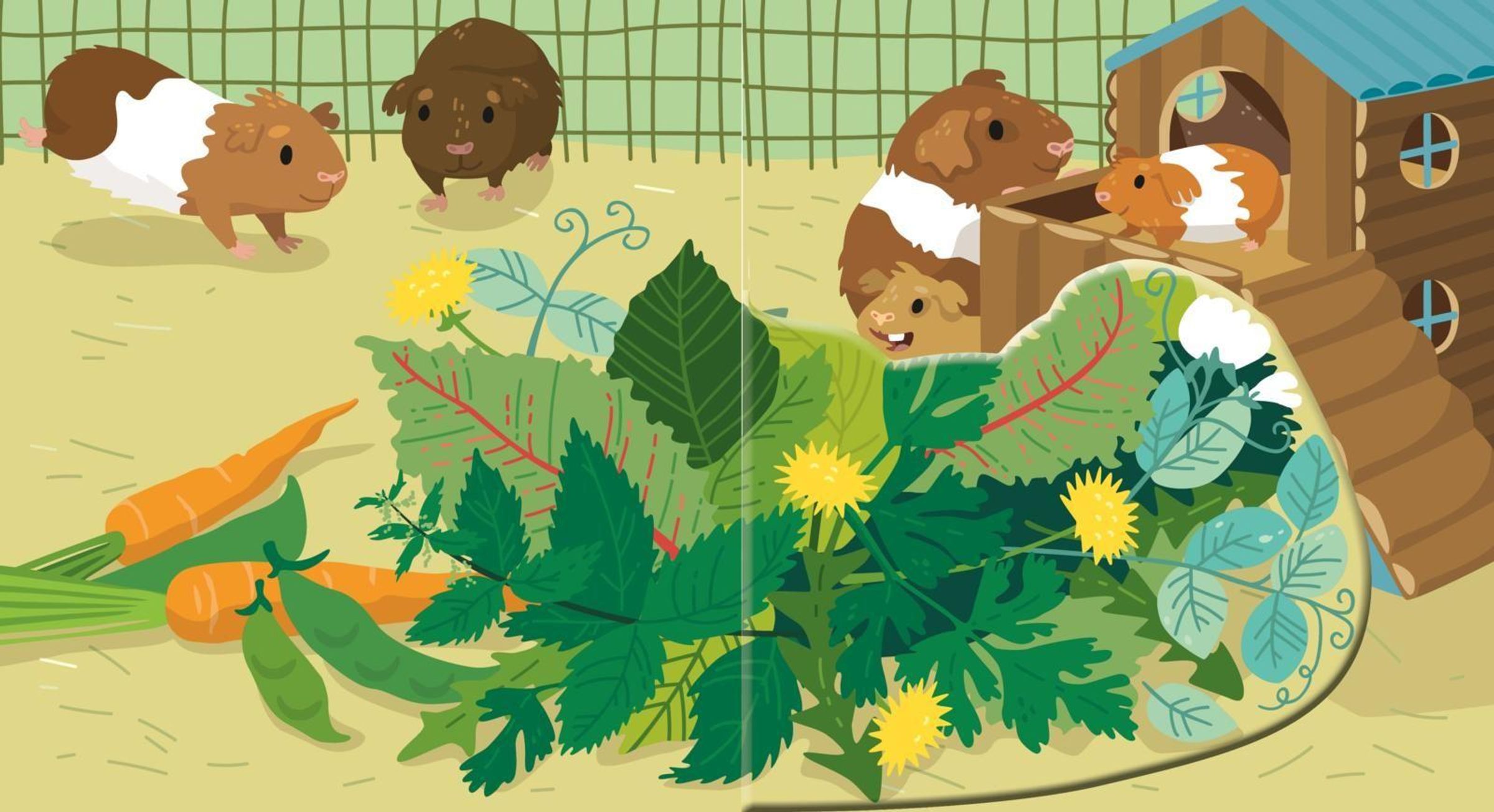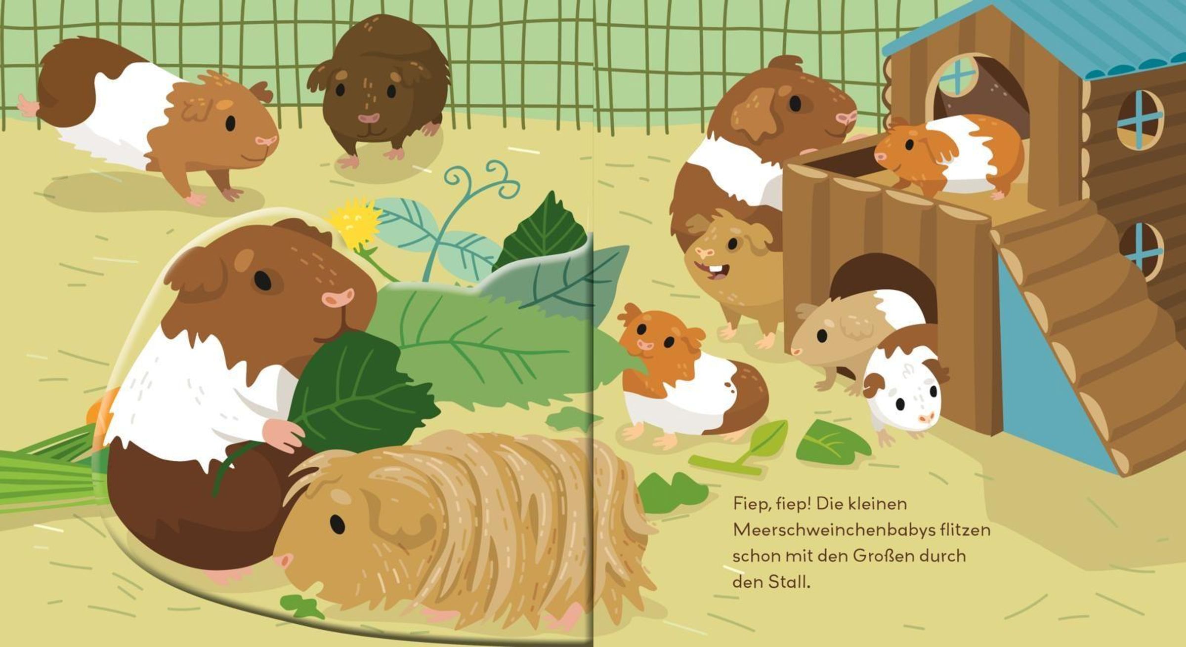 Der Hund möchte mit dem Ball spielen, die kleinen Katzen klettern um die Wette und das Meerschweinchen knabbert sein Lieblingsfutter. Komm mit, wir lernen unsere Haustiere kennen!