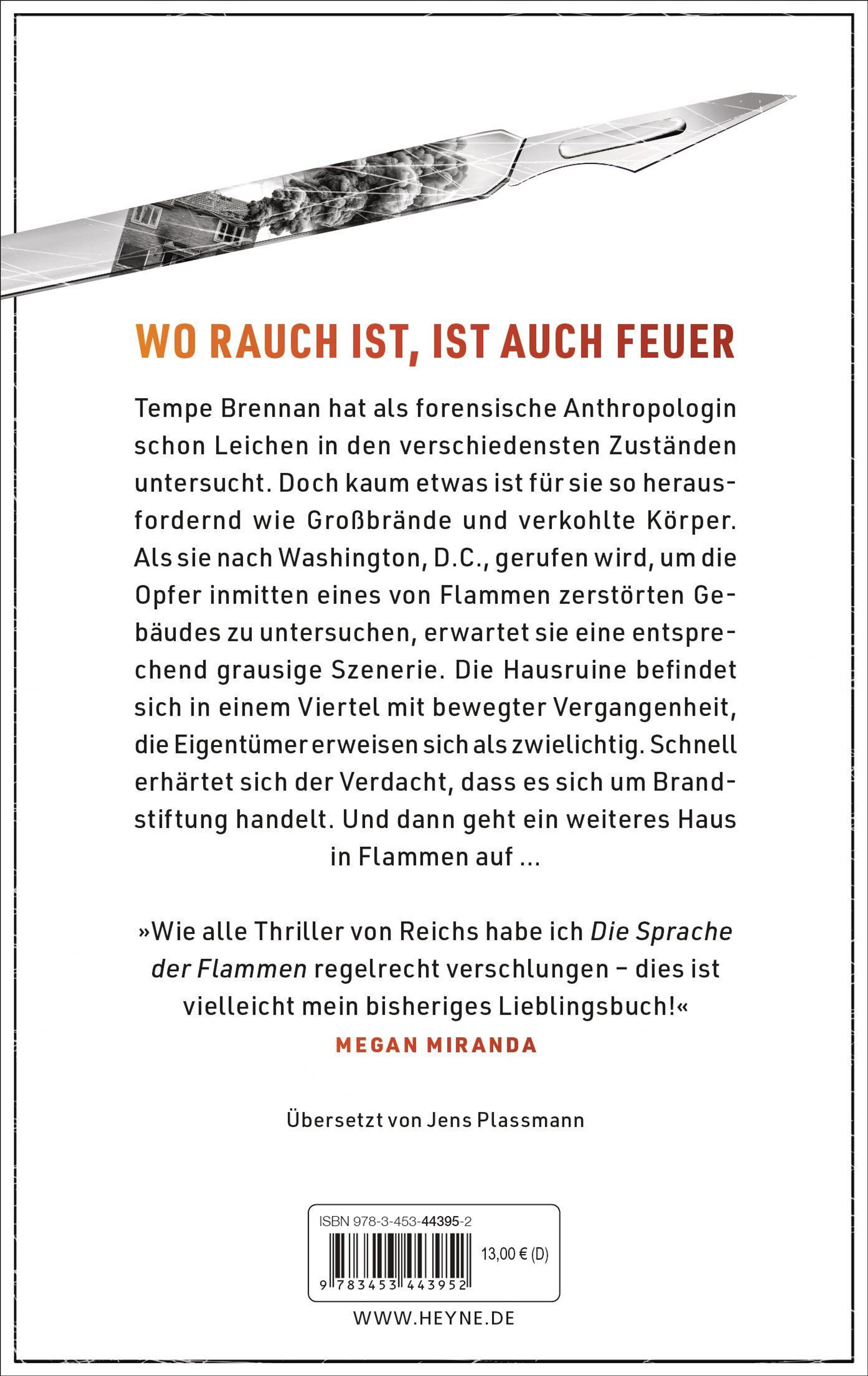 Tempe Brennan hat als forensische Anthropologin schon Leichen in den verschiedensten Zuständen untersucht. Doch kaum etwas ist für sie so herausfordernd wie Großbrände und verkohlte Körper. Als sie nach Washington, D. C., gerufen wird, um die Opfer inmitten eines von Flammen zerstörten Gebäudes zu untersuchen, erwartet sie eine entsprechend grausige Szenerie. Die Hausruine befindet sich in einem Viertel mit bewegter Vergangenheit, die Eigentümer erweisen sich als zwielichtig. Schnell erhärtet sich der Verdacht, dass es sich um Brandstiftung handelt. Und dann geht ein weiteres Haus in Flammen auf ...
