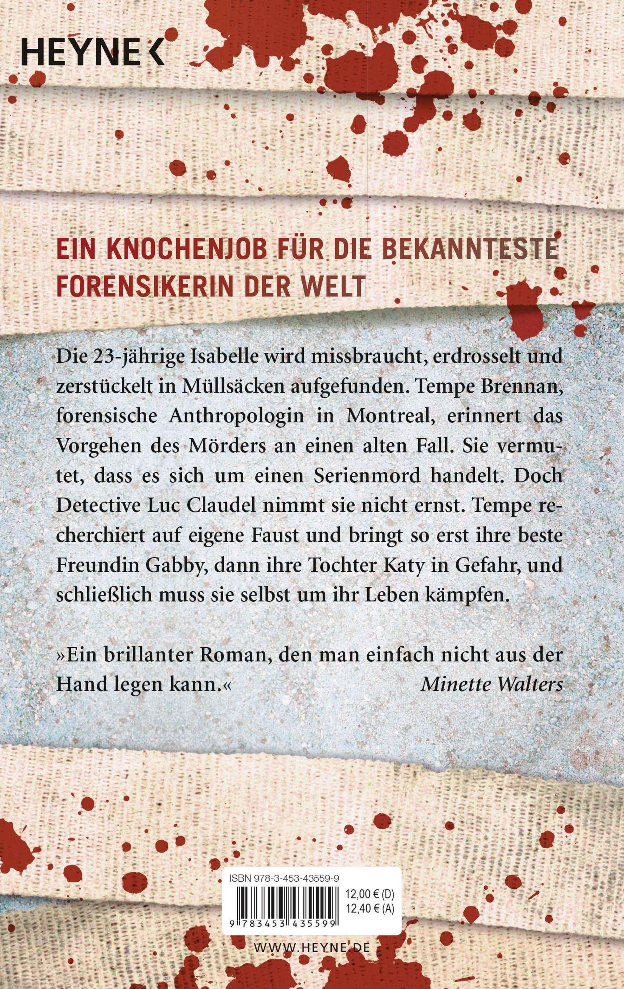 Als wissenschaftliche Mitarbeiterin am gerichtsmedizinischen Institut wird die Anthropologin Tempe Brennan immer dann zu Rate gezogen, wenn die Mordkommission mit ihrem Latein am Ende ist. So auch in diesem Fall: Die Leiche der 23jährigen Isabelle Gagnon, die zerstückelt in Müllsäcken aufgefunden wird, gibt Rätsel auf. Schnell entdeckt Tempe Parallelen zu einem ein Jahr zurückliegenden Mord an einer jungen Frau, was in ihr den Verdacht auf Serienmord aufkommen läßt. Doch Detective Luc Claudel glaubt ihrer Theorie nicht. Durch Nachforschungen auf eigene Faust macht sich Tempe nicht nur Claudel zum Feind, sondern provoziert auch die Wut des Killers. Sie, ihre Freundin Gabby sowie ihre Tochter Katy geraten in tödliche Gefahr.