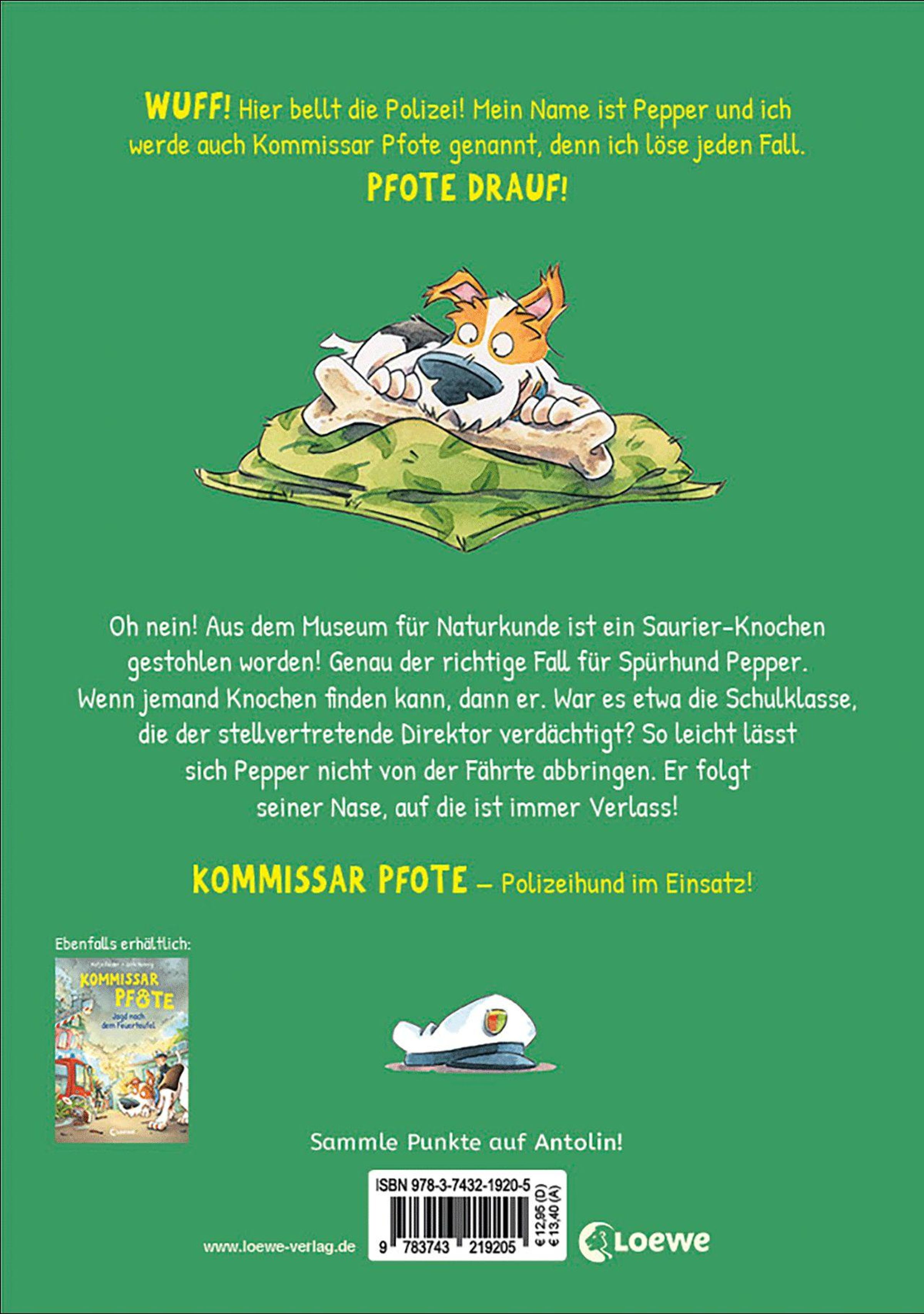 WUFF! Hier bellt die Polizei! Mein Name ist Pepper und ich werde auch Kommissar Pfote genannt, denn ich löse jeden Fall. PFOTE DRAUF! Oh nein! Aus dem Museum für Naturkunde ist ein Saurier-Knochen gestohlen worden! Genau der richtige Fall für Spürhund Pepper. Wenn jemand Knochen finden kann, dann er. War es die Schulklasse, die der stellvertretende Direktor verdächtigt? So leicht lässt sich Pepper nicht von der Fährte abbringen. Er folgt seiner Nase, auf die ist immer Verlass!