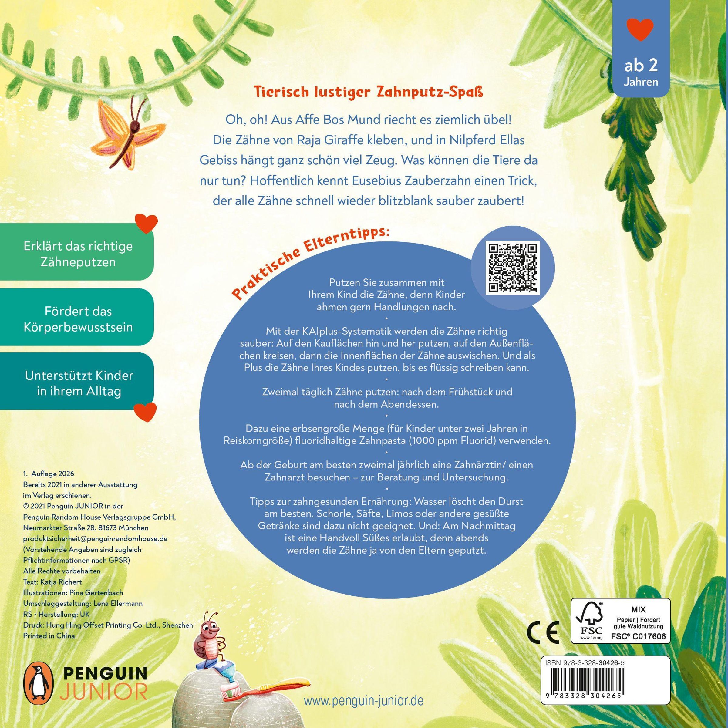 Ein Pappbilderbuch für Kinder ab 2 Jahren - mit wertvollen Elterntipps zur Kinderzahnpflege auf der Buchrückseite.