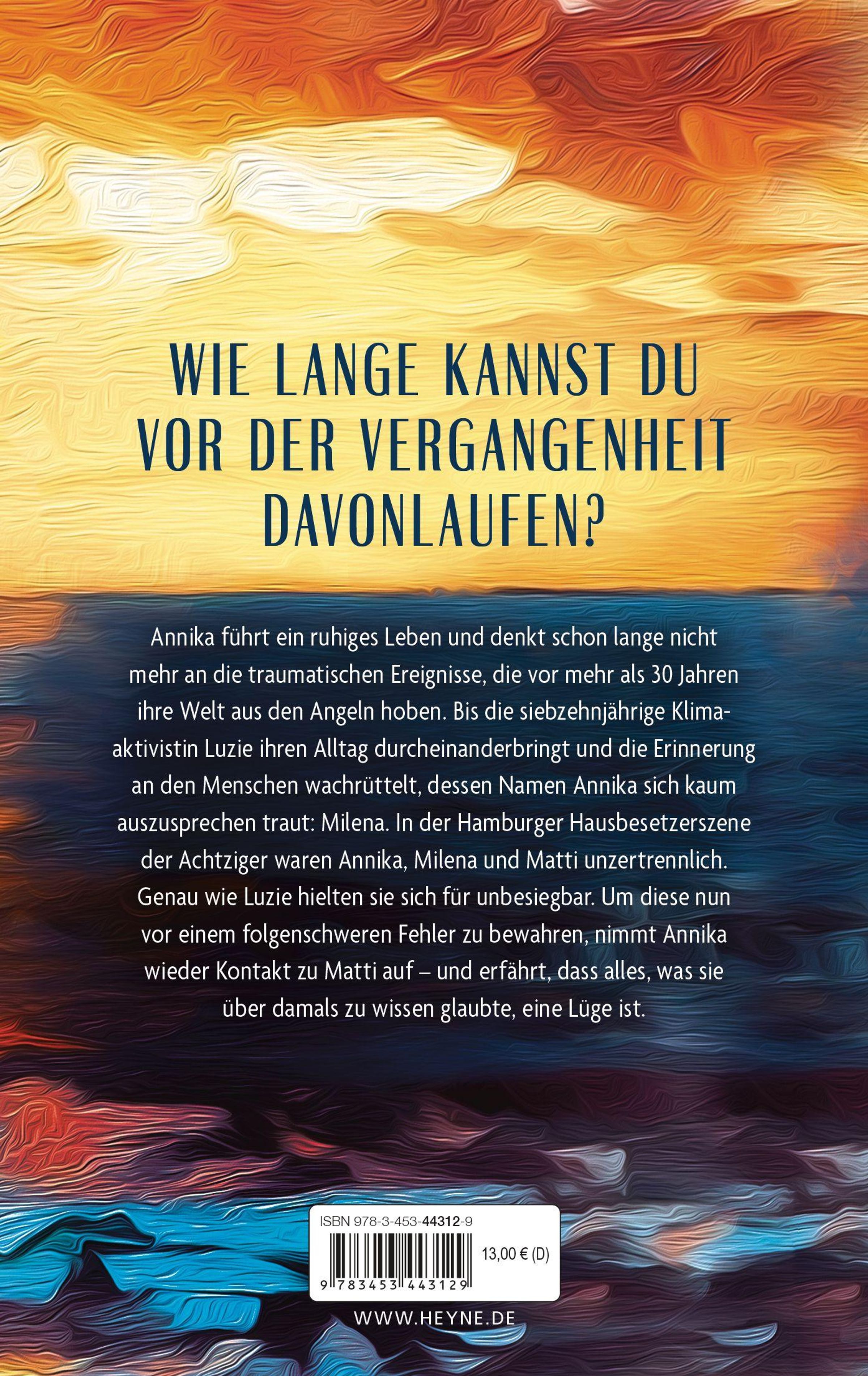 Annika führt ein ruhiges Leben und denkt schon lange nicht mehr an die traumatischen Ereignisse, die vor mehr als dreißig Jahren ihre Welt aus den Angeln hoben. Bis die siebzehnjährige Klimaaktivistin Luzie ihren Alltag durcheinanderbringt und die Erinnerung an den Menschen wachrüttelt, dessen Namen sich Annika kaum auszusprechen traut: Milena. In der Hamburger Hausbesetzerszene der Achtziger waren Annika, Milena und Matti unzertrennlich. Sie hielten sich für unbesiegbar, so wie Luzie es tut. Um diese vor einem folgenschweren Fehler zu bewahren, nimmt Annika wieder Kontakt zu Matti auf. Sie reist zu ihm nach Italien - und erfährt, dass alles, was sie über damals zu wissen glaubte, eine Lüge ist.