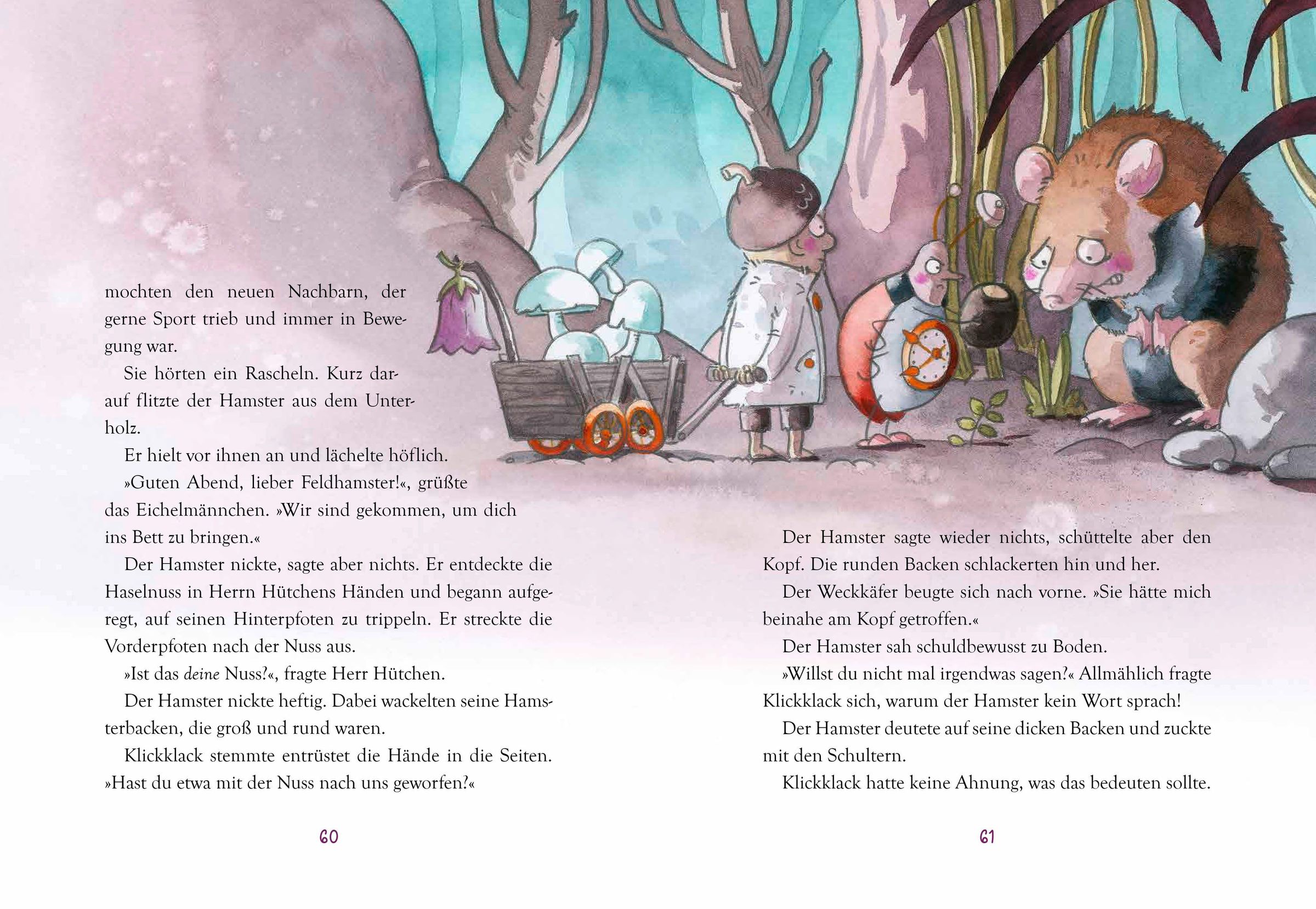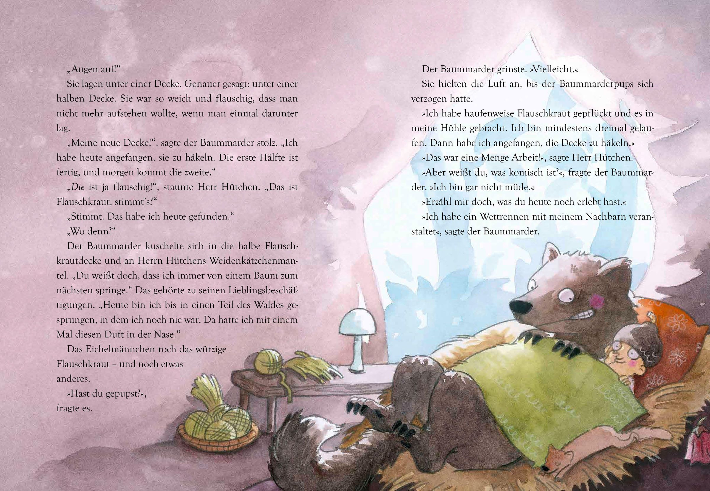 Herr Hütchen ist wieder unterwegs: Mit seinem Wagen voller Leuchtpilze zieht der freundliche Nachtwächter durch den Wald und bringt die Tiere ins Bett. Dazu gehören nun auch der Hamster, der erst vor Kurzem hierhergezogen ist und so gerne in die Sterne schaut, und der Wolf, der heute schlecht geträumt hat. Herr Hütchen weiß Rat, wenn die Tiere nicht zur Ruhe finden, und hat eine Menge neuer Ideen: Achtsamkeitsübungen, eine Einschlaf-Checkliste, eine Zuruf-Gutenachtgeschichte und mehr. Natürlich weiß er auch, wie der Biber und seine Freunde sich beim Zähneputzen garantiert nicht mehr langweilen. Und auf Übernachtungspartys ist das Eichelmännchen Ehrengast!