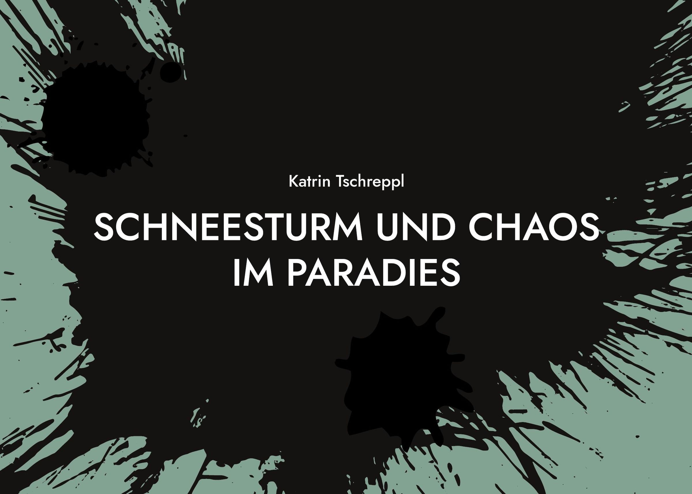 Text: "SCHNEESTURM UND CHAOS IM PARADIES" von Katrin Tschreppl. Schwarze Tintenflecken auf pastellgrünem Hintergrund., Buch