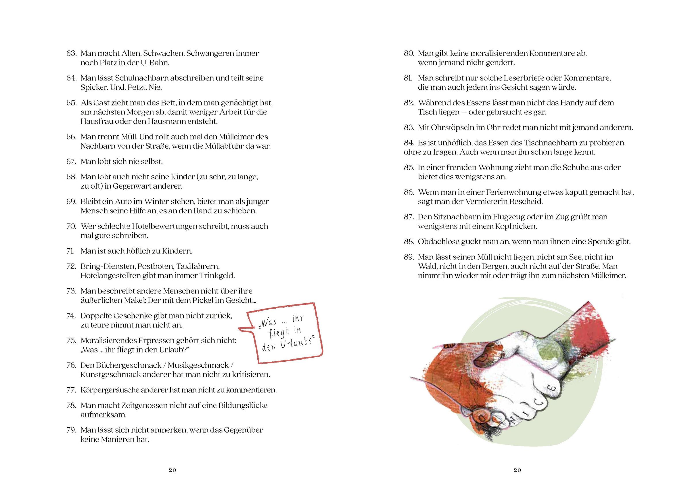 Was ist wichtig im Leben? Worauf kommt es an? Dieses Buch hat darauf einige Antworten. Es listet auf, was eigentlich unlistbar ist: Was muss ich tun, um als gebildet oder als höflich zu gelten? Wie werde ich ein politischer Mensch? Welche Bücher sollte ich gelesen, welche Filme gesehen haben? Welche Gerichte sollte jeder Mensch kochen können? Das Buch gibt Tipps, wie man richtig kondoliert, eine Gehaltsverhandlung führt oder eine Krise überwindet.