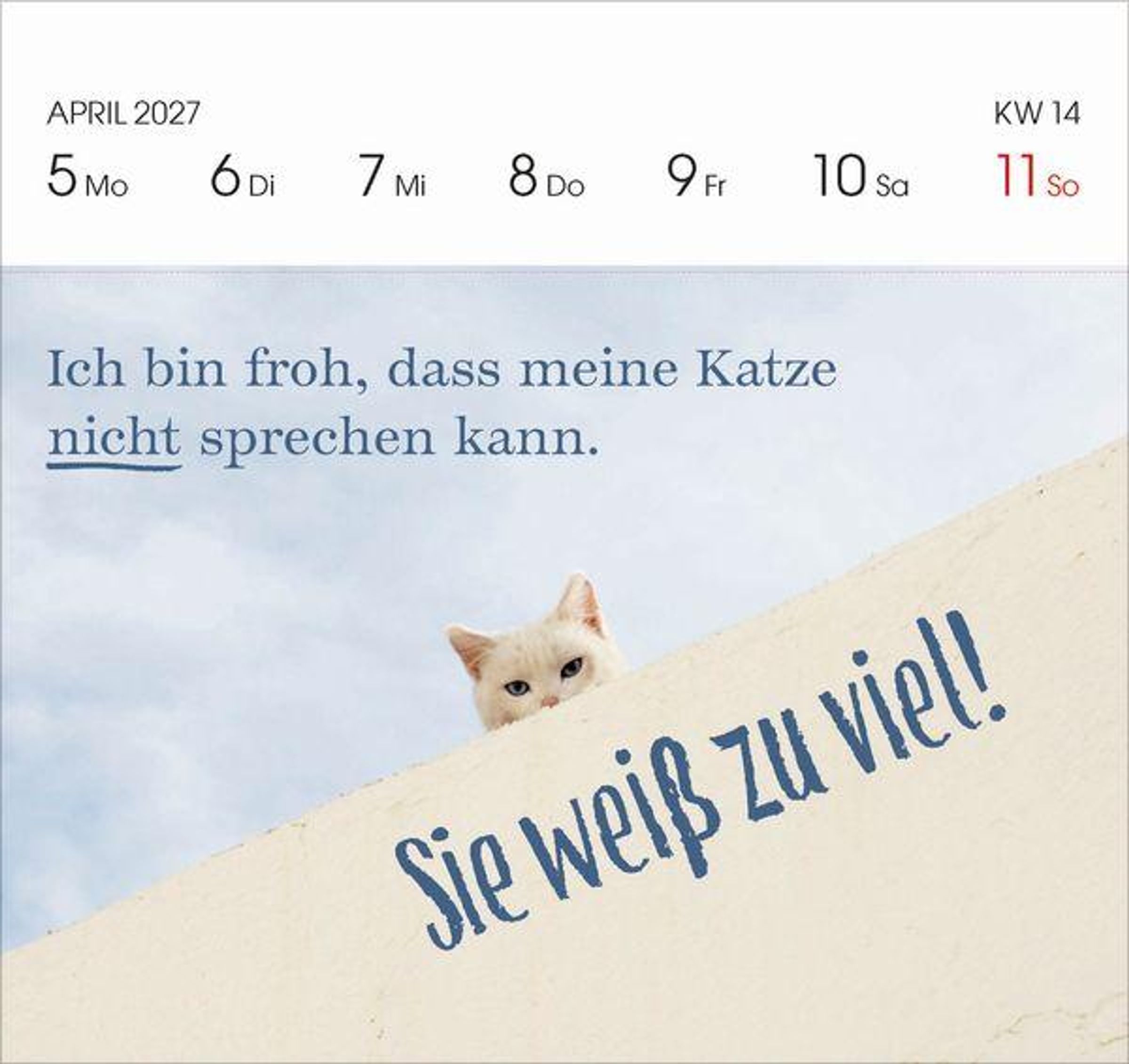 Dieser Kalender ist der perfekte Jahresbegleiter für alle Katzenliebhaber. Wunderschöne Katzenfotos treffen auf witzige und liebevolle Sprüche. Perfekt als Geschenkidee oder zum Selbstbehalten. Aufstellbarer Kalender mit 53 heraustrennbaren Postkarten, die man sammeln, an den Kühlschrank pinnen oder verschicken kann.