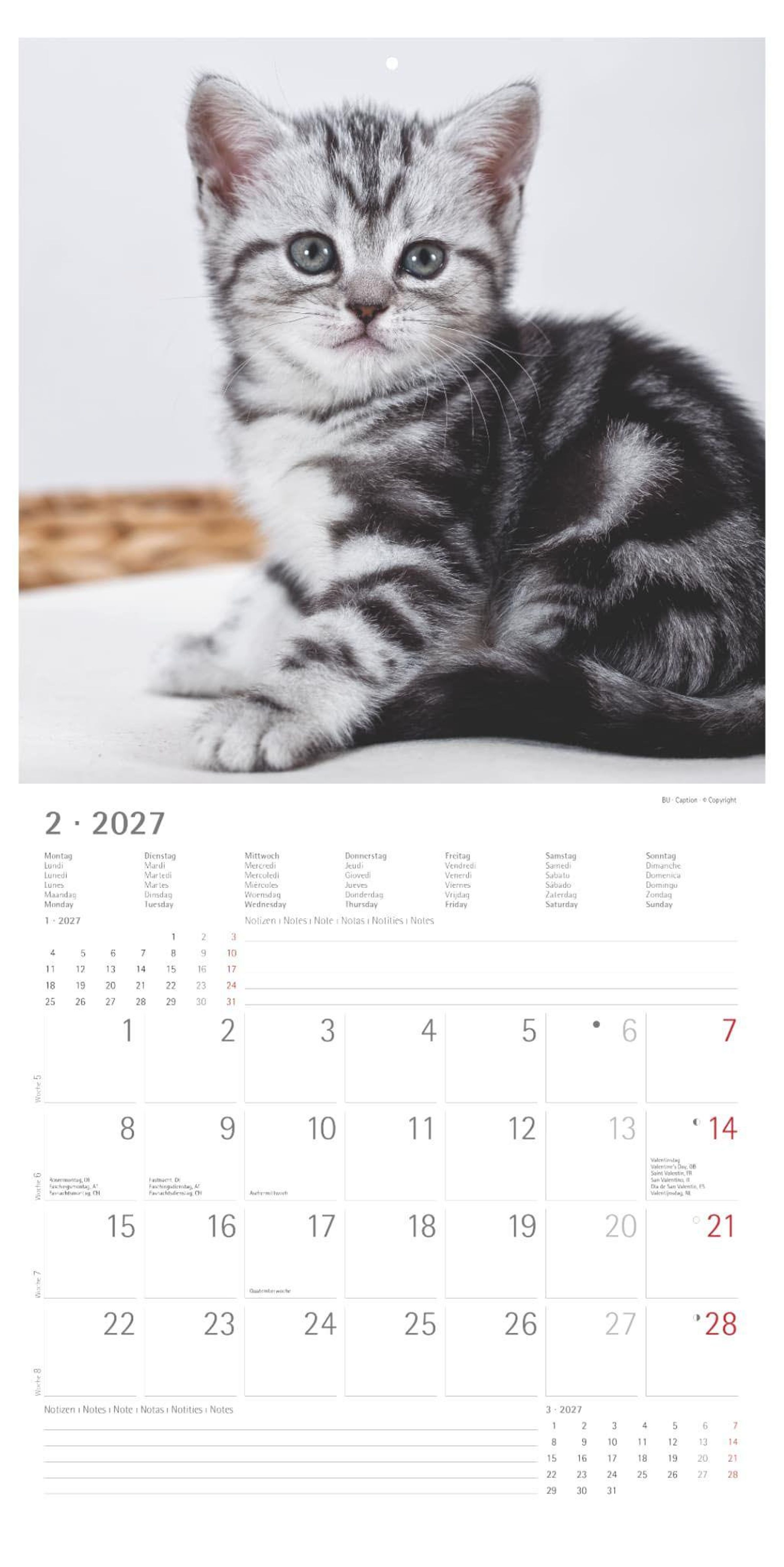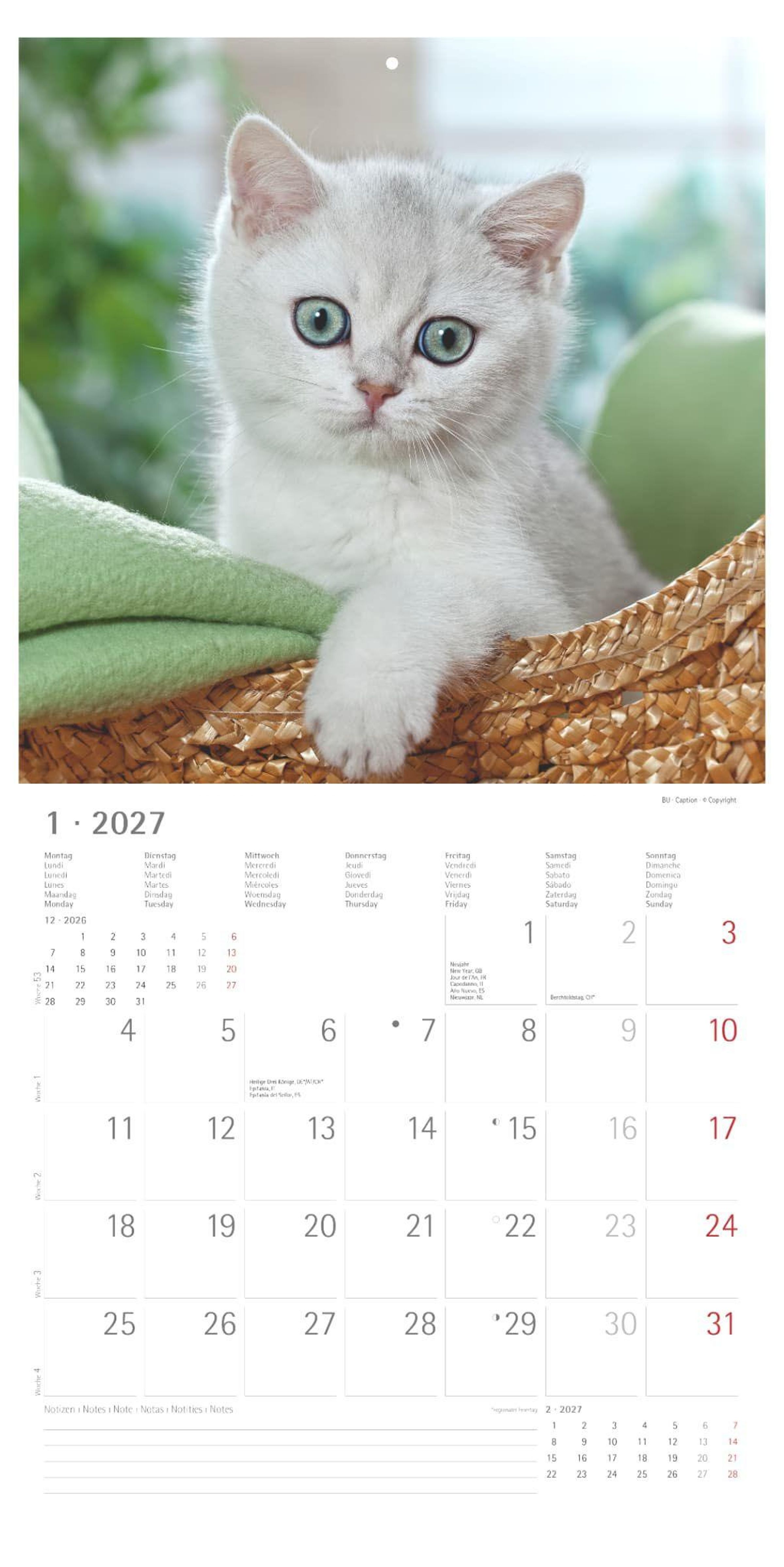 Ob als süße Wanddekoration oder als Geschenkidee für Katzenfans: Der Katzenbabys 2027 Kalender bringt Freude in jeden Monat -- und hilft dabei, alles Wichtige festzuhalten.