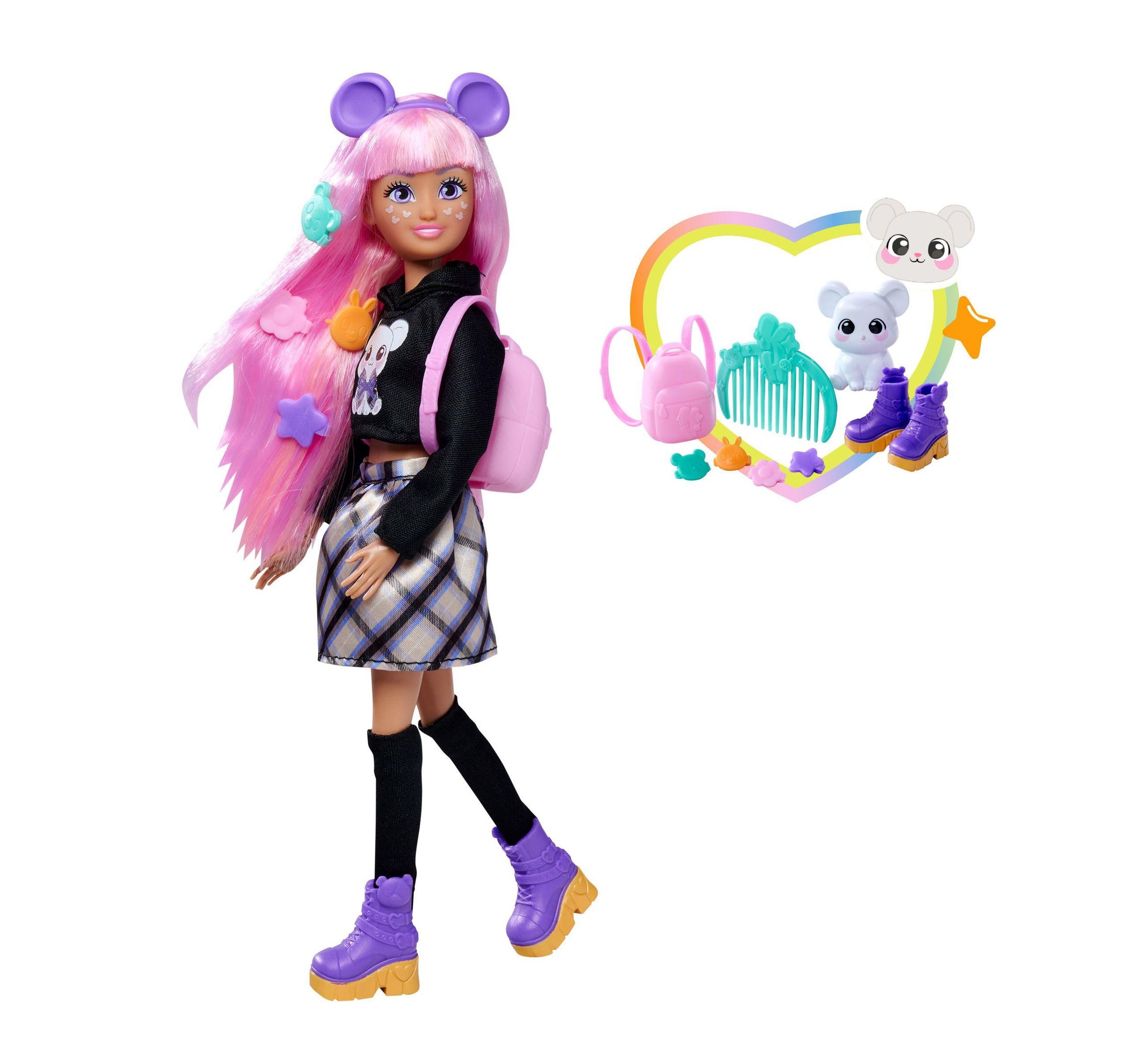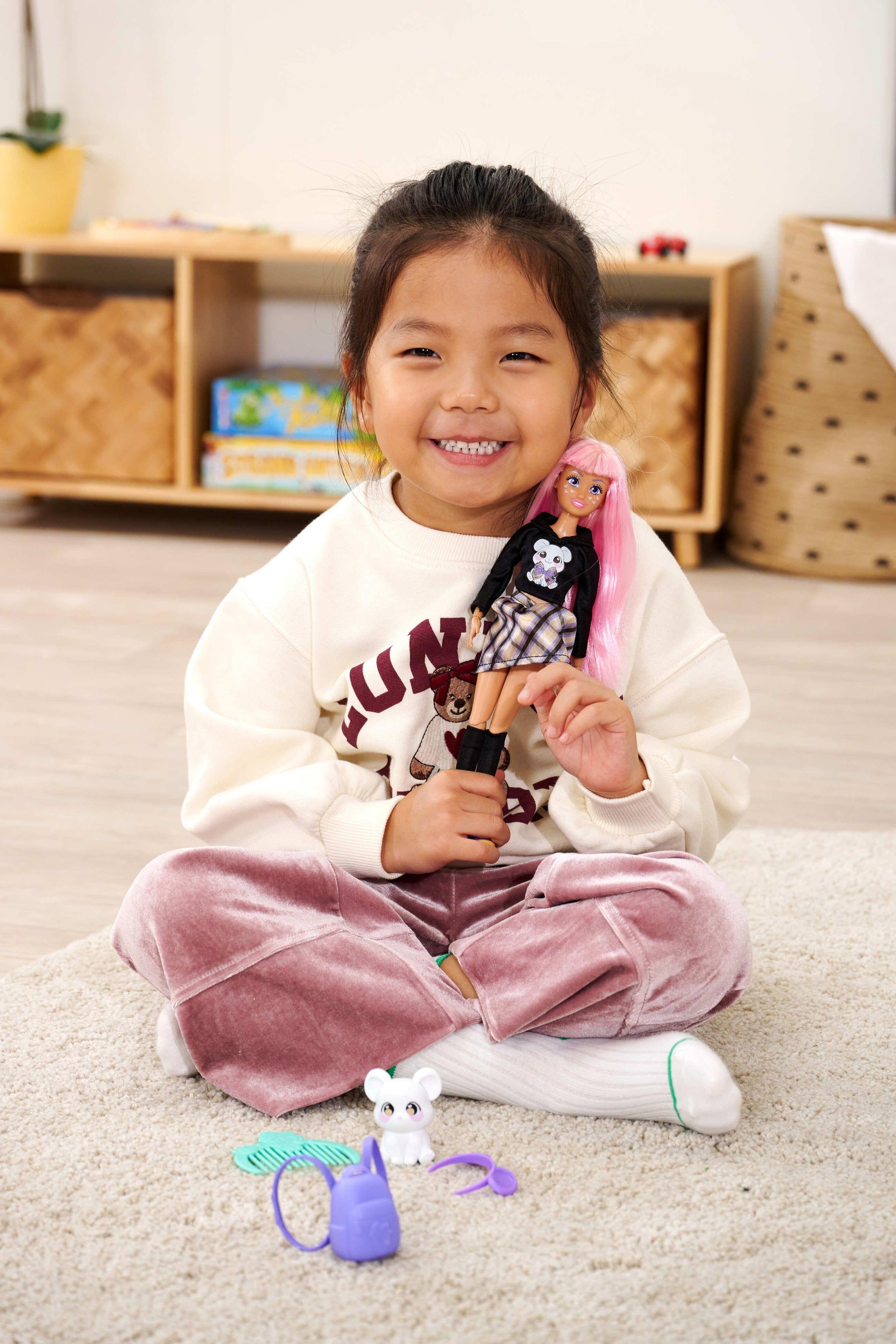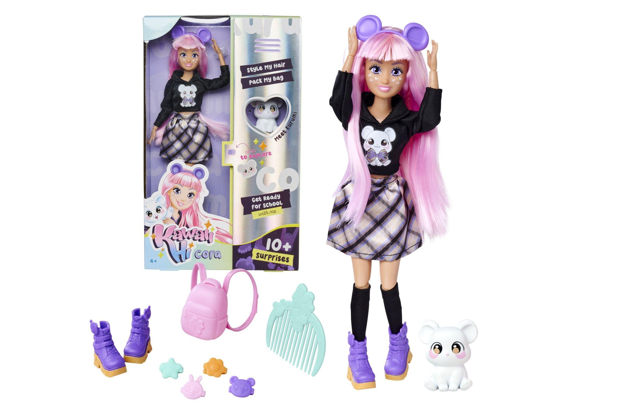 "Kawaii Hi Cora", "Style My Hair", "Pack My Bag". Puppe mit pinken Haaren, lila Schuhen, Accessoires und kleinem Stofftier., Diverse