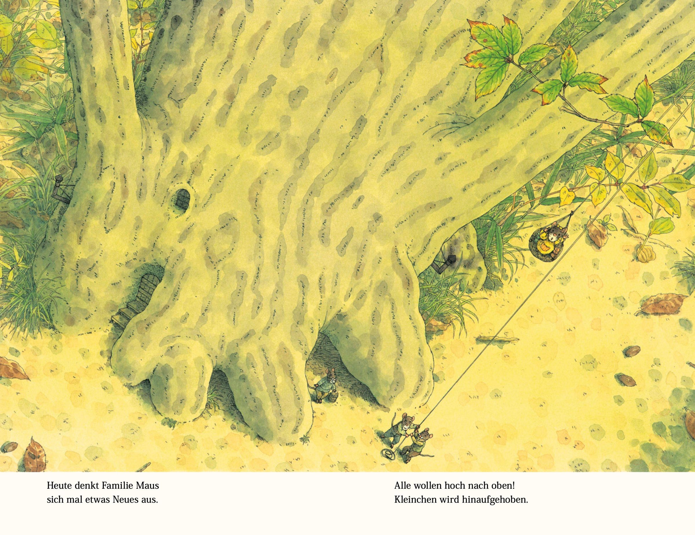 Familie Maus baut in die Krone ihres Baumes eine Terrasse, von dort hat man eine herrliche Aussicht auf die wunderschöne Natur. Zur Feier des Tages findet das Abendessen auf dem neuen Hochsitz statt. Bald hat der Mond seinen spektakulären Auftritt und zeigt, wie beeindruckend die Natur sein kann. Für diesen Blick hat sich die Arbeit wahrlich gelohnt.
