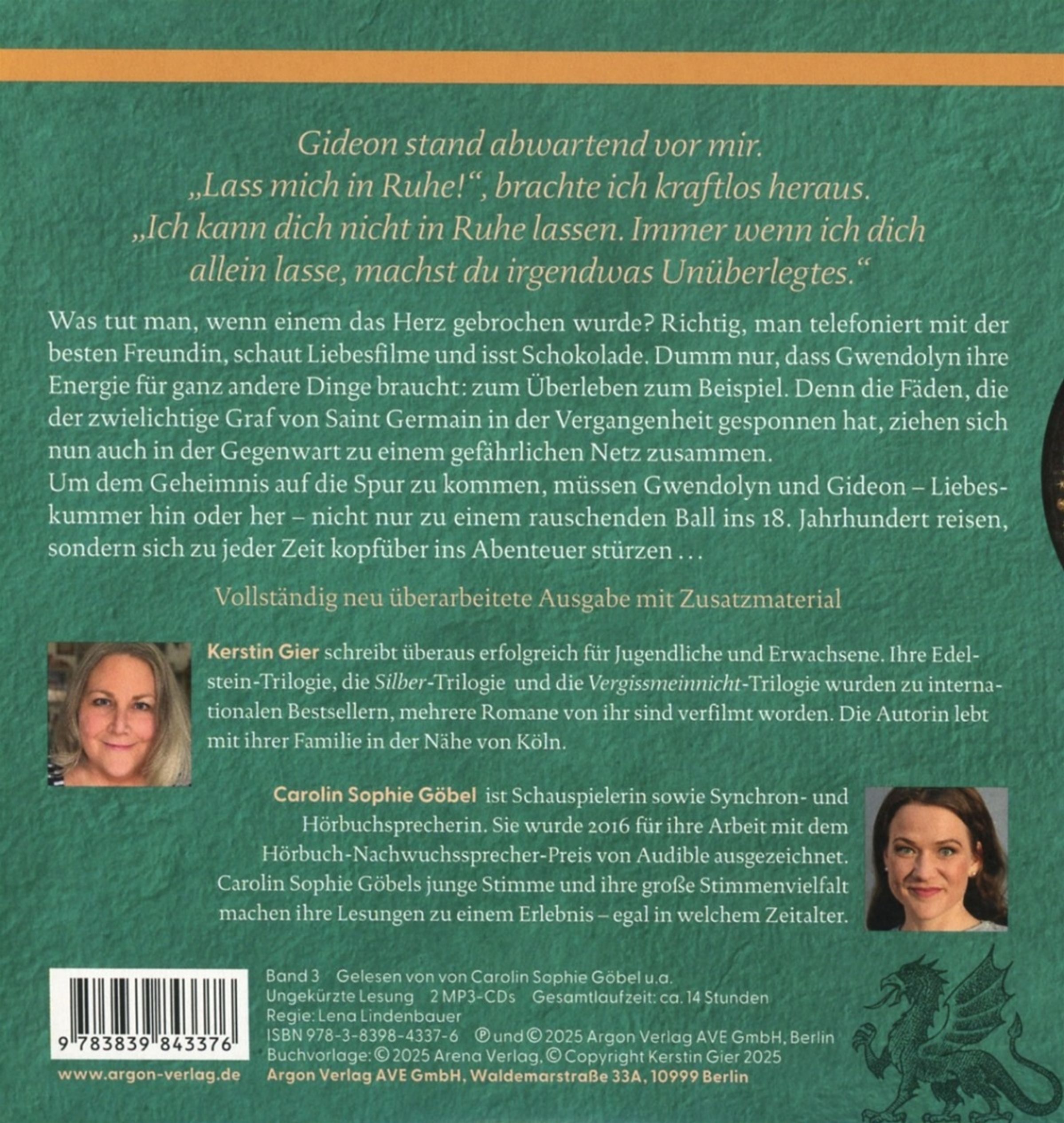 Was tut man, wenn einem das Herz gebrochen wurde? Richtig, man telefoniert mit der besten Freundin, schaut Liebesfilme und isst Schokolade. Dumm nur, dass Gwendolyn ihre Energie für ganz andere Dinge braucht: zum Überleben zum Beispiel. Denn die Fäden, die der zwielichtige Graf von Saint Germain in der Vergangenheit gesponnen hat, ziehen sich nun auch in der Gegenwart zu einem gefährlichen Netz zusammen. Um dem Geheimnis auf die Spur zu kommen, müssen Gwendolyn und Gideon - Liebeskummer hin oder her - nicht nur zu einem rauschenden Ball ins 18. Jahrhundert reisen, sondern sich zu jeder Zeit kopfüber ins Abenteuer stürzen ...