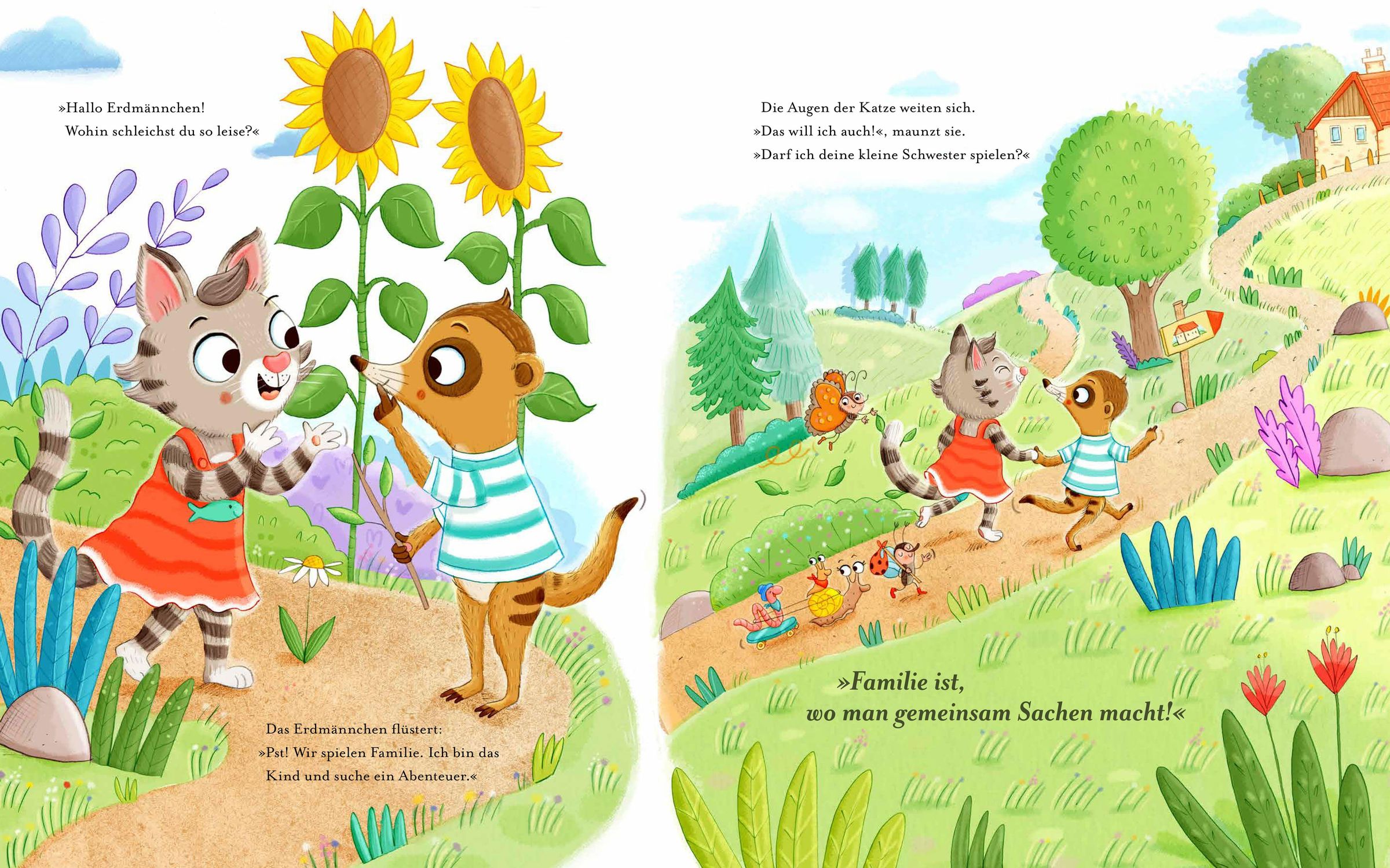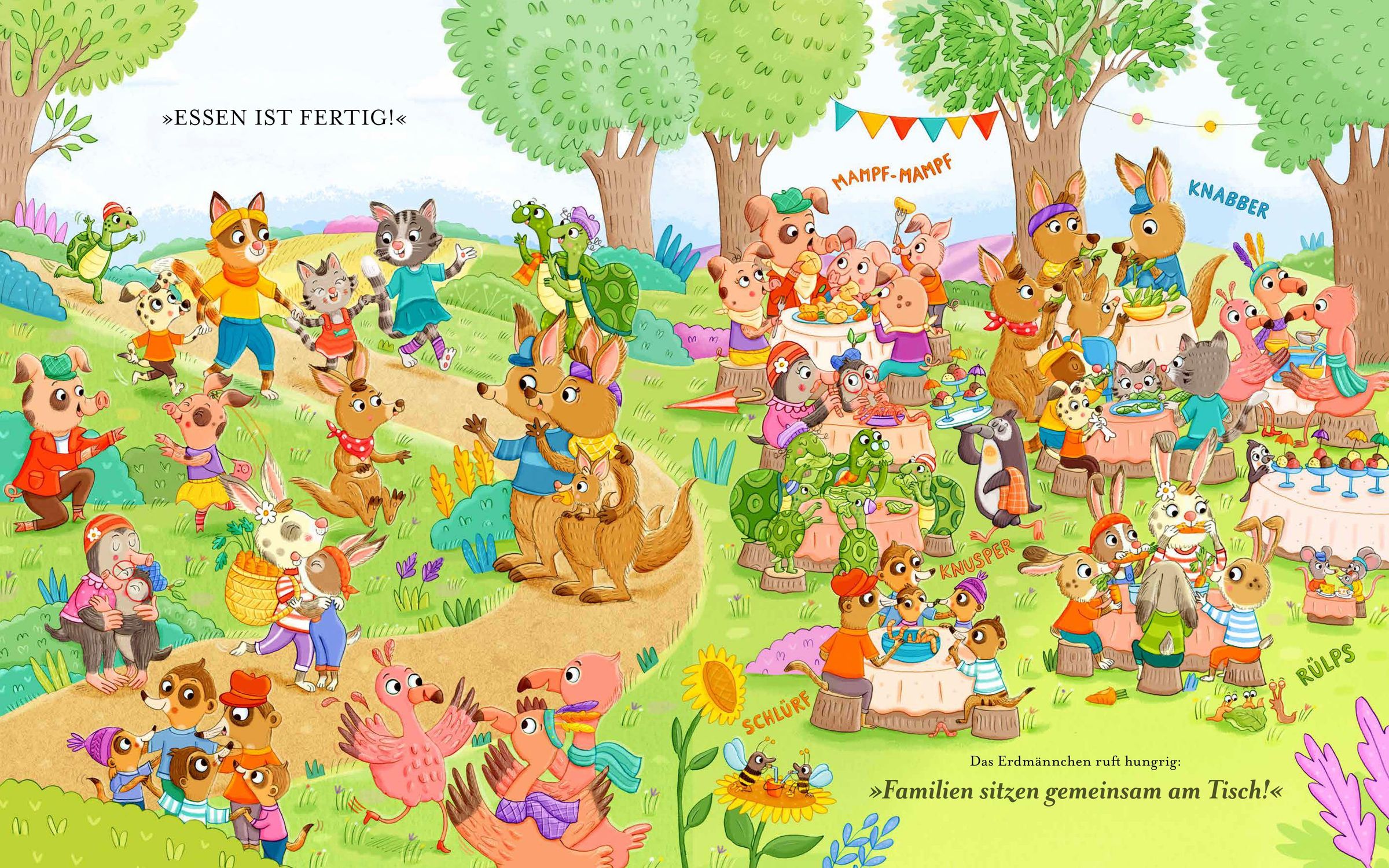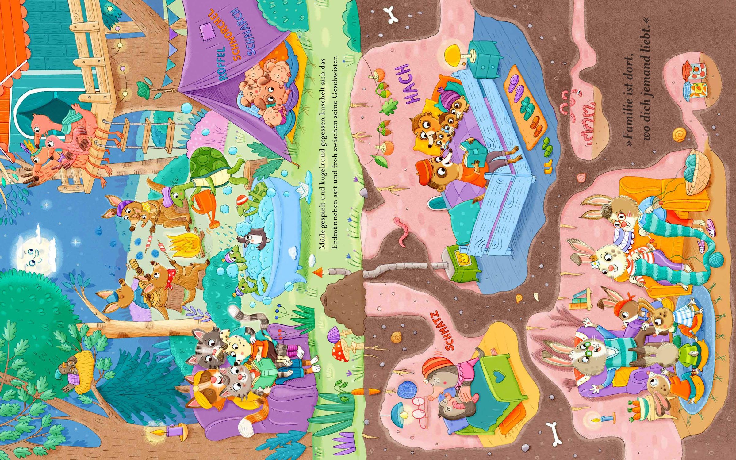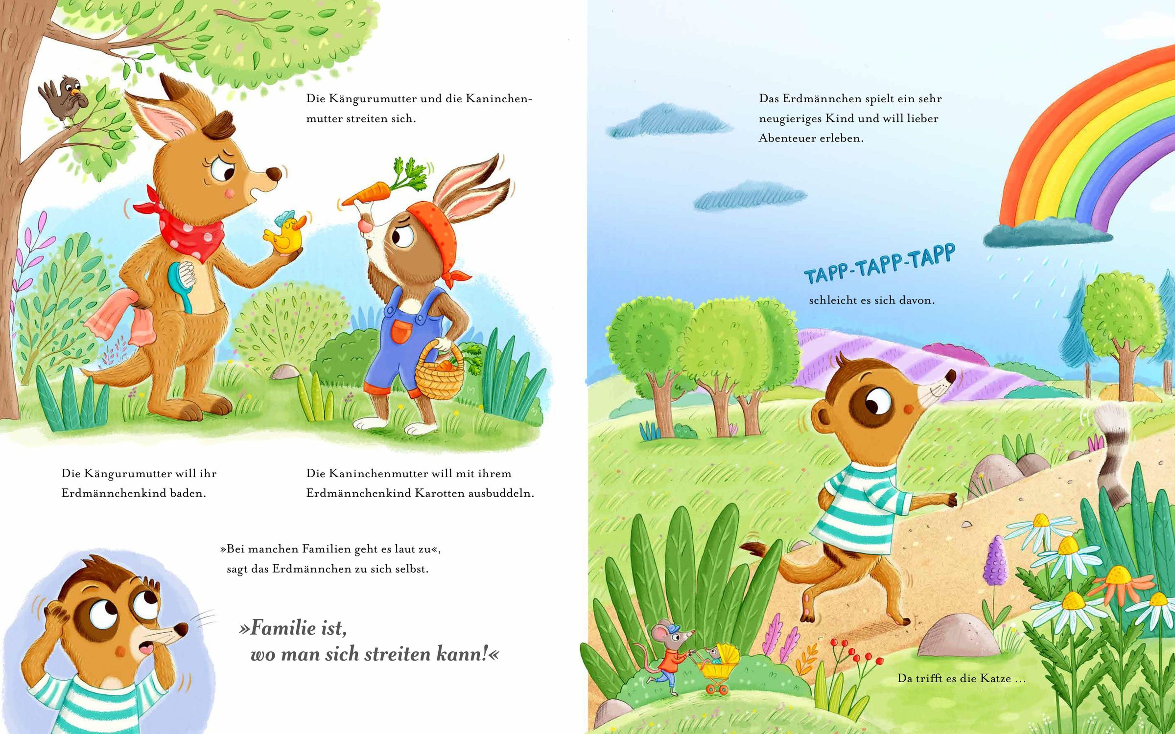 Knödelrö - das Erdmännchen und das Känguru langweilen sich. 'Wollen wir Familie spielen?', fragt das Erdmännchen. Schwupp - schon ist das Känguru die Mutter und steckt ihr Kind in den Beutel. Aha! Familie ist da, wo es warm und gemütlich ist! Da kommt das Kaninchen und will auch eine Mutter sein - na klar: Familie kann sich verändern! Die Katze spielt eine Schwester, denn Familie ist da, wo man zusammen lacht! Der Maulwurf springt ein, als das Erdmännchen sich wehtut - er spielt einen Opa: Denn Familie ist da, wo man getröstet wird. Und als die Eltern ihre Tierkinder zum Essen rufen, wissen alle: Familie ist da, wo dich jemand liebt.