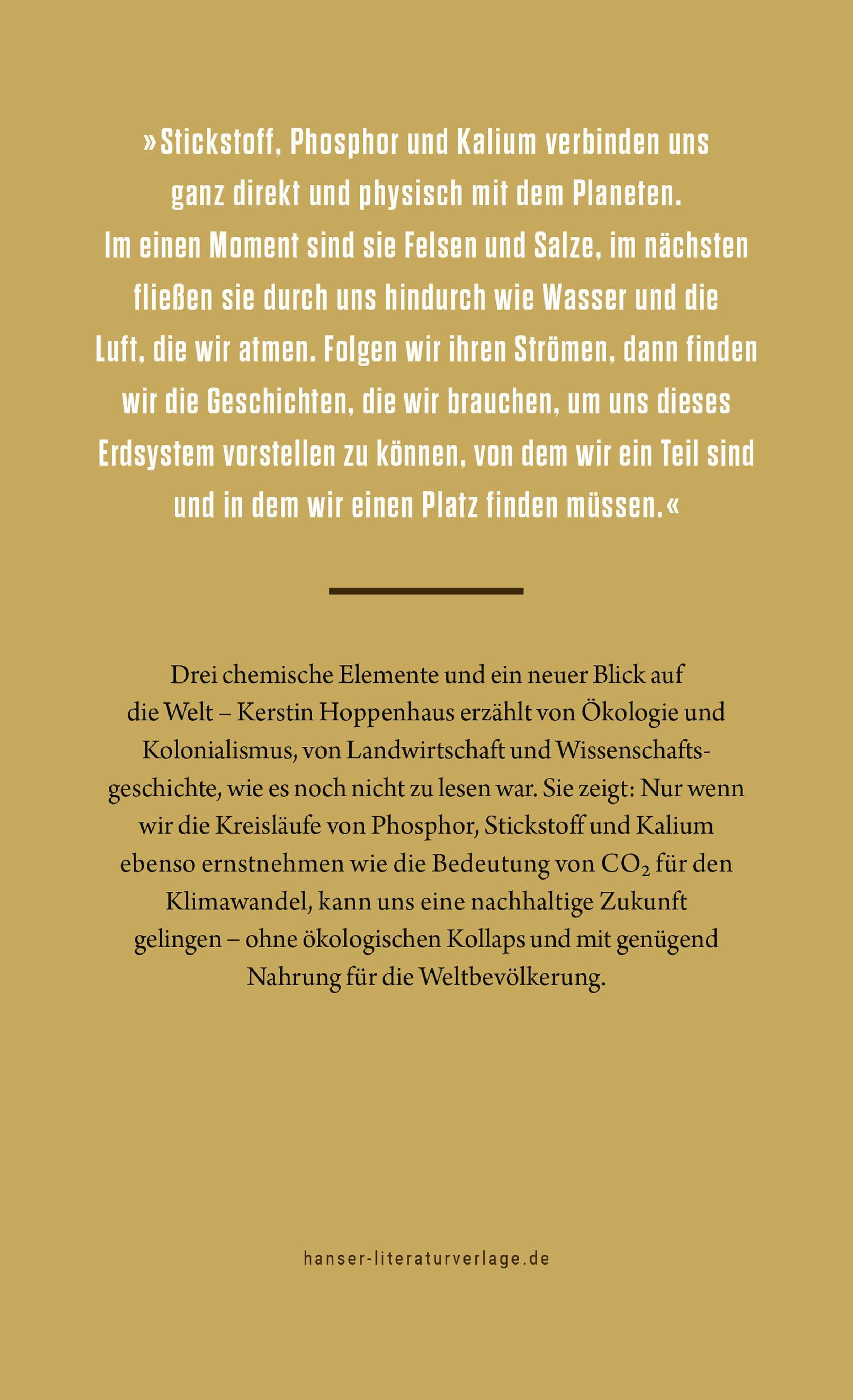 Unsere Existenz hängt am Kreislauf der Elemente. Stickstoff, Phosphor und Kalium sind drei der wichtigsten. Doch wir haben ihre Ströme gestört und gefährden so die globalen Lebensgrundlagen. Was hat es mit diesen Stoffen auf sich, über die wir so wenig wissen? Auf der Suche nach Antworten folgt die Biologin Kerstin Hoppenhaus den Elementen - um die Welt und durch die Zeit, von der einzelnen Zelle bis zum Ökosystem, vom überdüngten Acker bis in die Politik. Sie zeigt: Die Geschichte der drei Elemente ist zugleich eine von industriellem Fortschritt und ökologischer Kurzsichtigkeit, von Kolonialismus und weltweiten Vernetzungen. Ein faszinierender Einblick in ungeahnte Zusammenhänge, ohne deren Verständnis eine nachhaltige Zukunft nicht möglich ist.