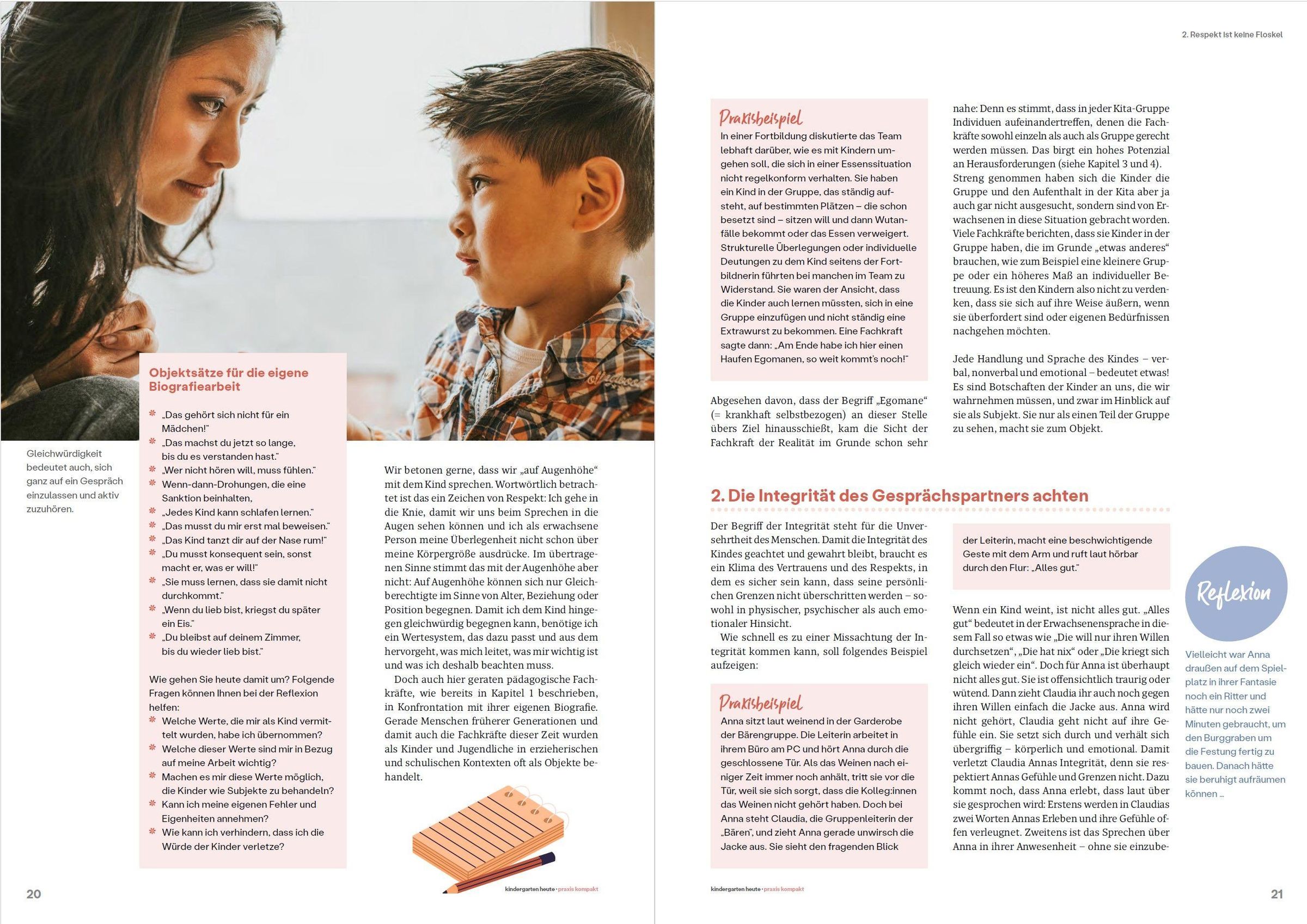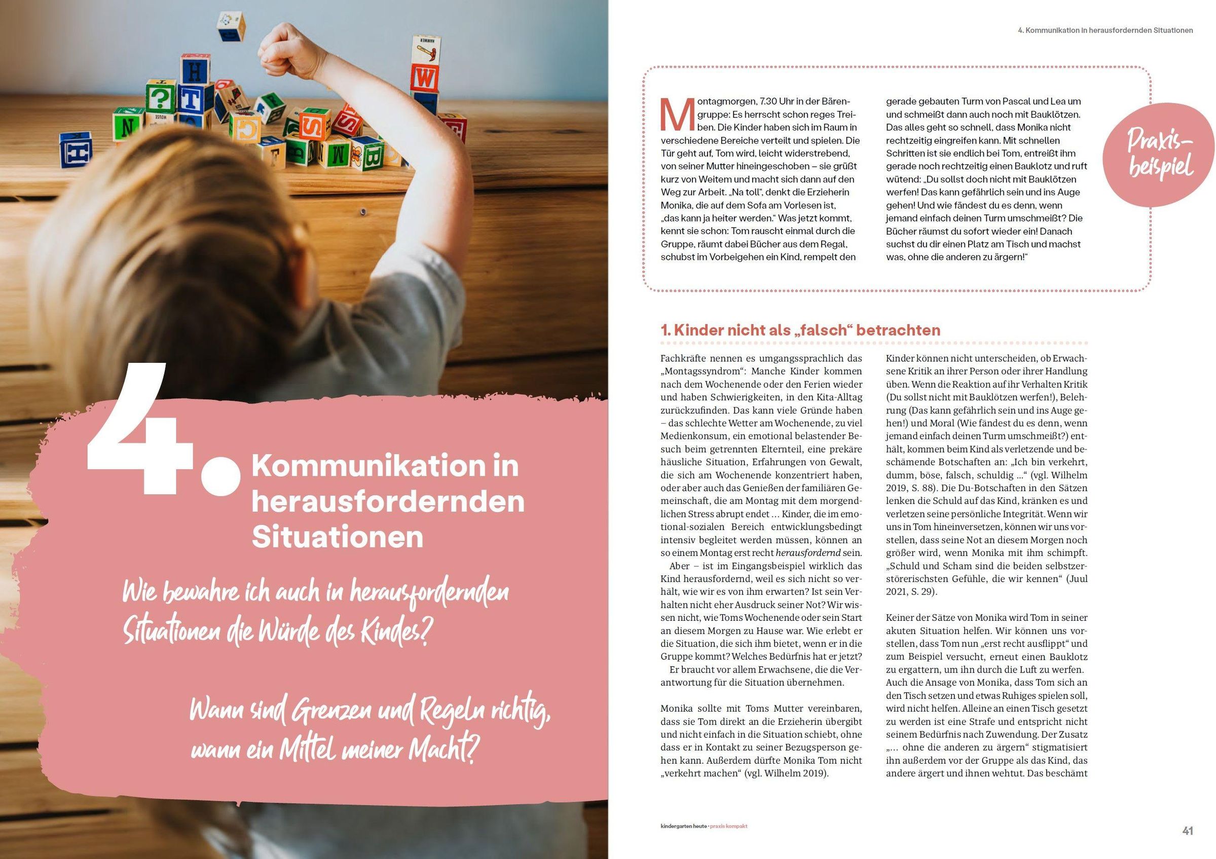 Mit Kindern achtsam zu kommunizieren basiert auf einer Haltung von Respekt, Achtung und Wohlwollen ihnen gegenüber. Eine feinfühlige Sprache schafft Beziehung, ermöglicht authentischen Dialog und unterstützt kindliche Bildungs- und Lernprozesse. Deshalb ist sie der Dreh- und Angelpunkt jeglichen pädagogischen Handelns. Um entsprechend kommunizieren zu können, sollten sich Fachkräfte immer auch mit der eigenen Biografie auseinandersetzen, prägt diese doch unsere innere Haltung und Glaubenssätze. Neben vielen Infos zu den Grundlagen einer achtsamen Kommunikation, lädt dieses Sonderheft mit einer großen Methodenvielfalt zur Selbst- und Teamreflexion ein. Darüber hinaus befasst sich die Autorin anhand zahlreicher Praxisbeispiele mit Sprachentwicklung und Sprachstrategien für bestimmte Altersgruppen sowie mit sprachlichen Zugängen zu ängstlichen, schüchternen, traumatisierten oder wütenden Kindern.
