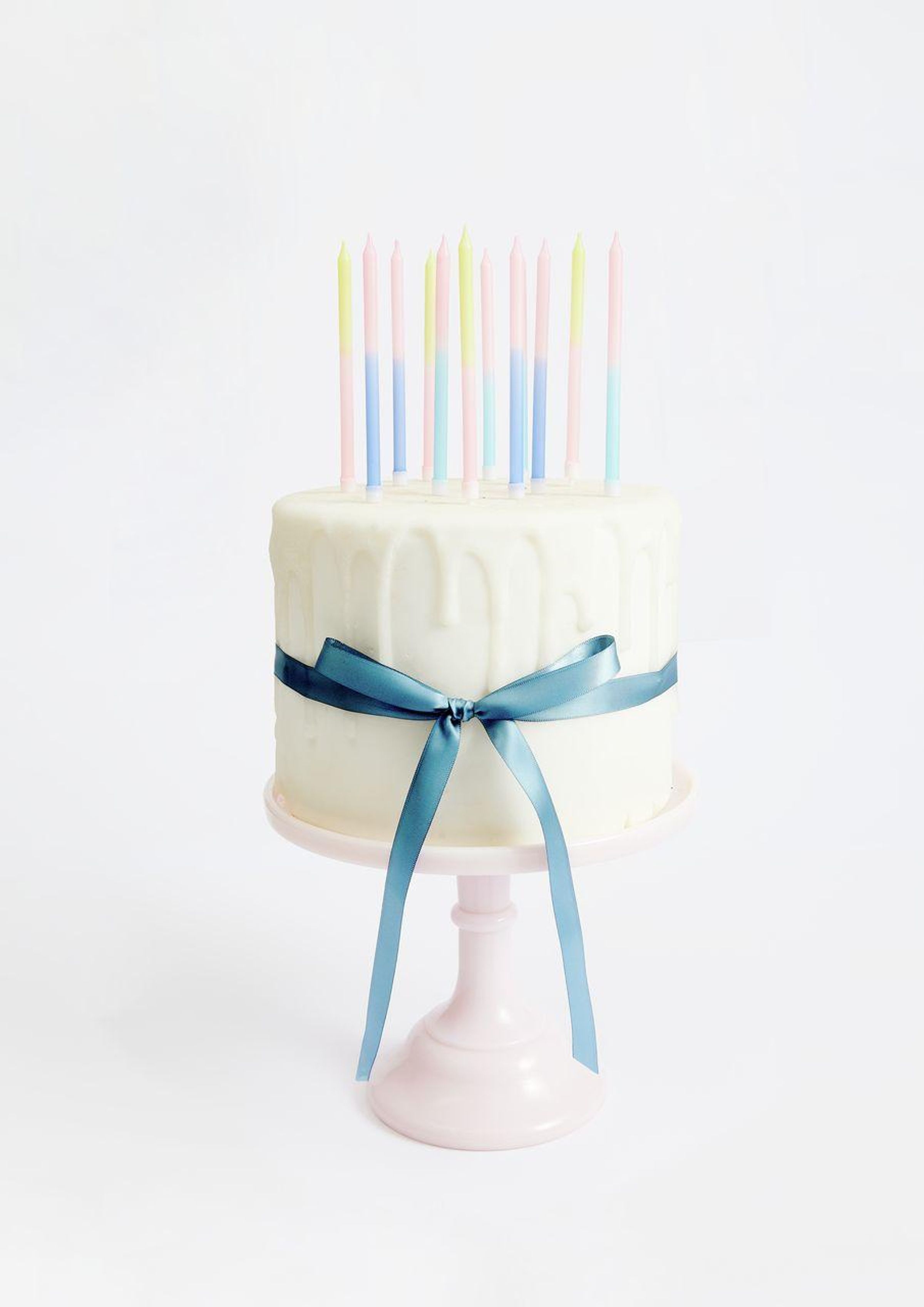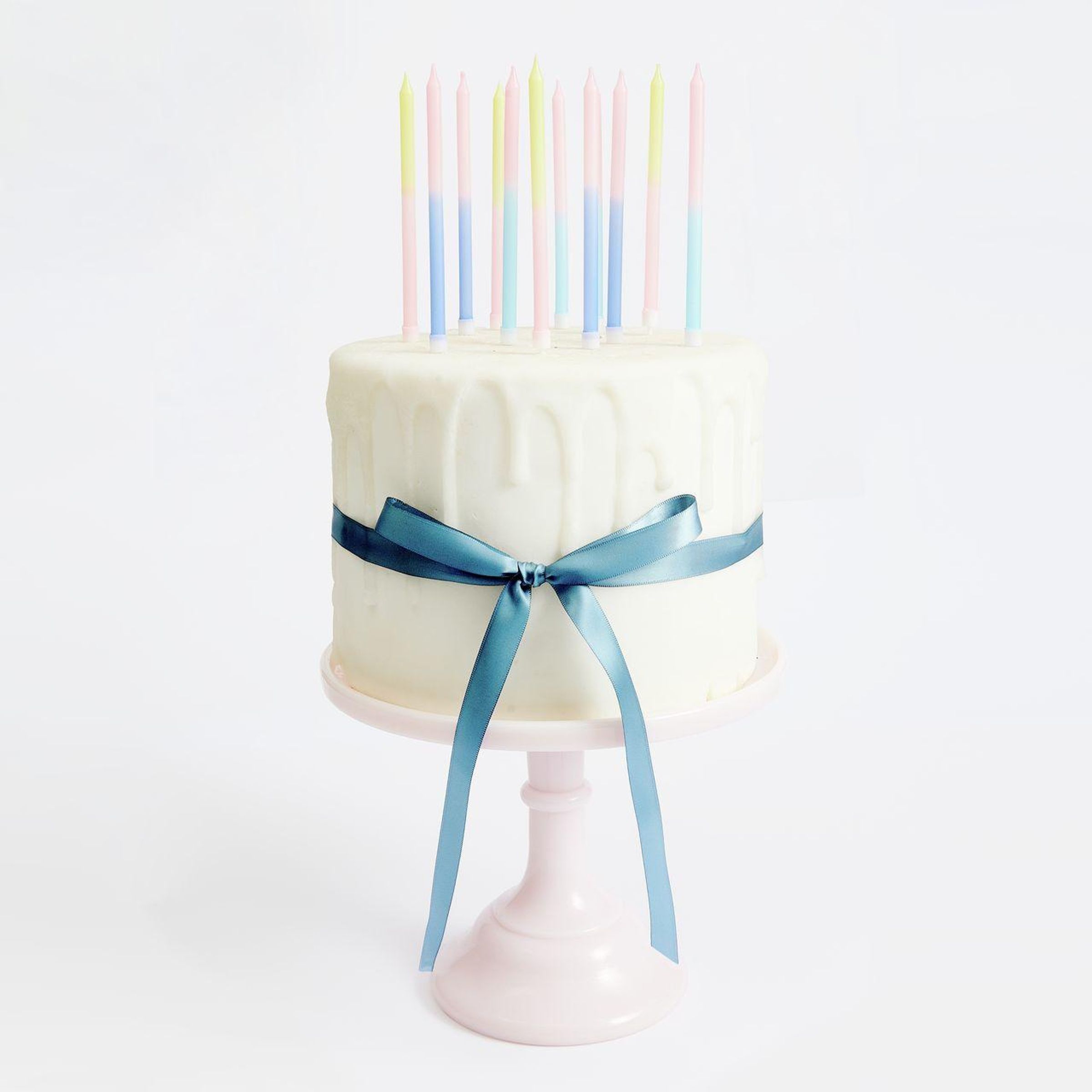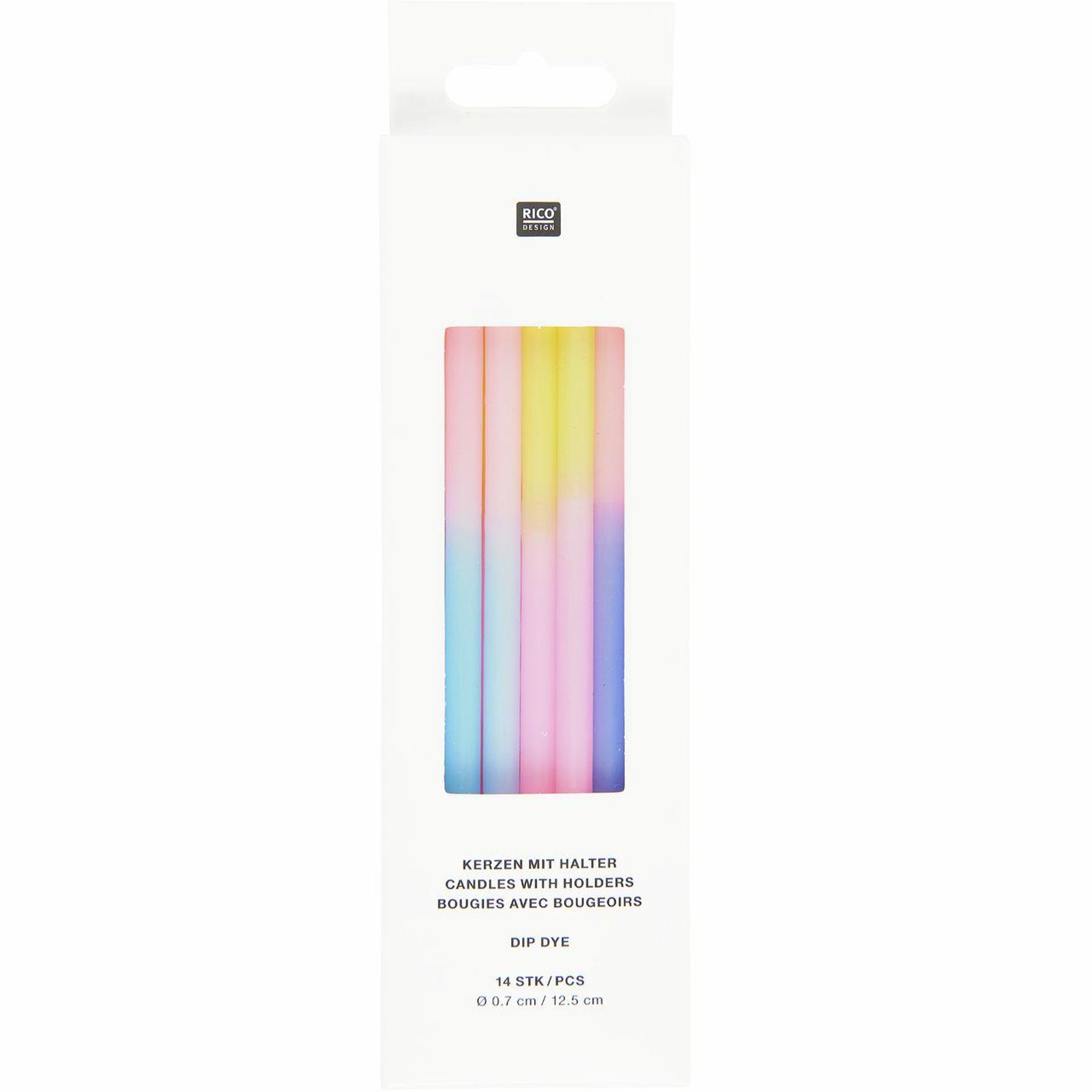 Die Dip-Dye-Kerzen in Blau, Pink und Gelb zeichnen sich durch ihren farbenfrohen Farbverlauf und ihre sorgfältige Verarbeitung aus. Jede Kerze ist mit einem lebensmittelechten Kerzenhalter aus Polypropylen versehen, der direkt an der Kerze fixiert ist. Die Verpackung ist vollständig plastikfrei, was das Set zu einer nachhaltigen und zugleich dekorativen Wahl macht.