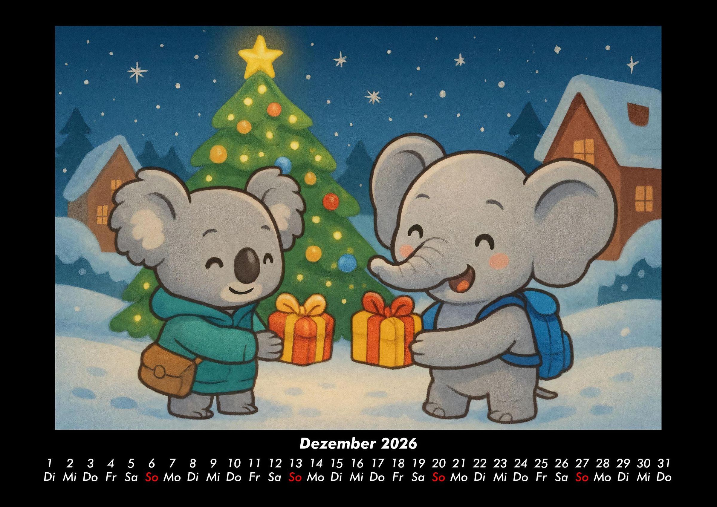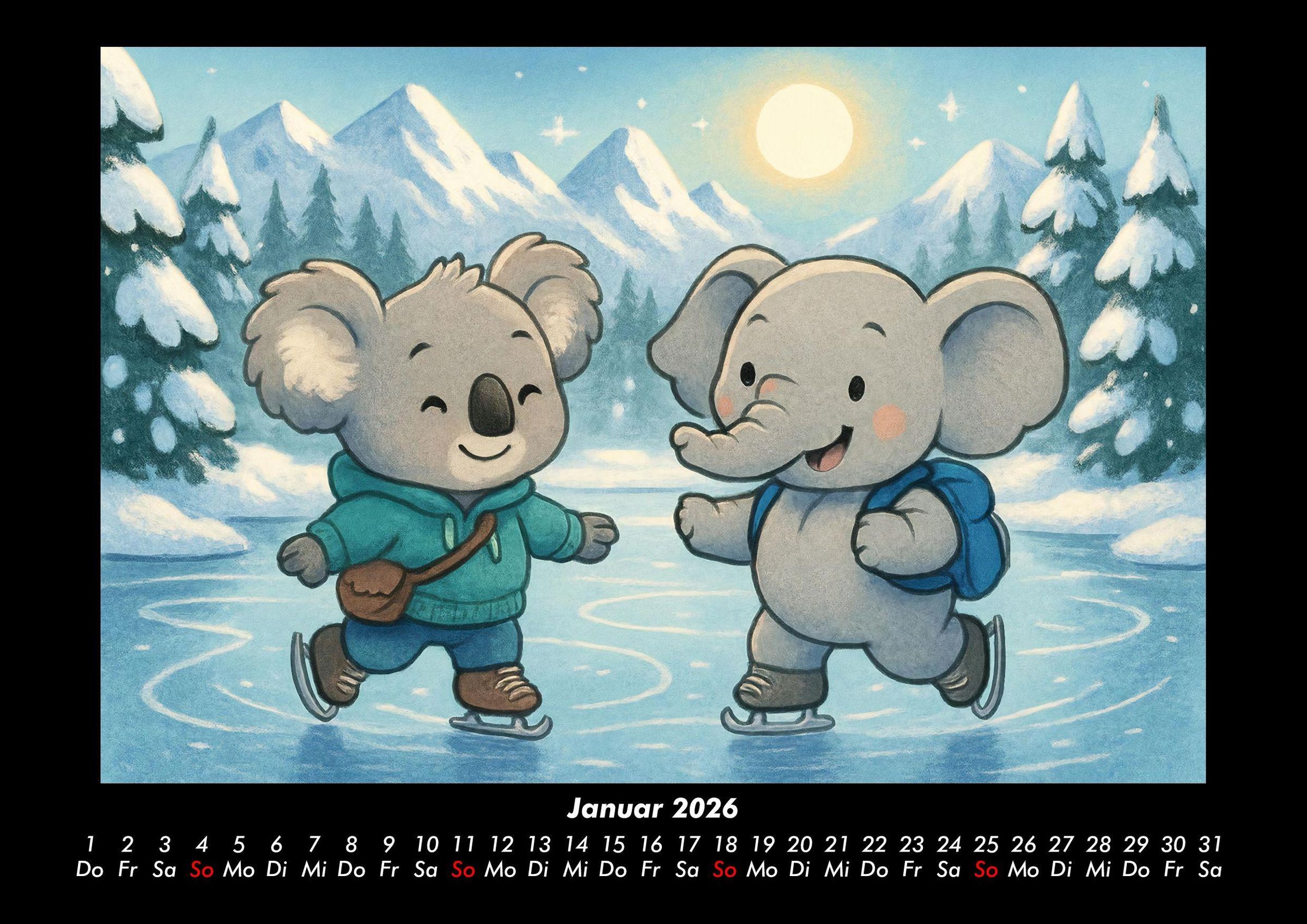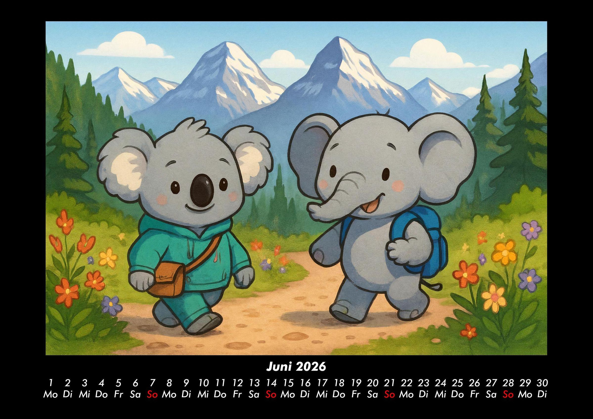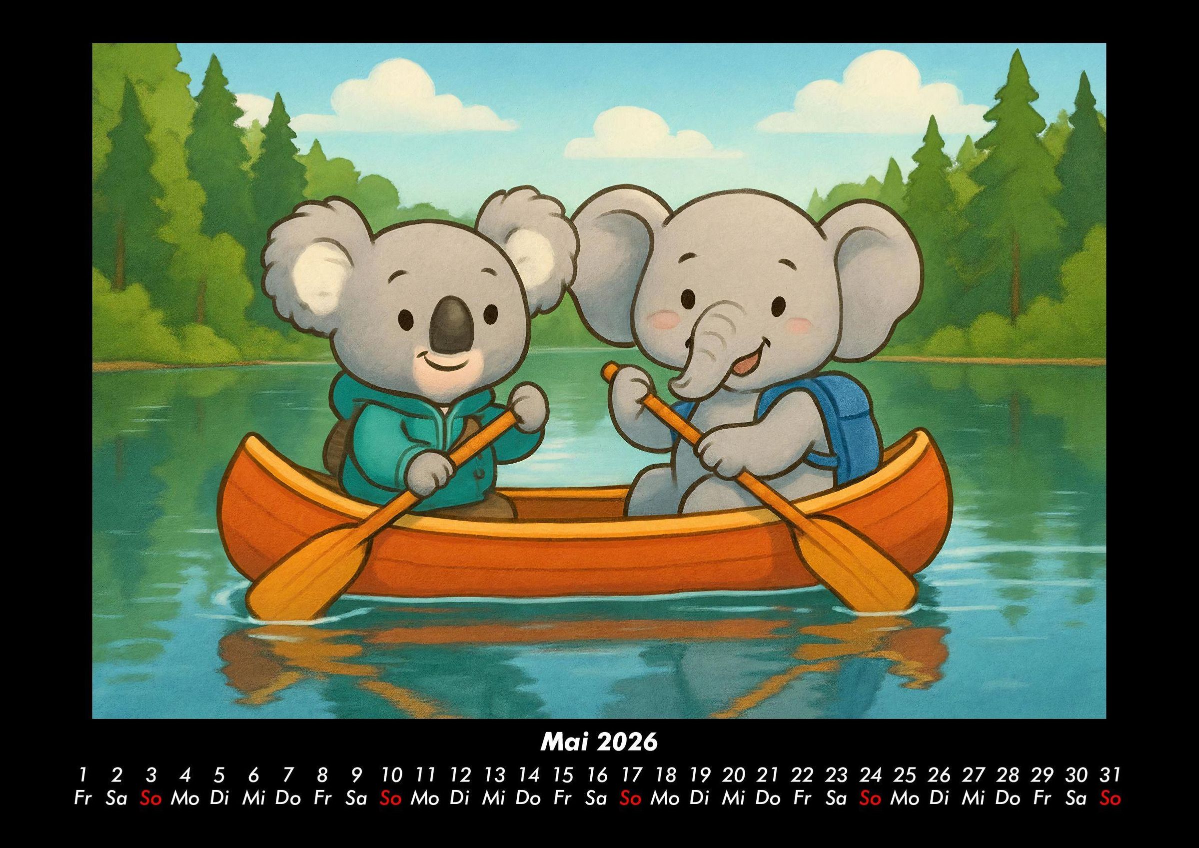 - Monatskalender mit Kinder-Motiven von Tieren, Reisen, Freundschaft und Abenteuern