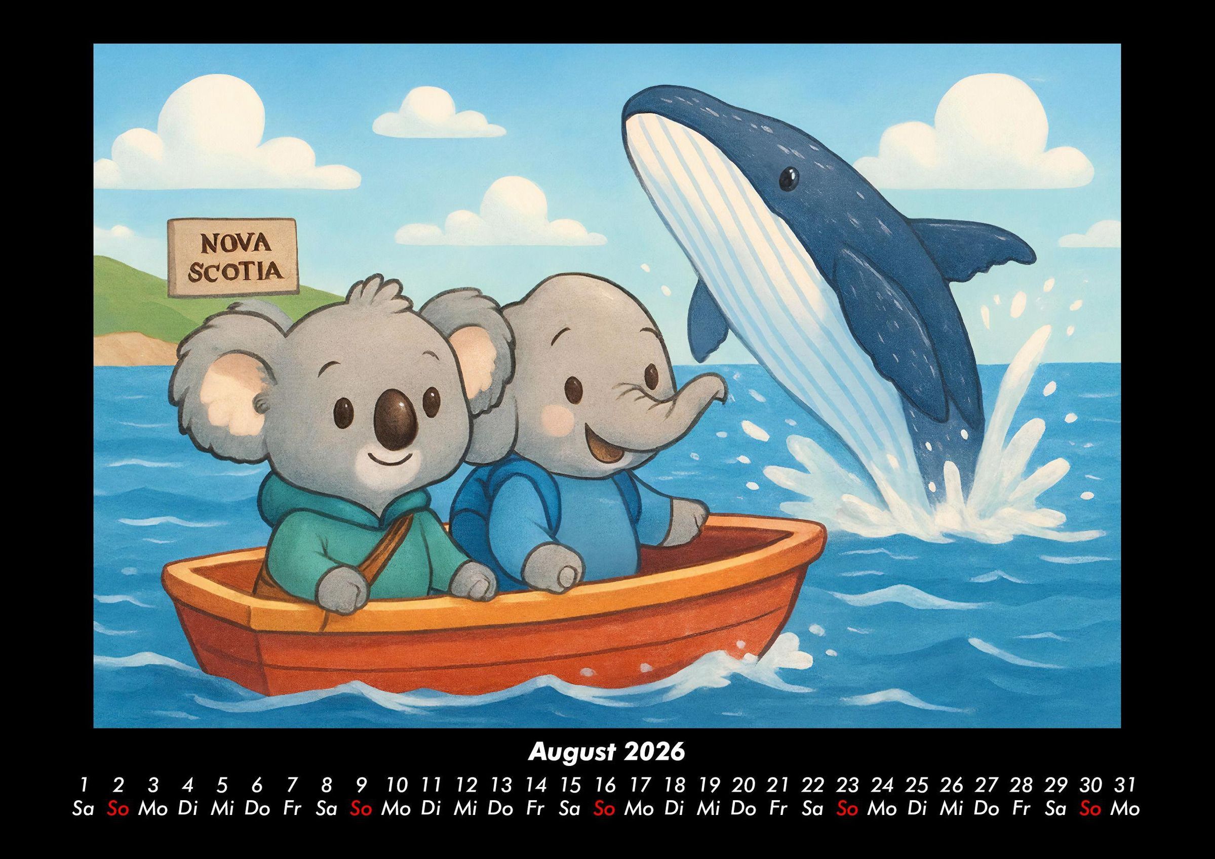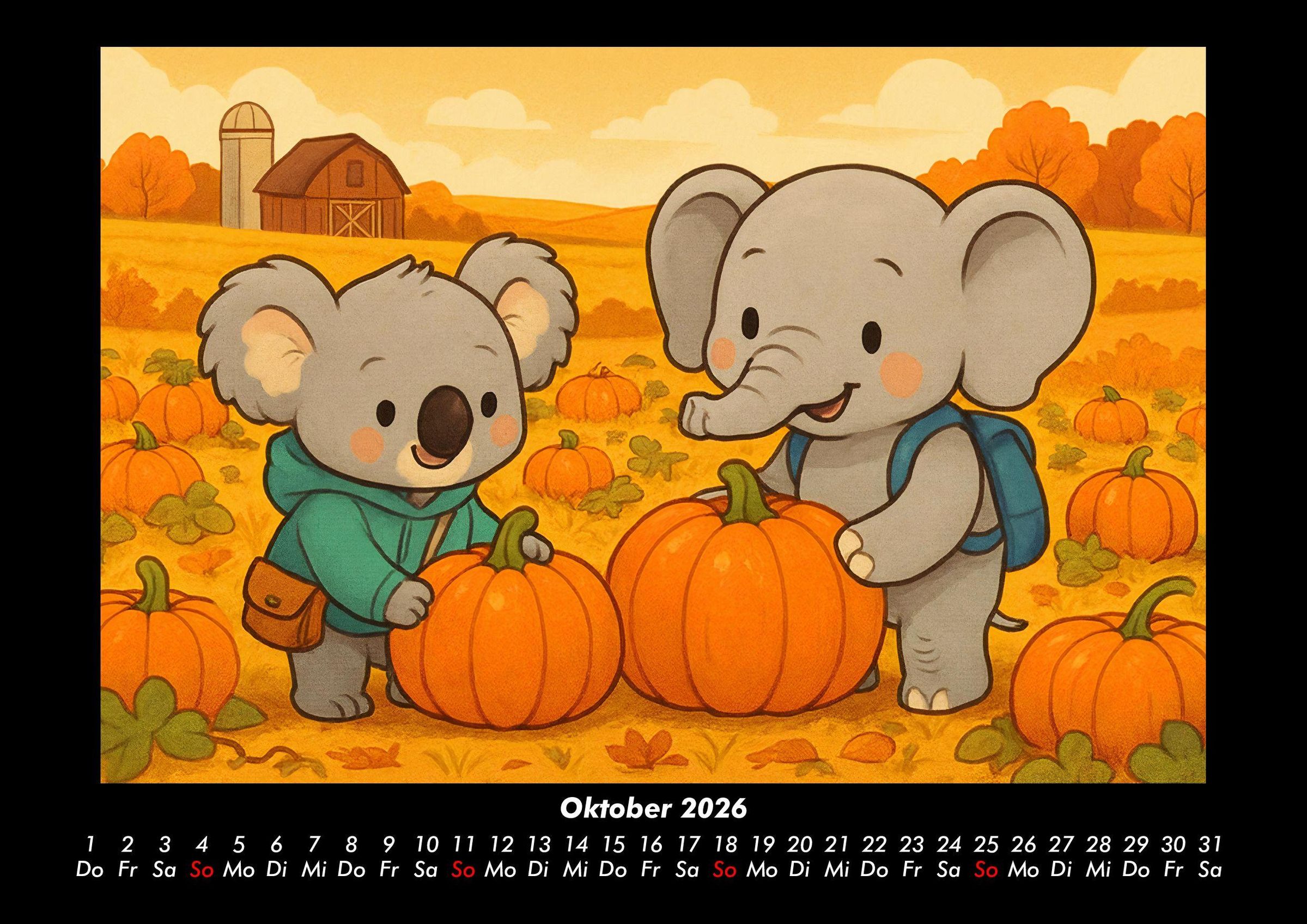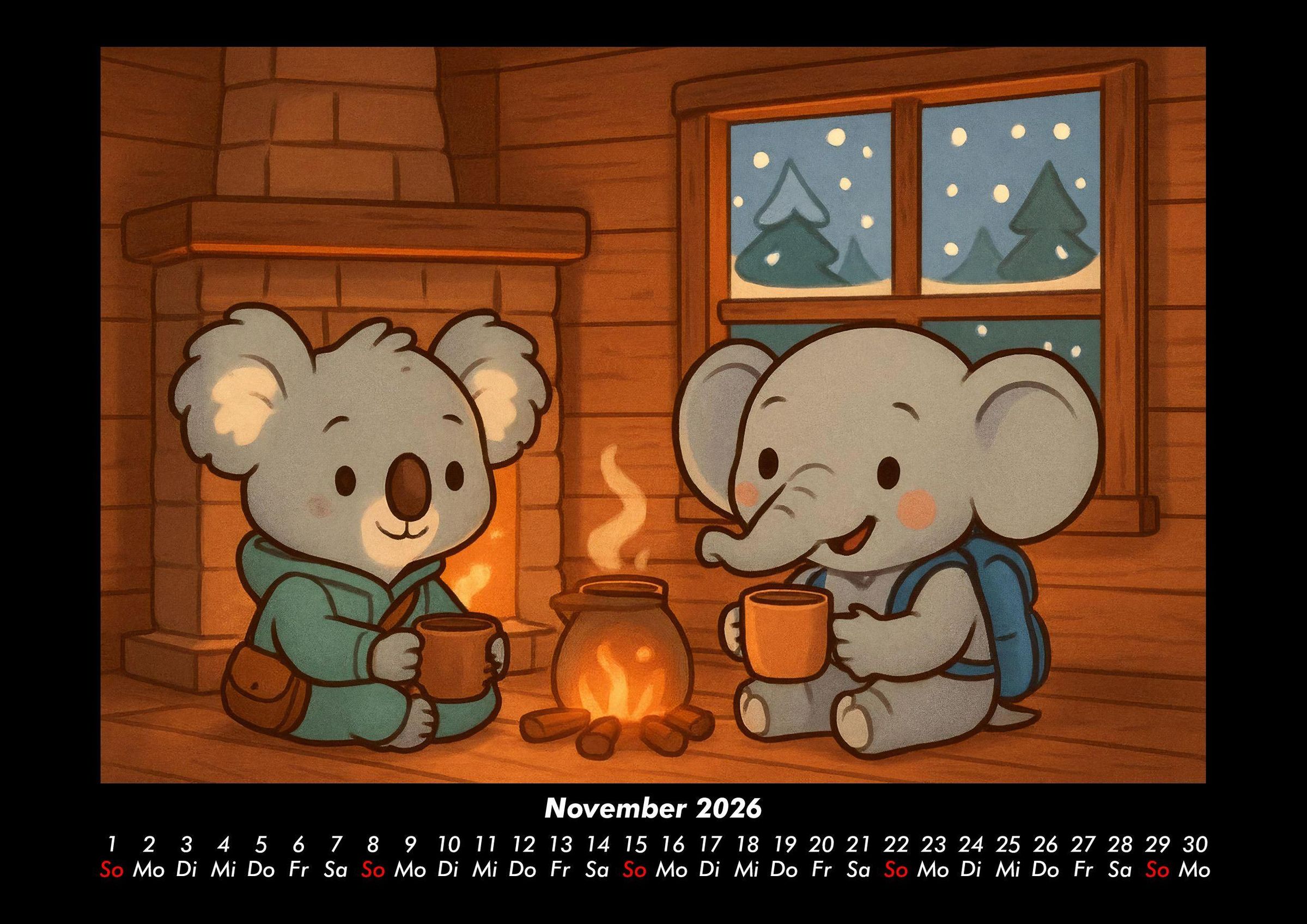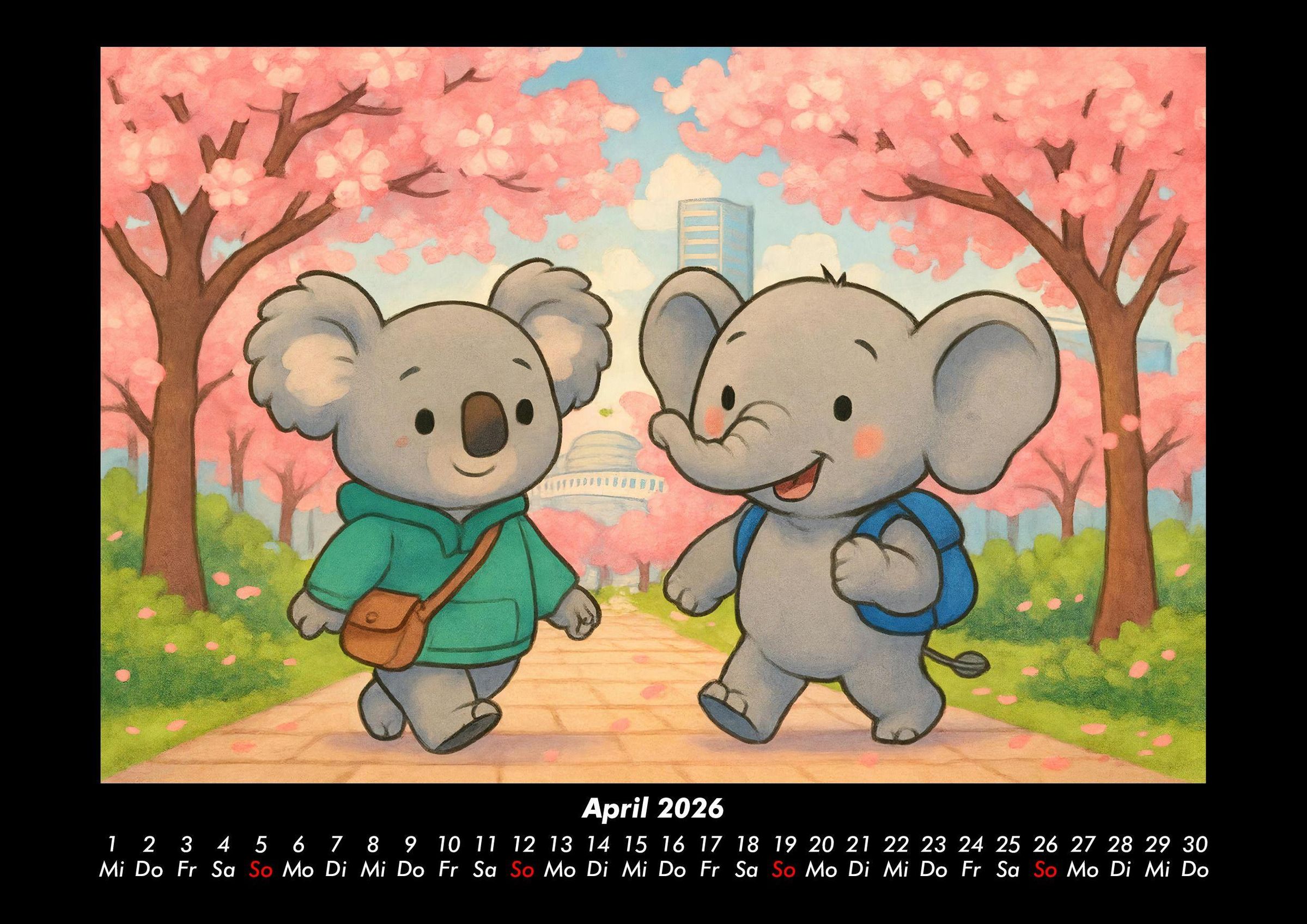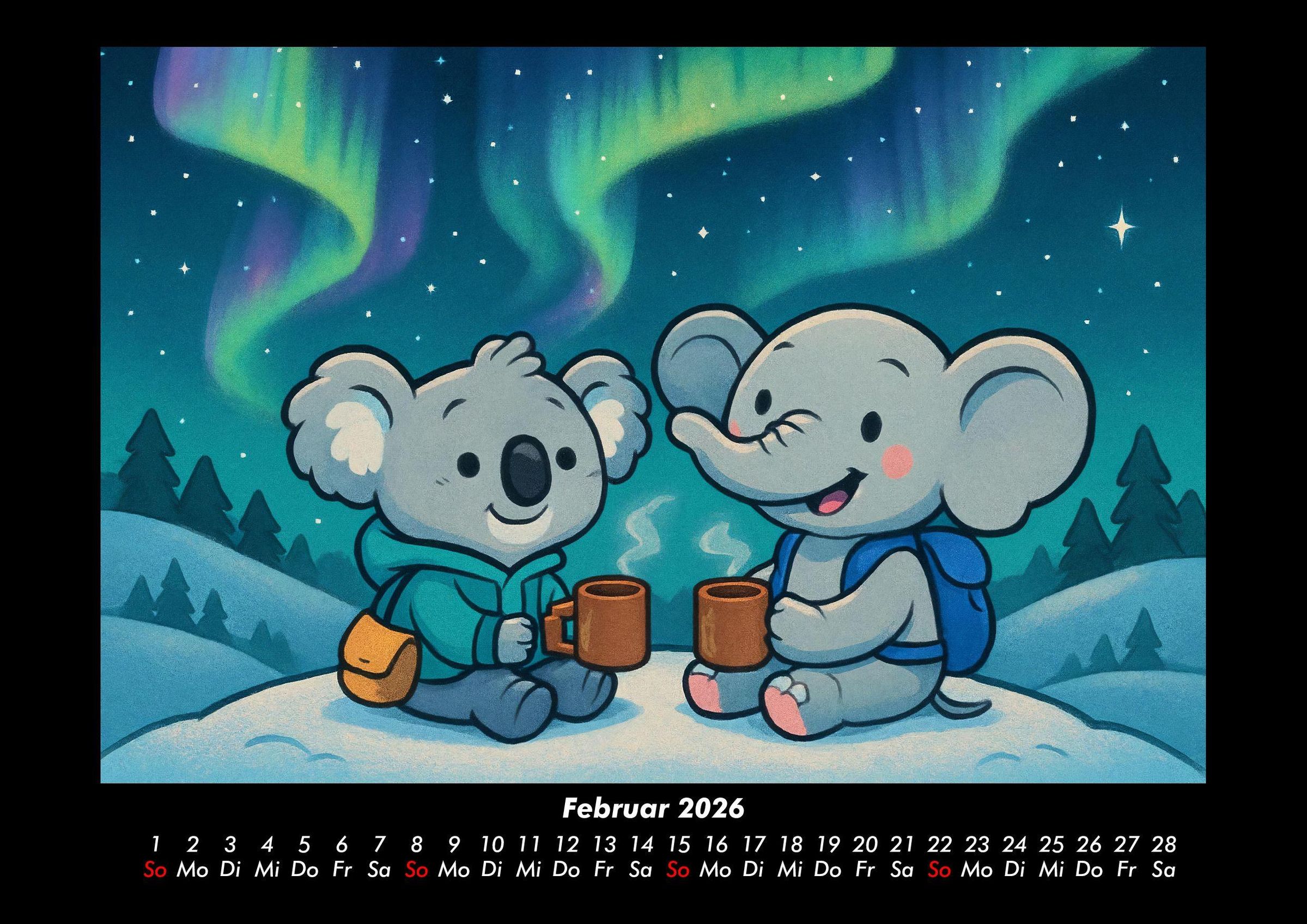 - Monatskalender mit Kinder-Motiven von Tieren, Reisen, Freundschaft und Abenteuern