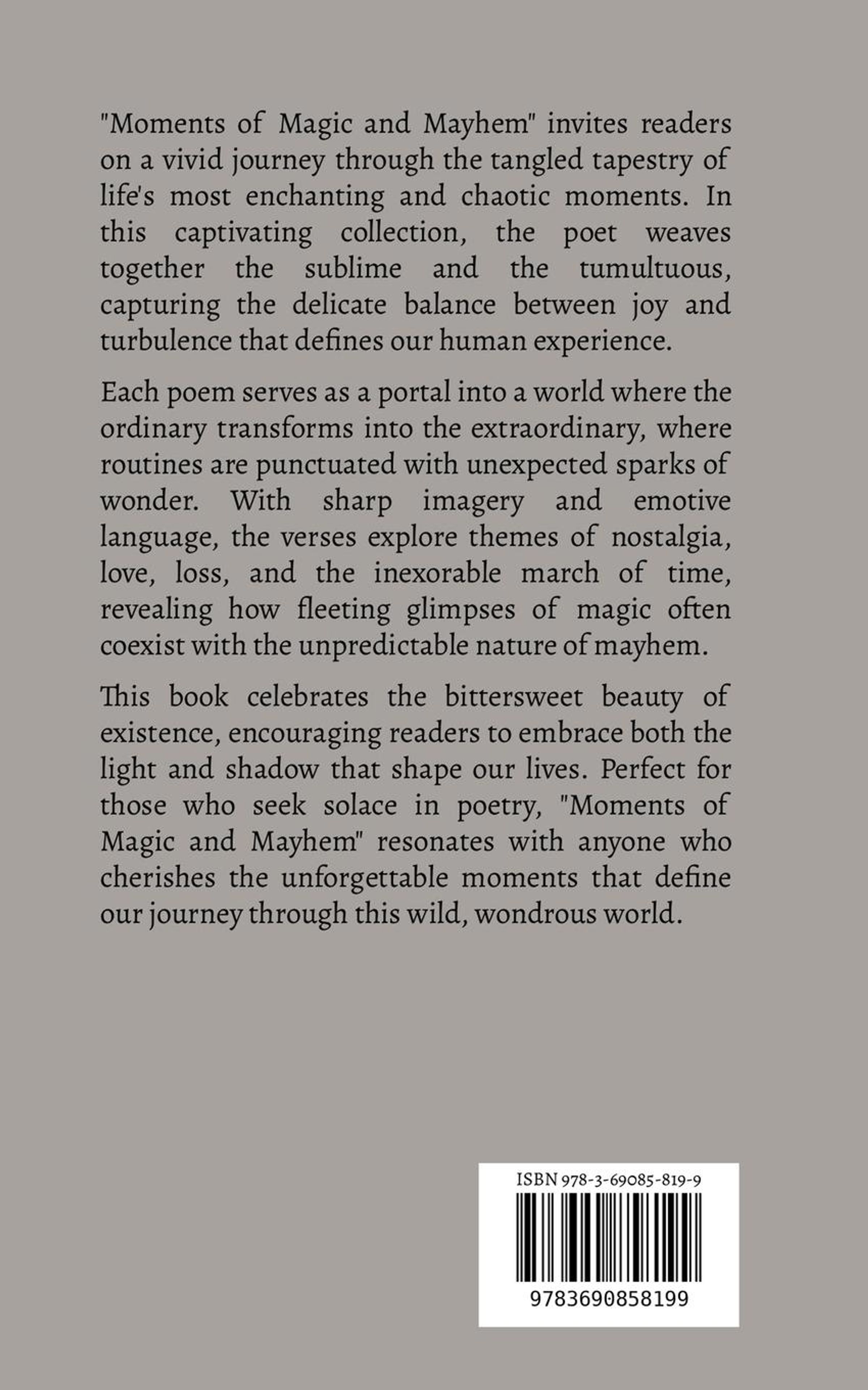 "Moments of Magic and Mayhem" invites readers on a vivid journey through the tangled tapestry of life's most enchanting and chaotic moments. In this captivating collection, the poet weaves together the sublime and the tumultuous, capturing the delicate balance between joy and turbulence that defines our human experience. Each poem serves as a portal into a world where the ordinary transforms into the extraordinary, where routines are punctuated with unexpected sparks of wonder. With sharp imagery and emotive language, the verses explore themes of nostalgia, love, loss, and the inexorable march of time, revealing how fleeting glimpses of magic often coexist with the unpredictable nature of mayhem. This book celebrates the bittersweet beauty of existence, encouraging readers to embrace both the light and shadow that shape our lives. Perfect for those who seek solace in poetry, "Moments of Magic and Mayhem" resonates with anyone who cherishes the unforgettable moments that define our journey through this wild, wondrous world.
