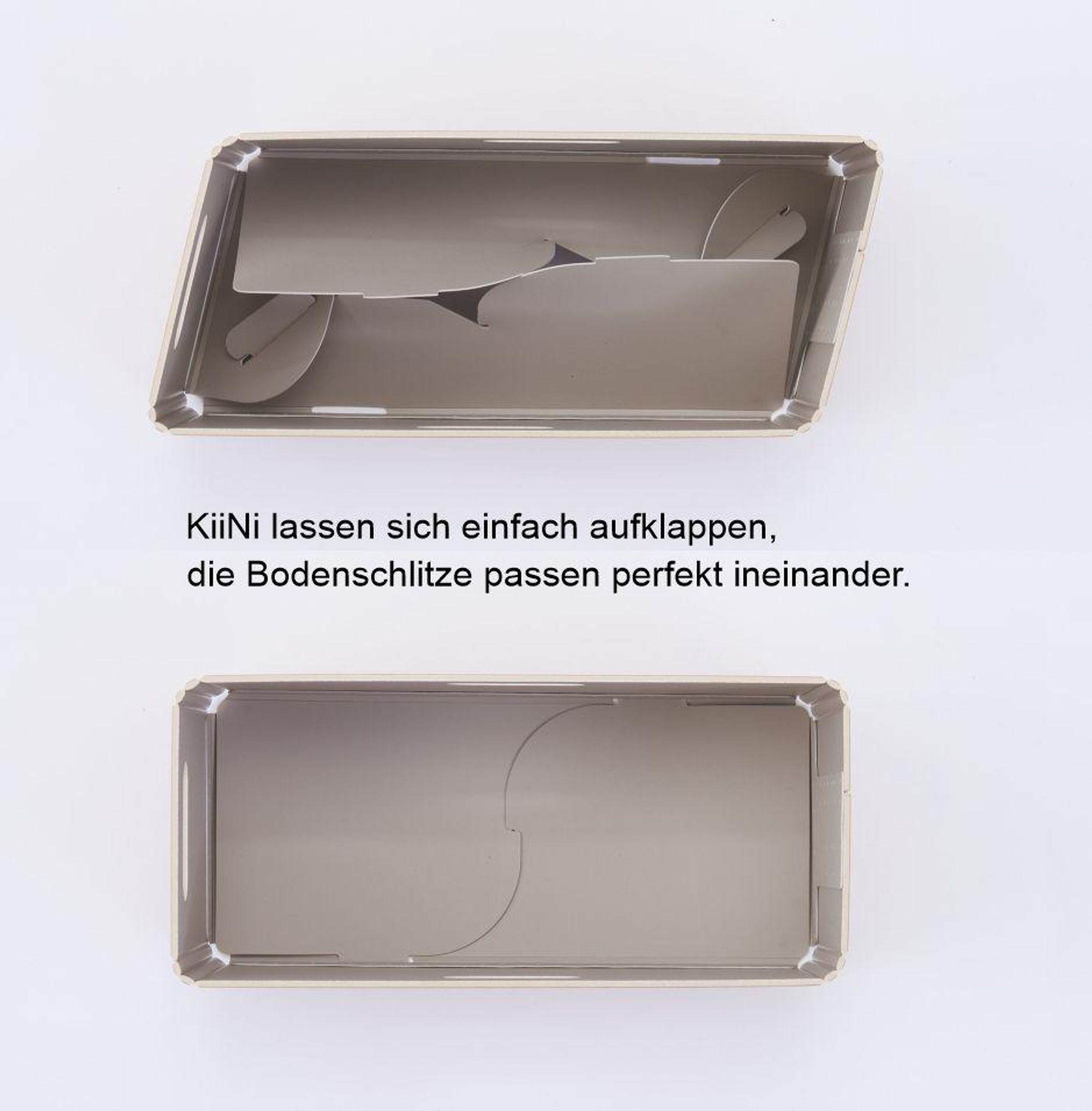 Die KiiNi Boxen aus Japan vereinen intelligentes Design mit moderner Materialtechnologie. Sie lassen sich im Handumdrehen aufbauen und bei Nichtgebrauch flach zusammenklappen - ideal für flexible Ordnungssysteme. Das geschäumte Polypropylen (PP) macht die Boxen besonders leicht, zugleich stabil, langlebig und pflegeleicht. Durch ihre abwaschbare Oberfläche eignen sich die KiiNi Boxen perfekt für den Einsatz in Bad, Küche oder Wohnraum. Praktisch, vielseitig und formschön - ein Stück japanischer Alltagseleganz. KiiNi Box S LONG Stehsammler Maße (BxTxH): 12 × 26, 5 × 25 cm Flach (BxTxH): 25 × 1, 6 × 37 cm
