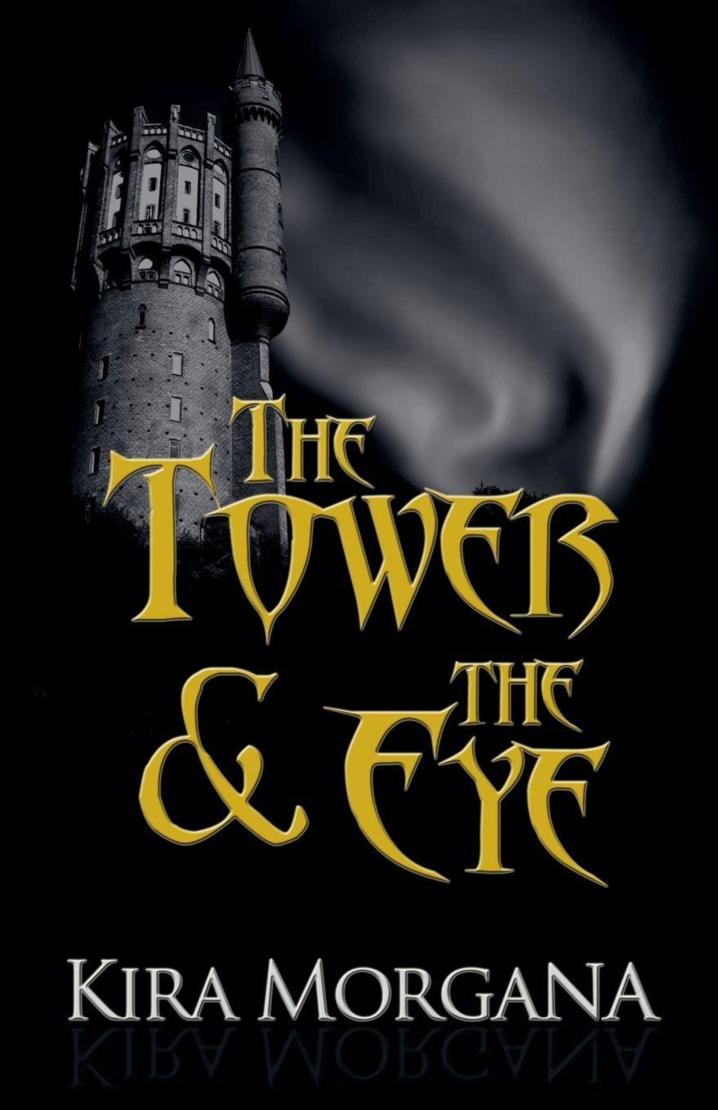 Text: "The Tower & The Eye" und "Kira Morgana". Dunkler Turm vor einem stürmischen Himmel, gotische Gestaltung., Buch