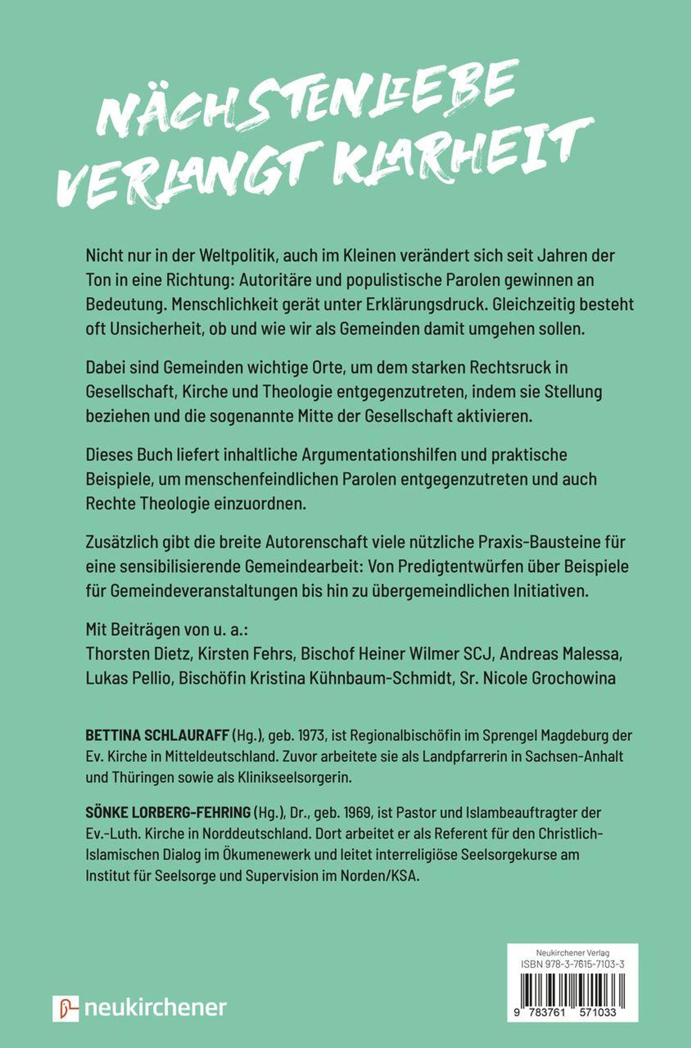 Gemeinden sind wichtige Orte, um dem zunehmenden Rechtsruck in Gesellschaft, Kirche und Theologie entgegenzutreten. Ihnen kommt hierbei eine doppelte Verantwortung zu, bei der dieses Praxisbuch sie unterstützt: Zum einen können Gemeinden zu Orten des aktiven Widerstands gegen menschenfeindliche Positionen und Parolen werden. Dafür liefert dieses Buch inhaltliche Argumentationshilfen und praktische Beispiele. Außerdem breitet Rechte Theologie sich auch im kirchlichen Mainstream aus. Deshalb bietet das Buch historische Erklärungen und theologische Einordnungen. Zusätzlich gibt die breite Autorenschaft viele nützliche Praxis-Bausteine für eine sensibilisierende Gemeindearbeit: Von Predigtentwürfen über Beispiele für Gemeindeveranstaltungen bis hin zu übergemeindlichen Initiativen.