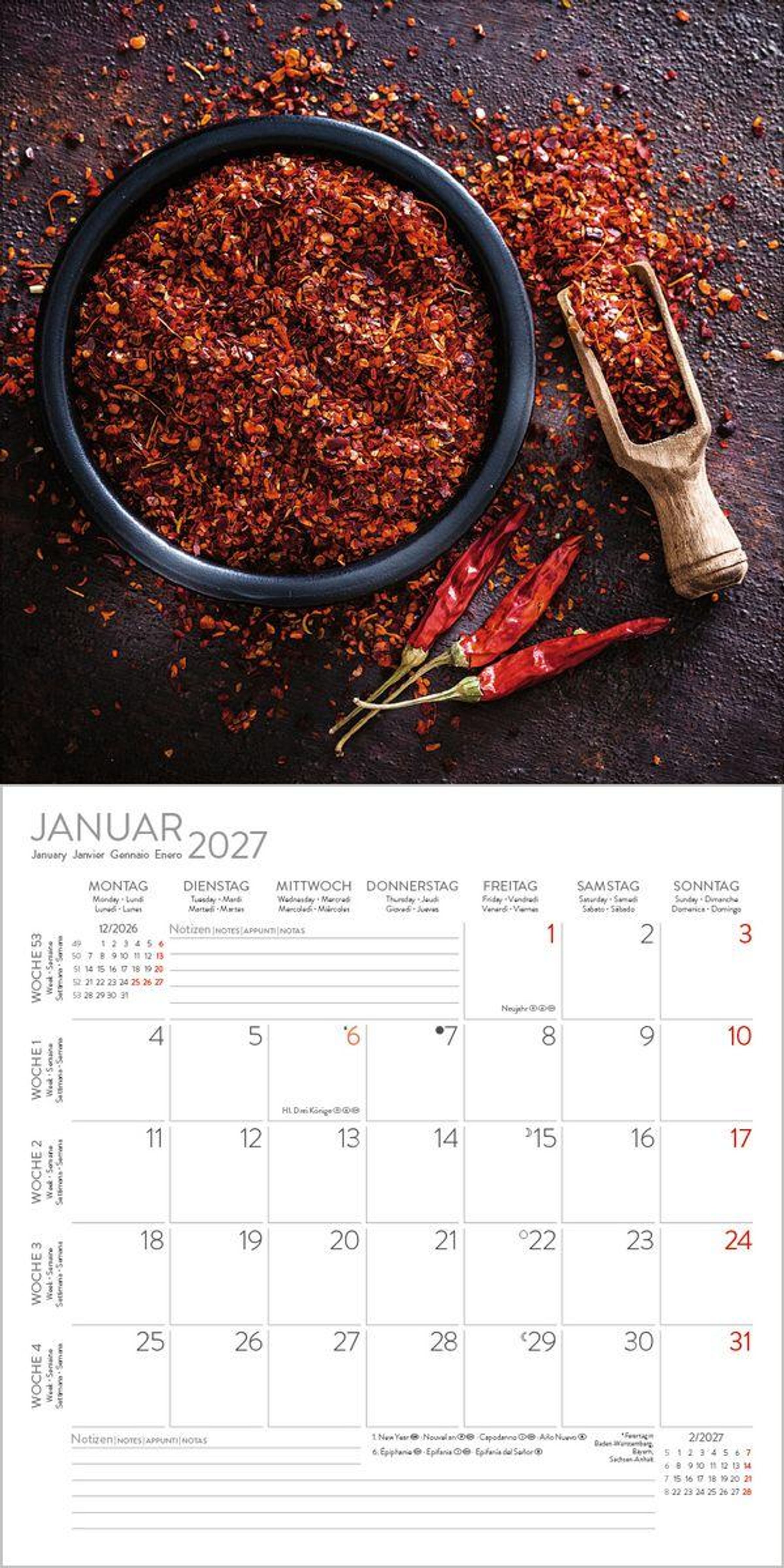 Hochwertig und ohne Plastikfolie verpackt Wandkalender im Format: 30 x 30 cm; Offenes Format: 30 x 60 cm; umweltfreundliches FSC Papier Jede Kalenderseite mit großem Bild und viel Platz im Kalendarium für Notizen und Termine Mehrsprachiges Kalendarium: DE/GB/FR/IT/ES mit Feiertagen für D/A/CH/GB/FR/IT/ES Regionale Ferienzeiten für DE/A/CH Monatsübersicht für den jeweiligen Vor- und Nachmonat; Jahresübersicht