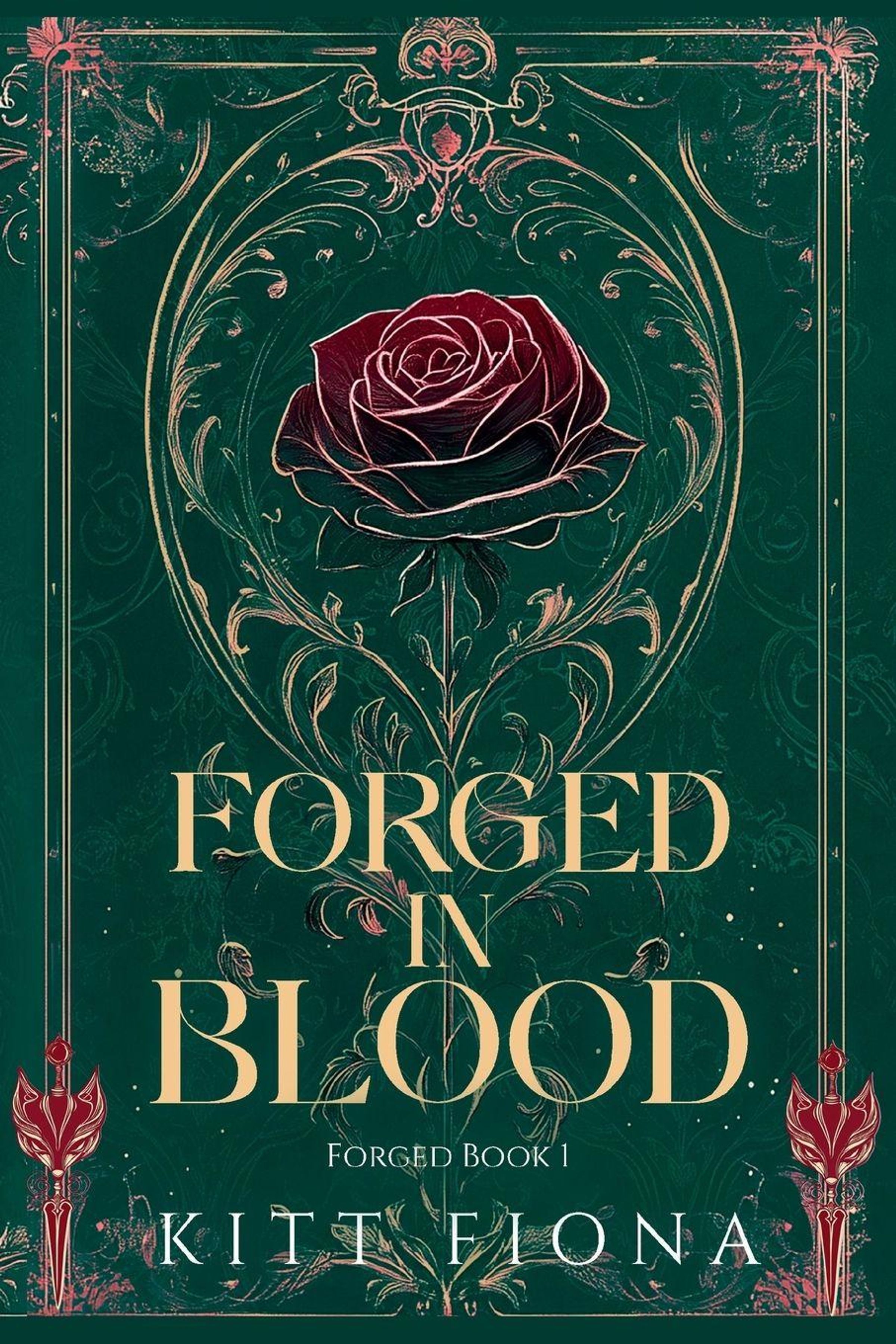 „FORGED IN BLOOD“ steht in goldener Schrift auf einem dunkelgrünen Hintergrund mit floralen Verzierungen und einer roten Rose., Buch