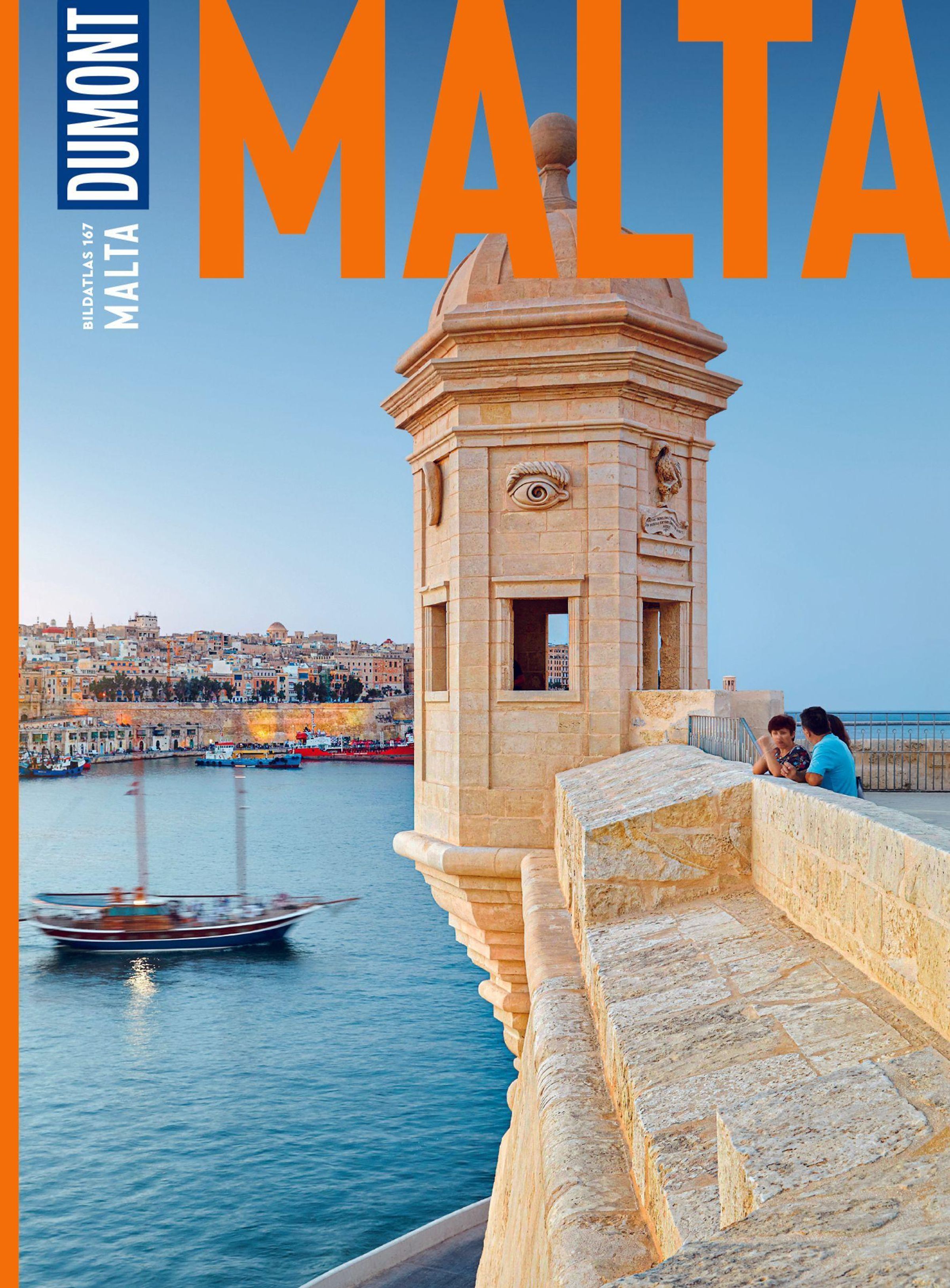„MALTA, DUMONT, Bildatlas 167“. Ein historischer Wachturm überblickt das Meer, mit einer Stadt im Hintergrund., Buch