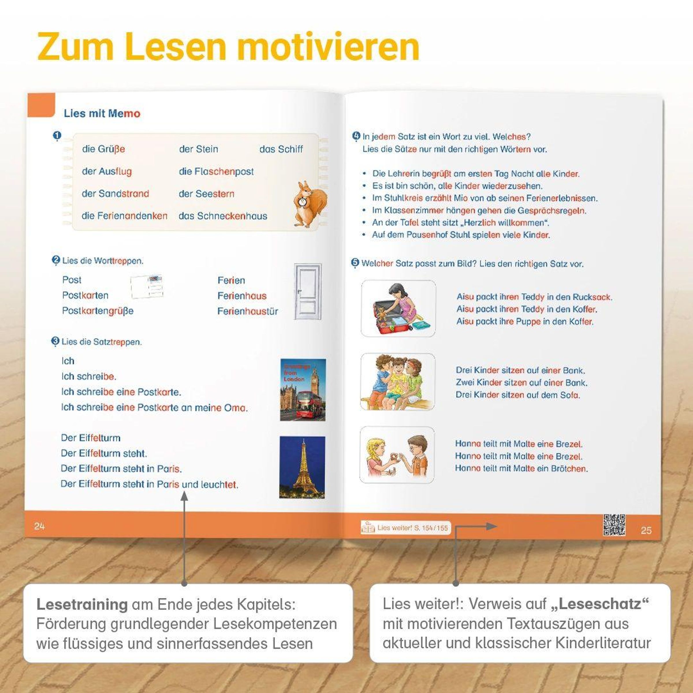 Eine größere Schrift, ein vereinfachter Wortschatz sowie ein reduzierter Textumfang bieten vor allem Kindern mit erhöhtem Übungsbedarf Unterstützung und Motivation beim Lesen. Lesegeübte Kinder kommen dabei nicht zu kurz: Eine kleinere Schrift und längere Textpassagen mit größerem Wortschatz motivieren zum flüssigen und genauen Lesen. Kompetenzorientierte Aufgaben direkt unterhalb der Lesetexte sichern das Leseverständnis. Darüber hinaus hält der themenorientierte "Leseschatz" mit Auszügen aus aktueller und klassischer Kinderliteratur ergänzendes (Vor-)Lesefutter bereit.