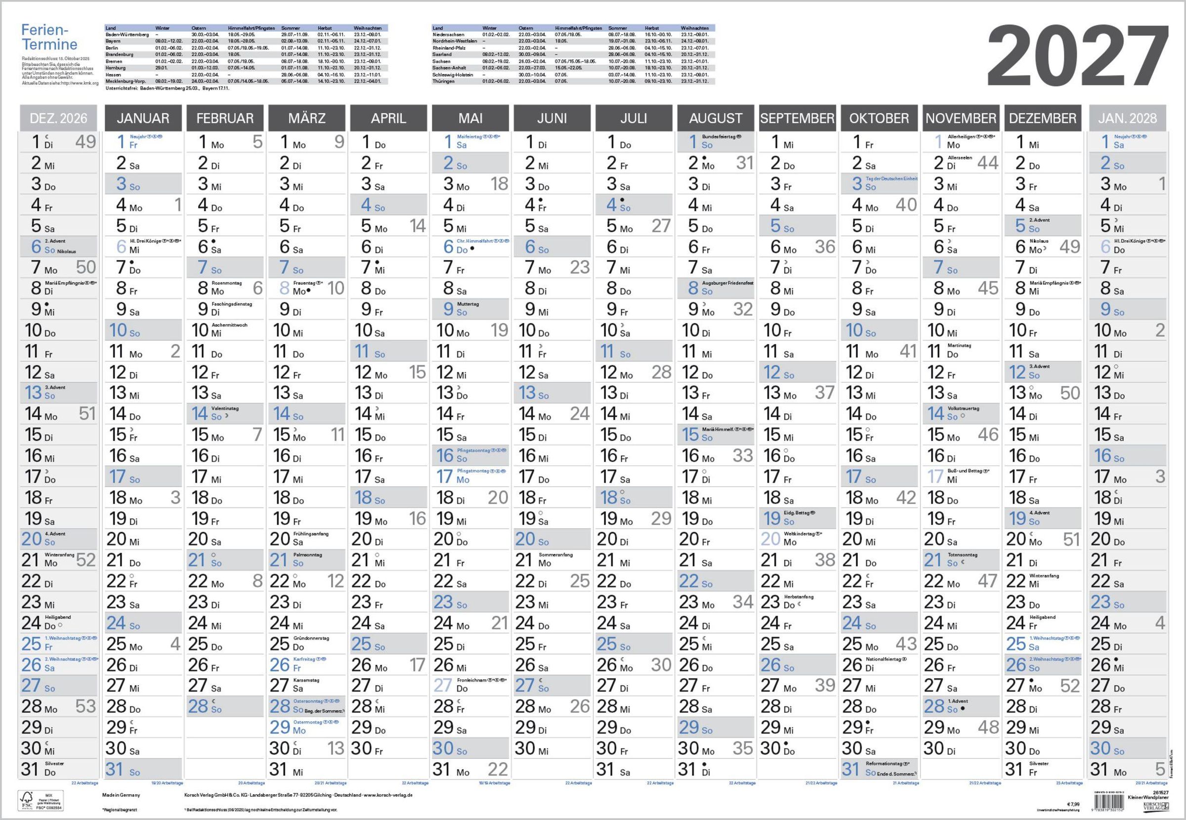 - 14 Monate (Dezember 2026 - Januar 2028) / Ferientermine und Feiertage / 68 x 47 cm