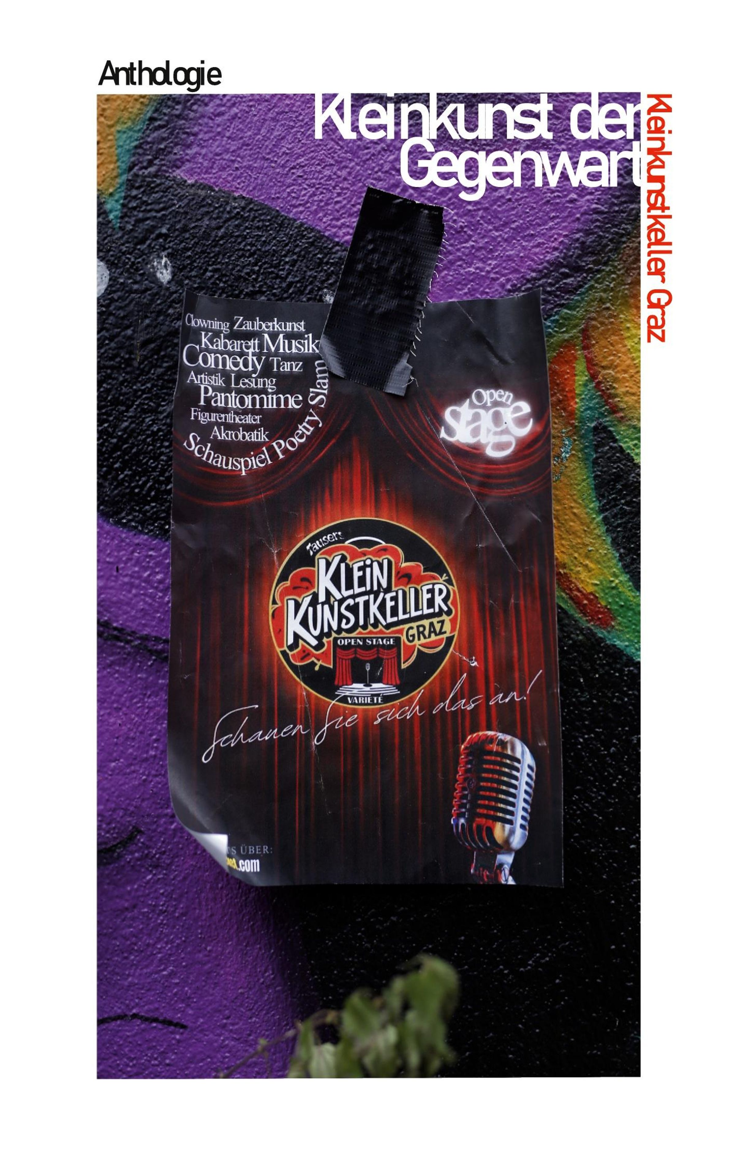 „Anthologie“, „Kleinkunst der Gegenwart“, „Kleinkunstkeller Graz“. Plakat mit Mikrofon und Bühne auf bunter Wand., Buch